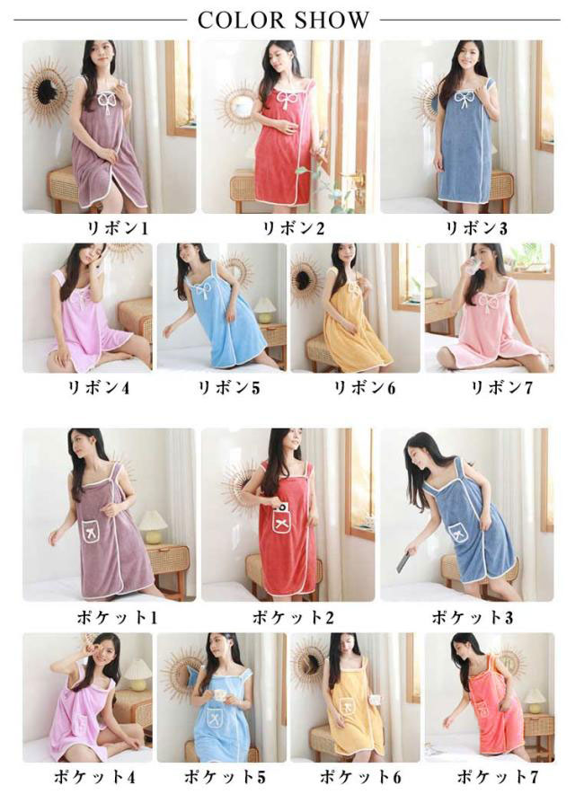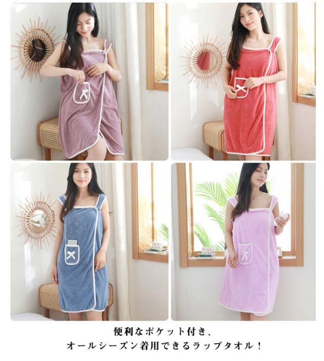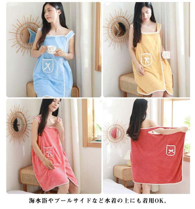 | 巻きタイプのマイクロファイバー素材のバスタオルです。 着た時にふわふわ柔らかな気持ちの良い優しい肌触りが楽しめます。 吸水性抜群なので、お風呂上りにさっと着れば湯冷め防止にも活躍します。 便利なポケット付き、オールシーズン着用できるラップタオル! 海水浴やプールサイドなど水着の上にも着用OK。 | |
