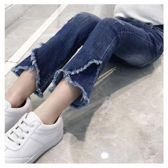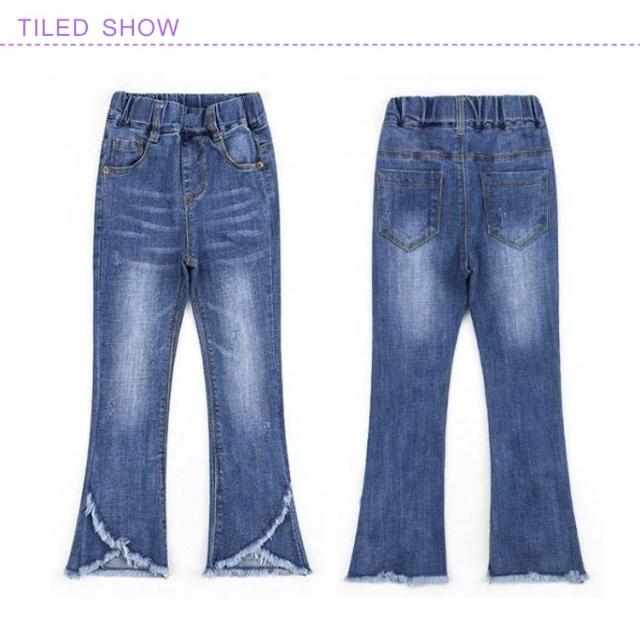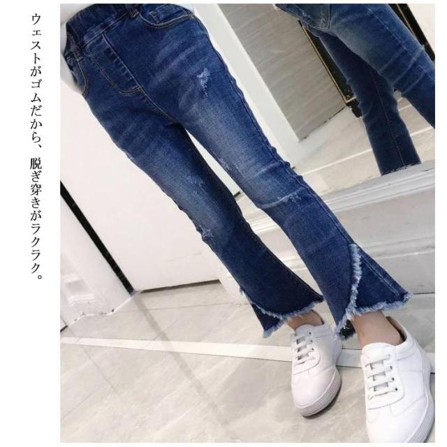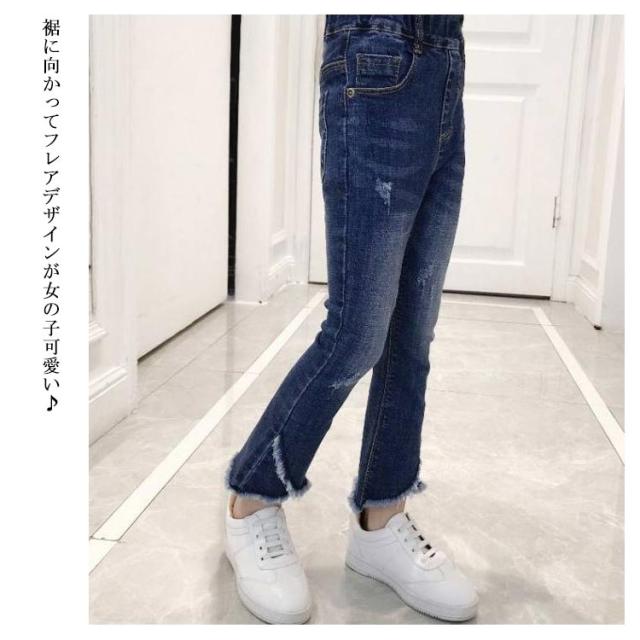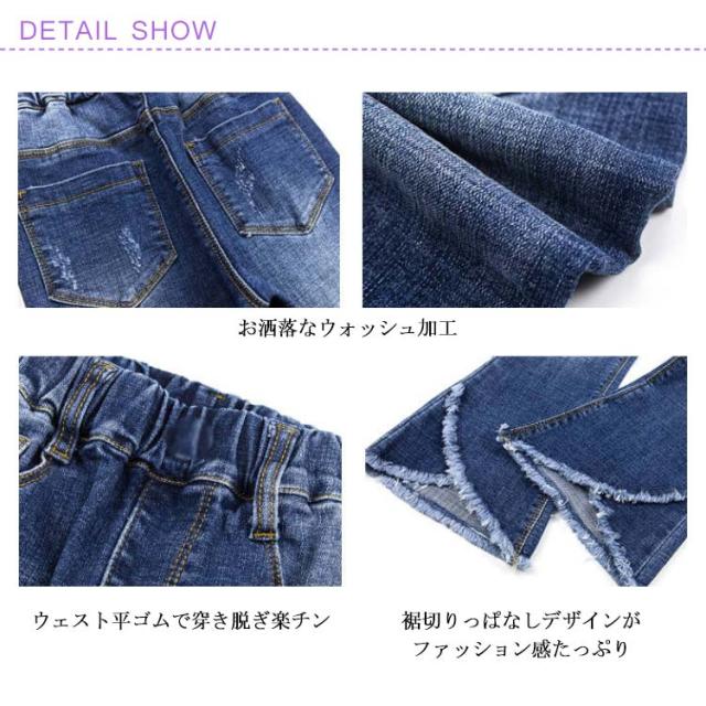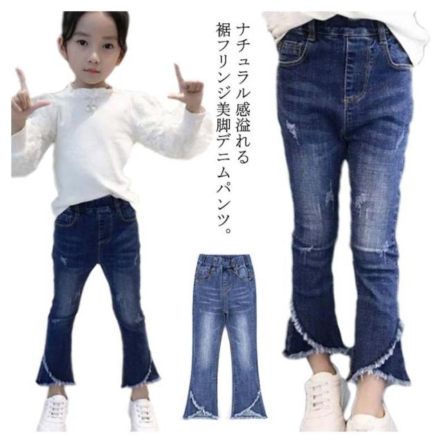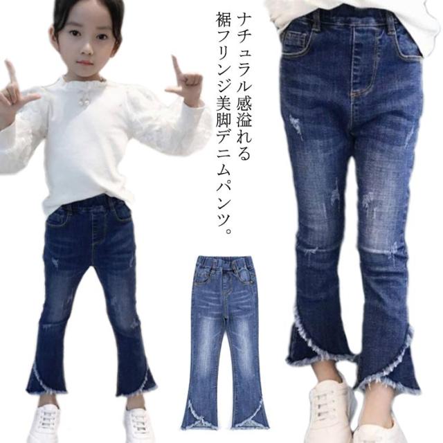 子供服 デニムパンツ 女の子 フレア ラッパー パンツ パンタロン ジーンズ フリンジ ロングパンツ 長ズボン キッズ 子ども ウェストゴム ダメージ加工 ウォッシュ 美脚 110cm 120cm 130cm 140cm 150cm 160cm