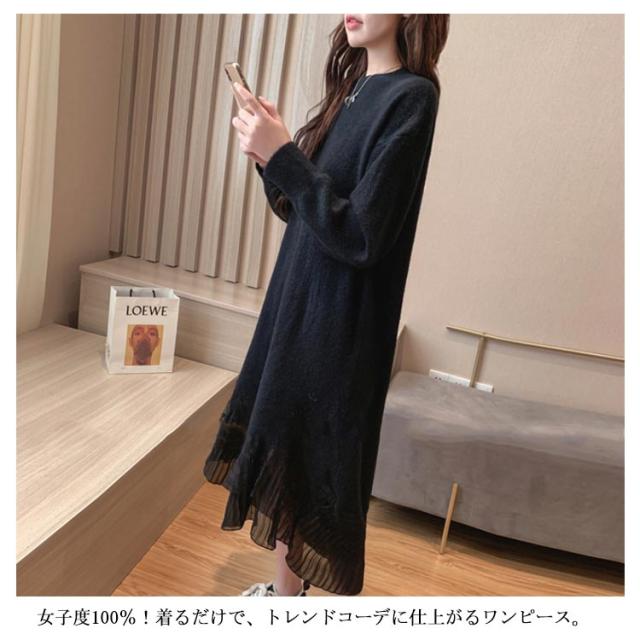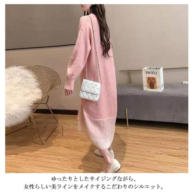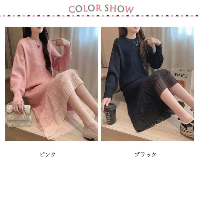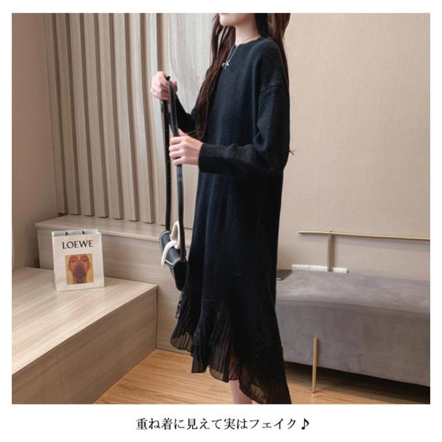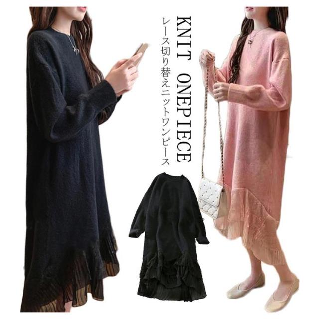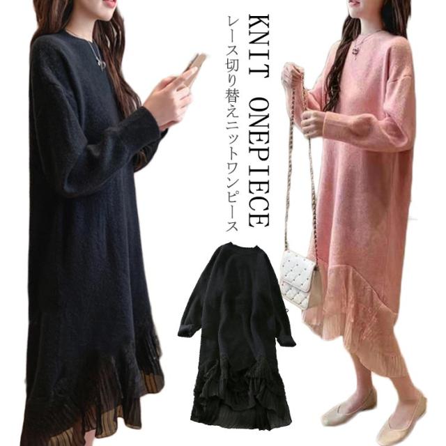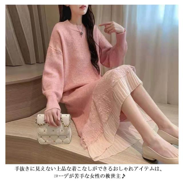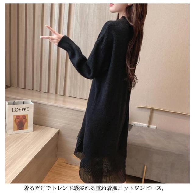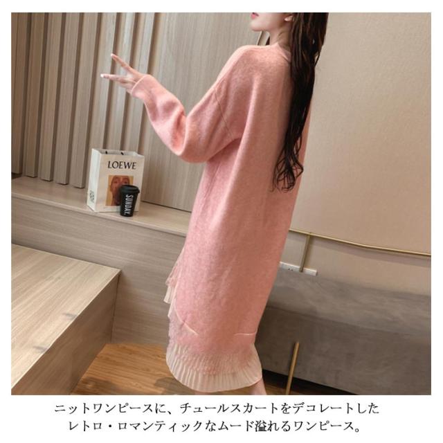 レース 切り替え ニットワンピース 重ね着風 レディース ニットワンピース ドッキングワンピース フェイク レイヤード風 チュールスカート レース スカート 切り替え レイヤード