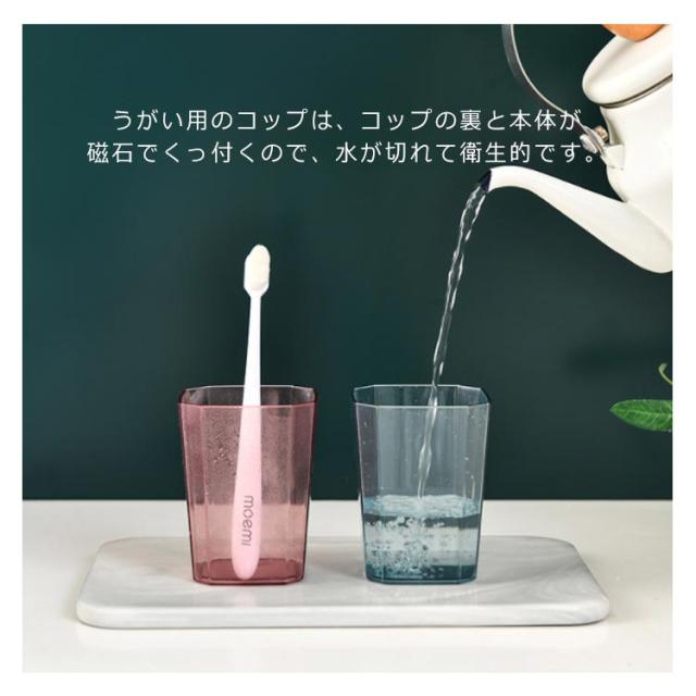 | 付属のフック付き粘着テープで固定します。 歯ブラシ、歯磨き粉、フロスなどをまとめて収納でき、洗面所がスッキリ。 うがい用のコップは、コップの裏と本体が磁石でくっ付くので、水が切れて衛生的です。 | |