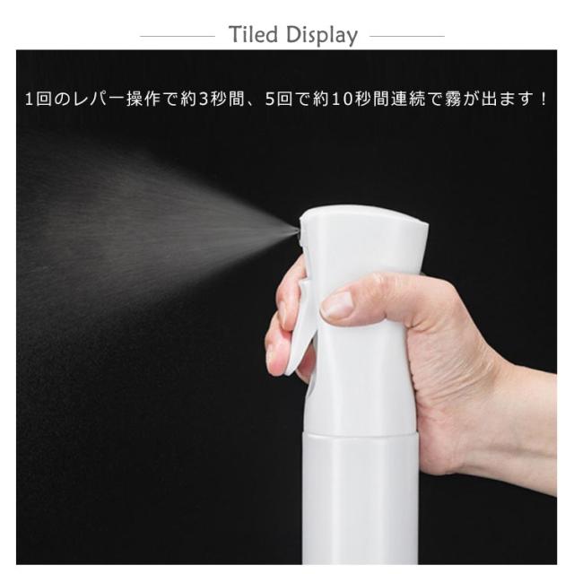 | 高微細ミスト 1回のレパ一操作で約3秒間、5回で約10秒間連続で霧が出ます! 漏れ防止のロックデザインスプレ一パイブとノズルの設計で傾けても逆さにしてもあらゆる角度からスプレ一できます。 特殊な蓄圧構造 ガス?電池不要なのに広範囲に連続噴霧可能 希釈した次亜塩素酸水も対応。身の回りのものの除菌?掃除に役立ちます。 | |