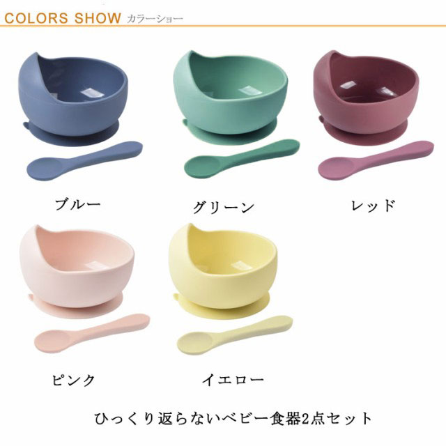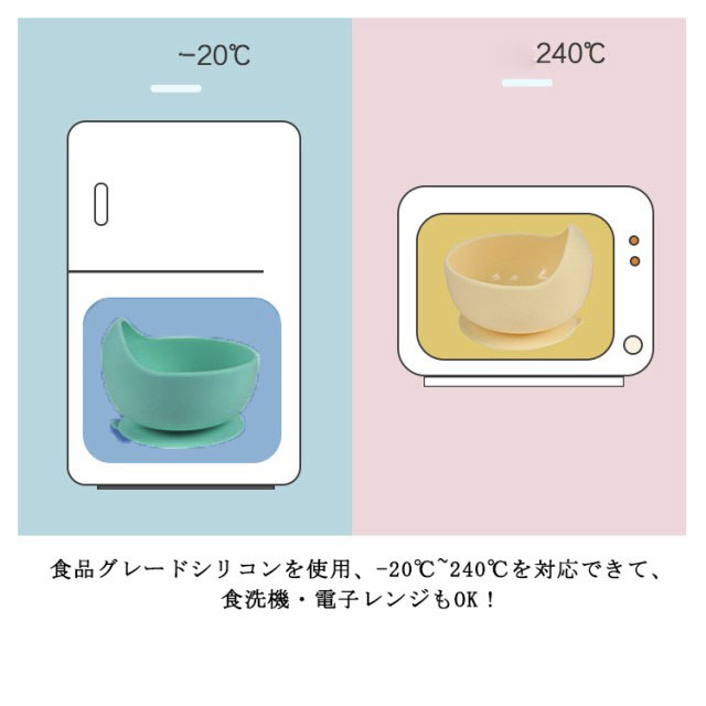 | ひっくり返らないベビー食器2点セット 机に吸着して動かないこぼすリスクを軽減!頑張ってご飯を食べる赤ちゃんをサポート〜 食品グレードシリコンを使用、-20℃~240℃を対応できて、食洗機・電子レンジもOK! ボール型で深さがあり、お粥・ごはんの他にスープなどの盛り付けに便利です。 かわいいスプーン付き、持ちやすくて食べやすい小さな手によく馴染む。 | |