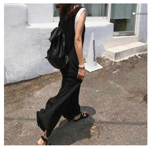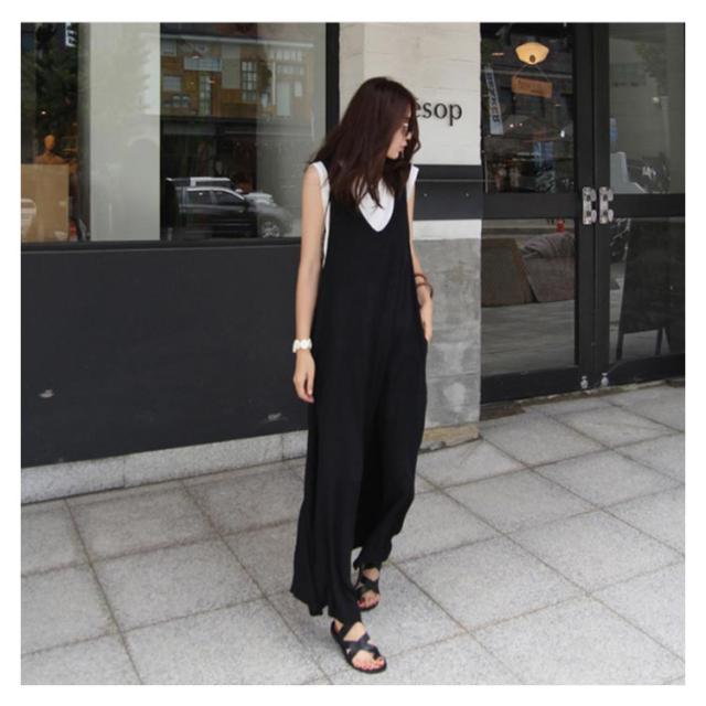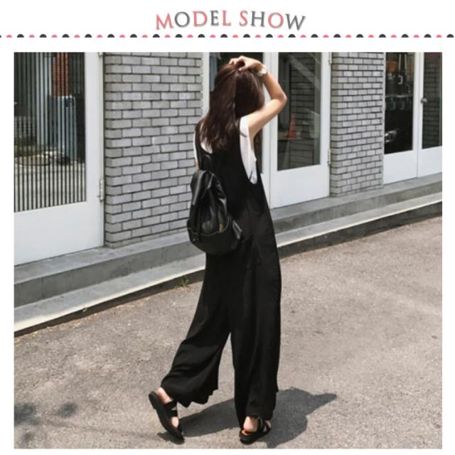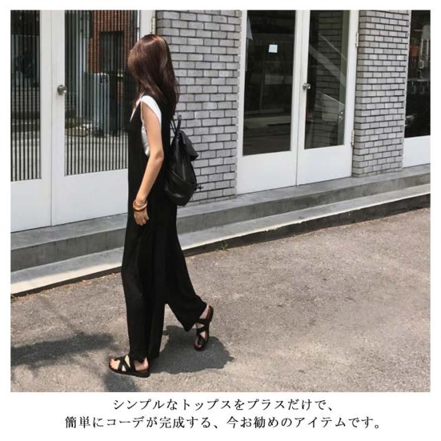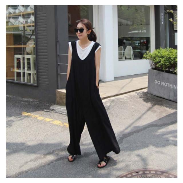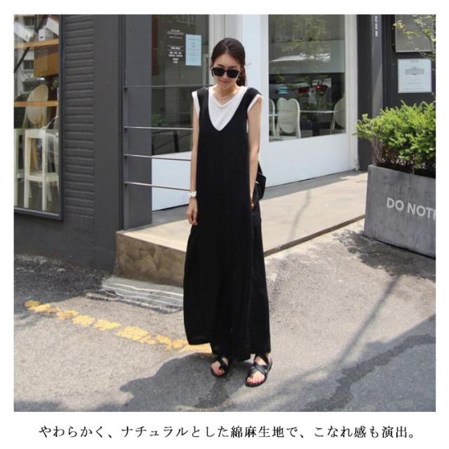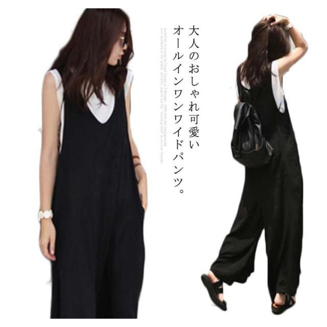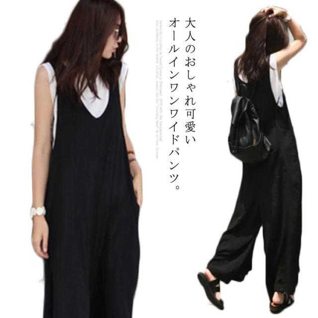 オールインワンワイドパンツ 大きサイズ サロペット オールインワン ワイドパンツ Vネック 綿混 ロング丈 ゆったり 体型カバー 春夏 着やせ カジュアル