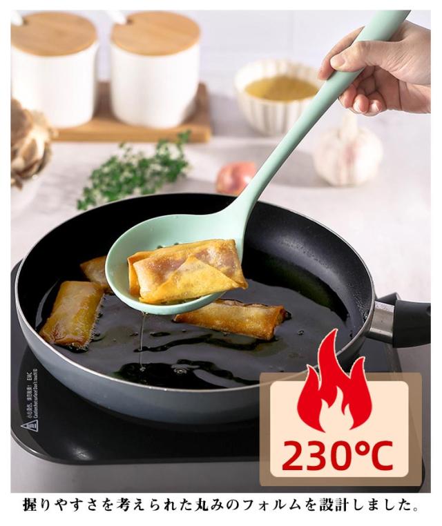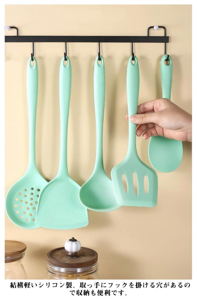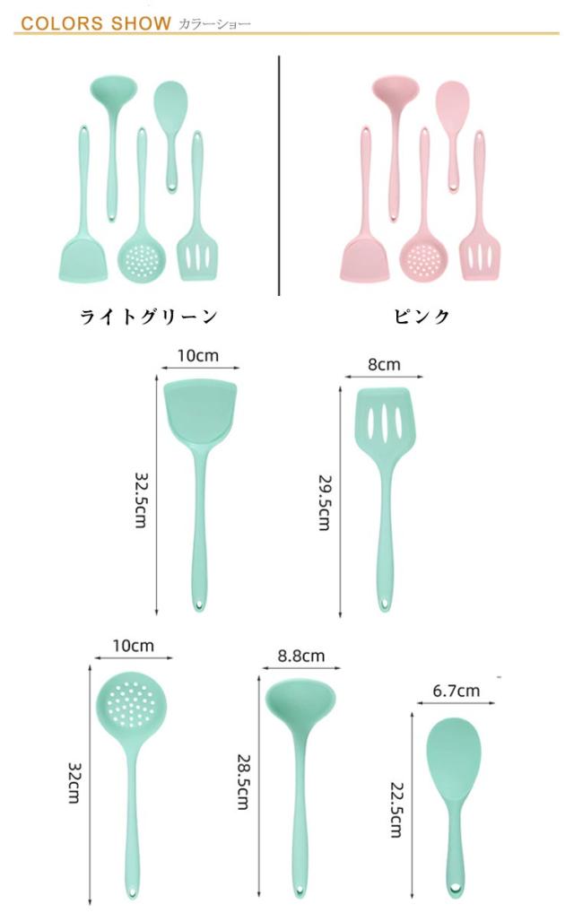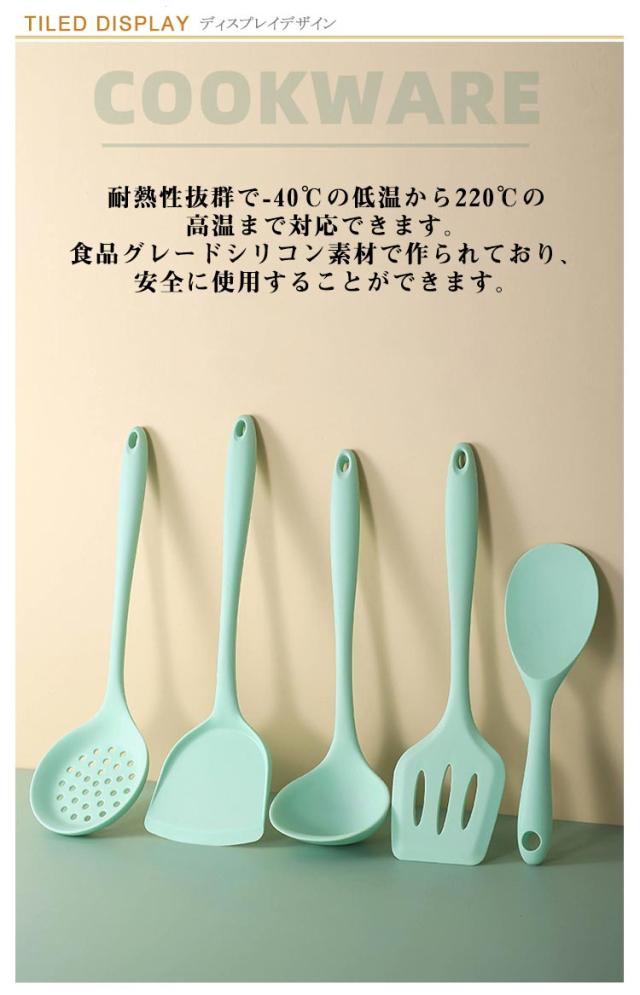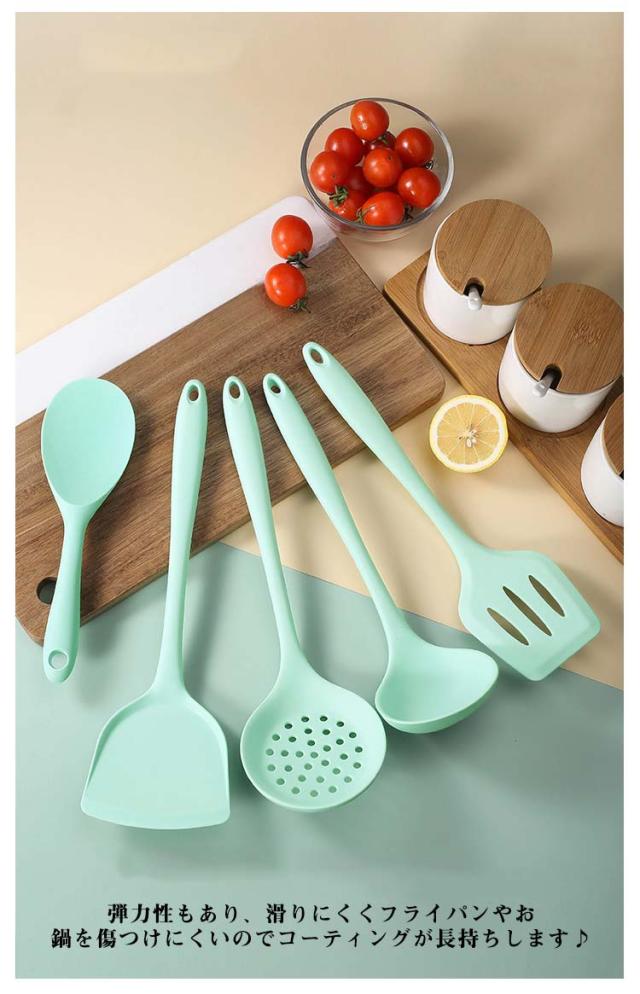 | 耐熱性に優れたシリコン製だから、毎日のお料理に大活躍!キッチンツール5点セット 耐熱性抜群で-40℃の低温から220℃の高温まで対応できます。食品グレードシリコン素材で作られており、安全に使用することができます。 弾力性もあり、滑りにくくフライパンやお鍋を傷つけにくいのでコーティングが長持ちします♪ 握りやすさを考えられた丸みのフォルムを設計しました。 結構軽いシリコン製、取っ手にフックを掛ける穴があるので収納も便利です。 | |