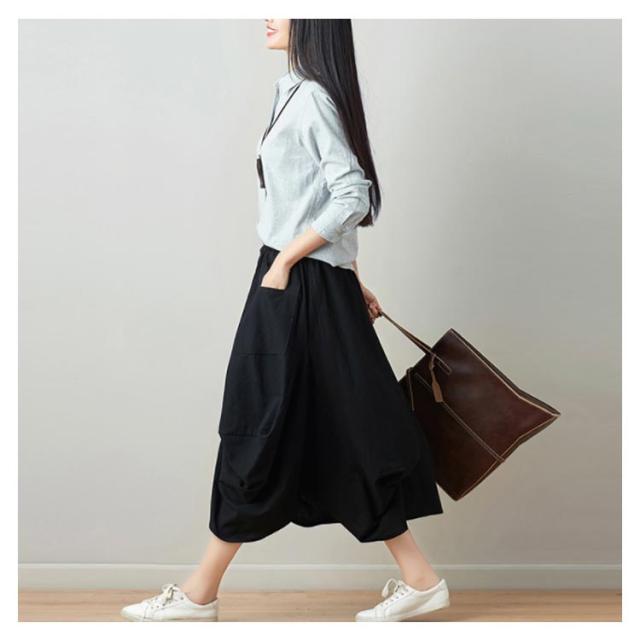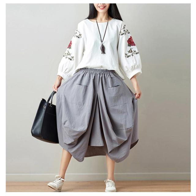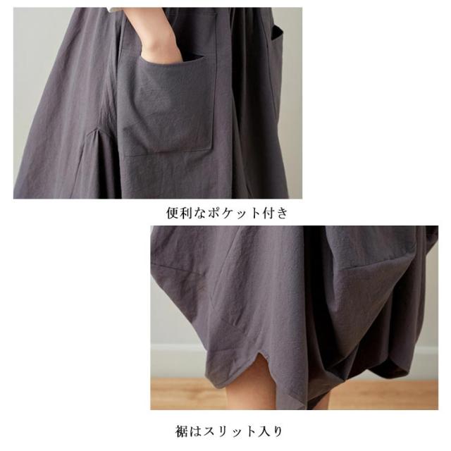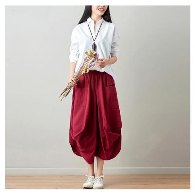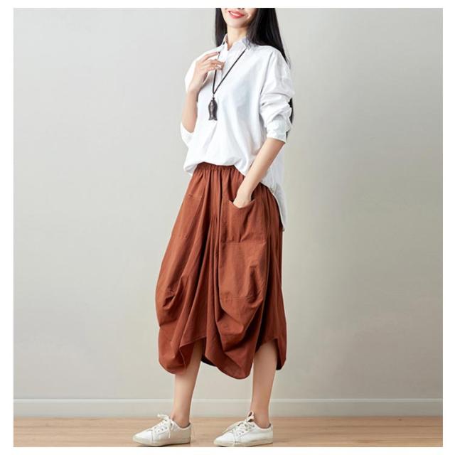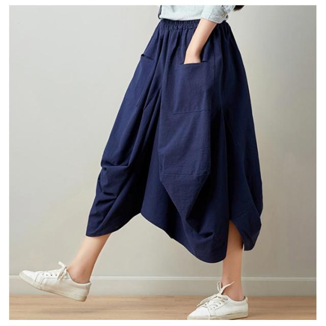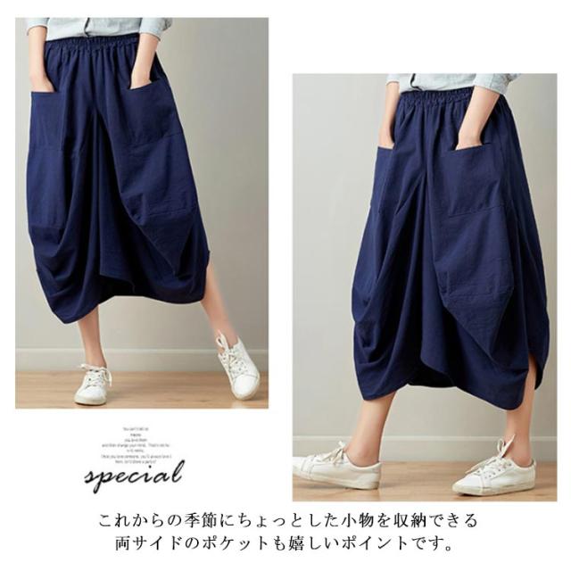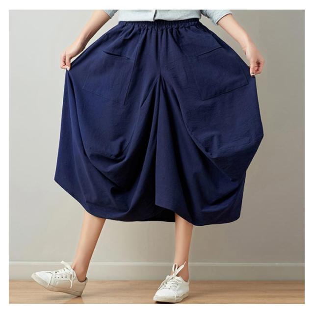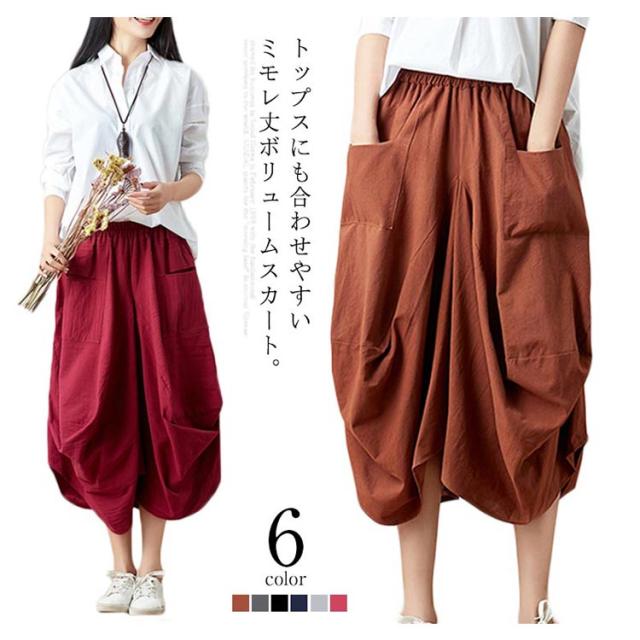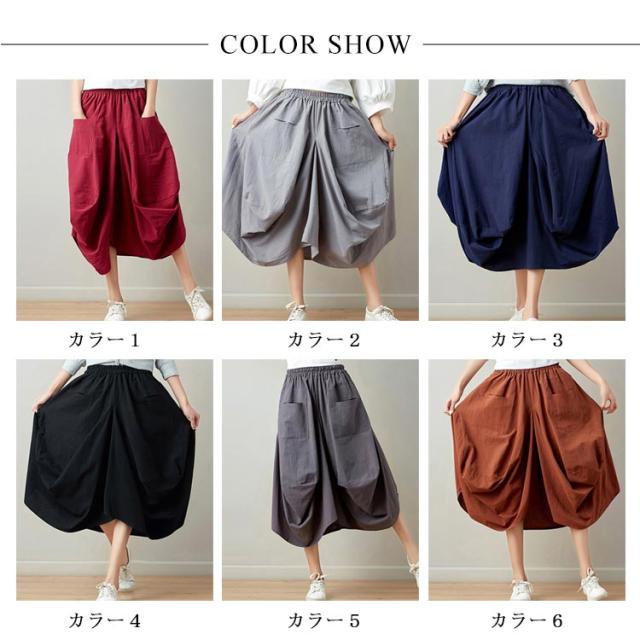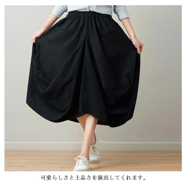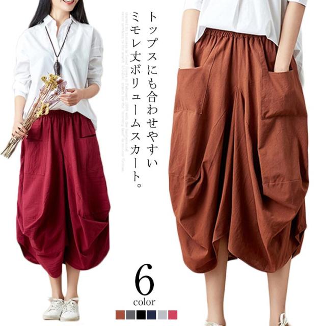 リネンスカート 膝丈スカート ウエストゴム 無地 ポケット付き ヘムライン レディース 女性 膝下 森ガール系 綿麻 かわいい 新作