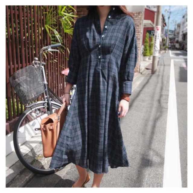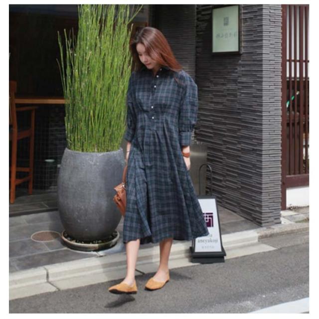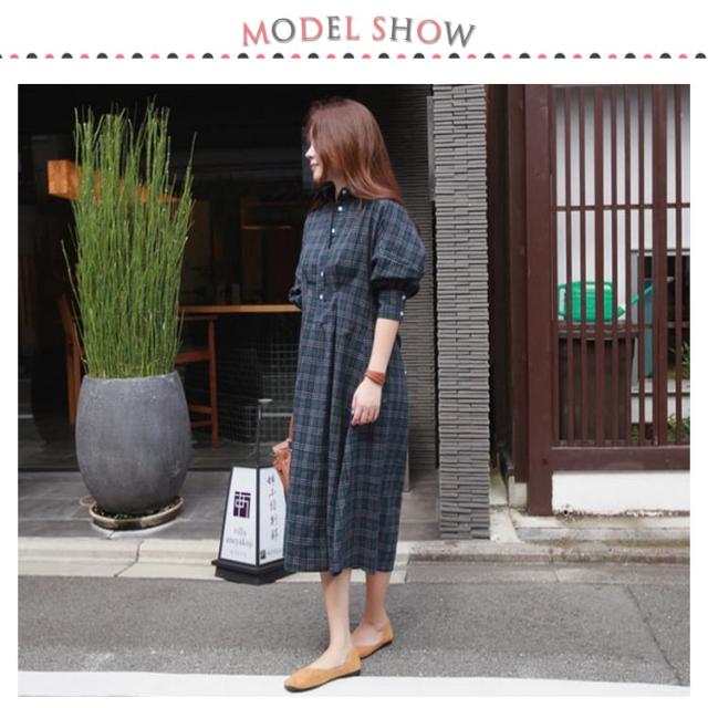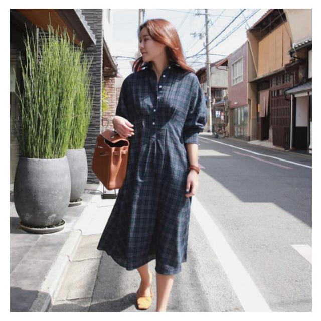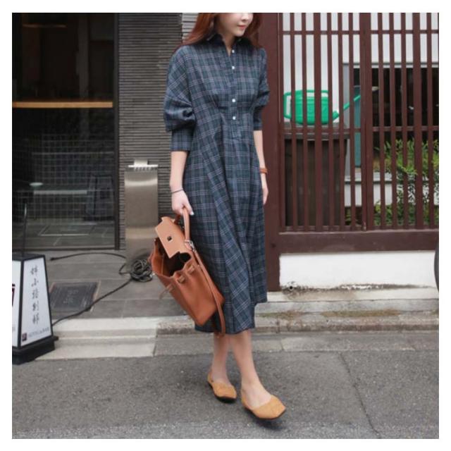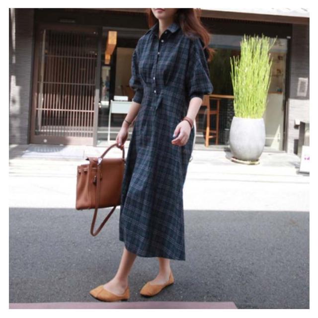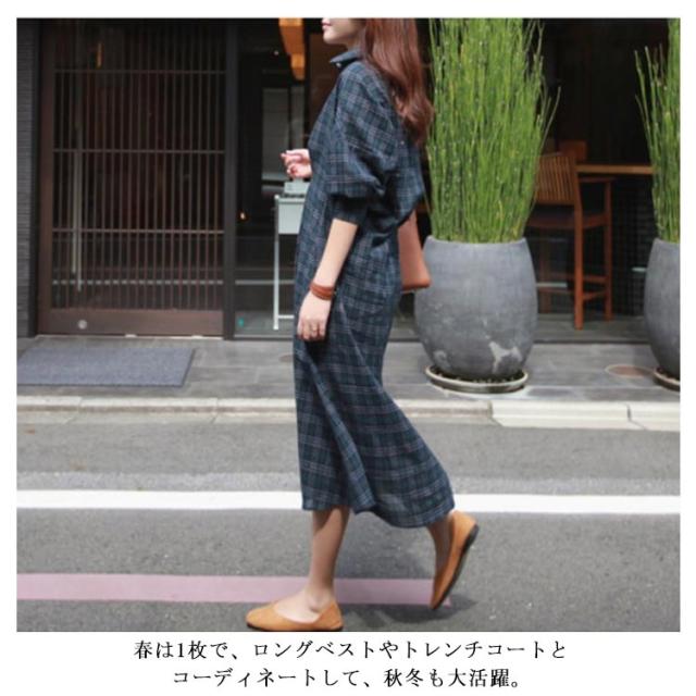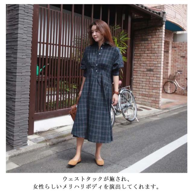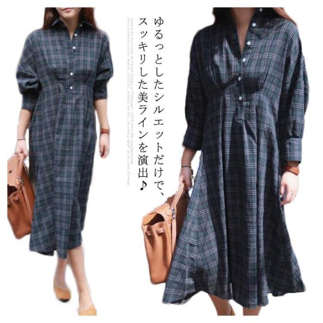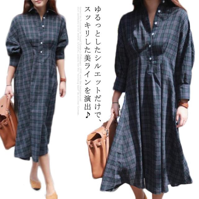 グレンチェック ワンピース レディース 長袖ワンピース パフスリーブ 着痩せ ロング丈 ワンピース シャツ シャツワンピース ゆる 30代 40代 50代 春秋