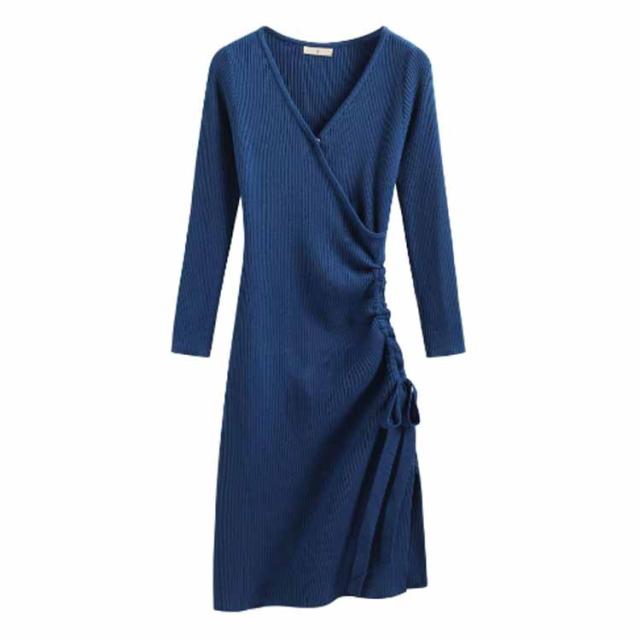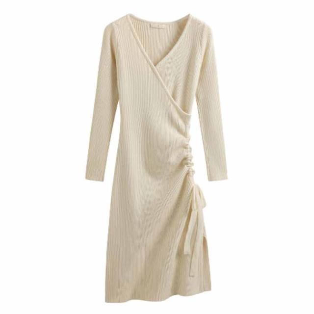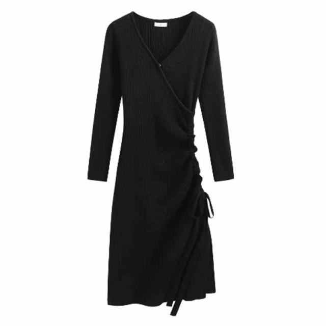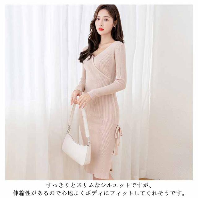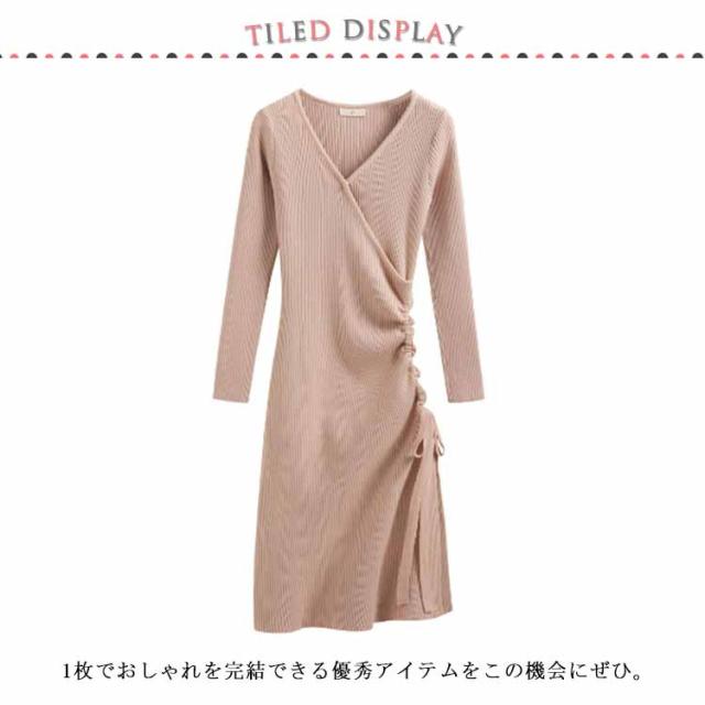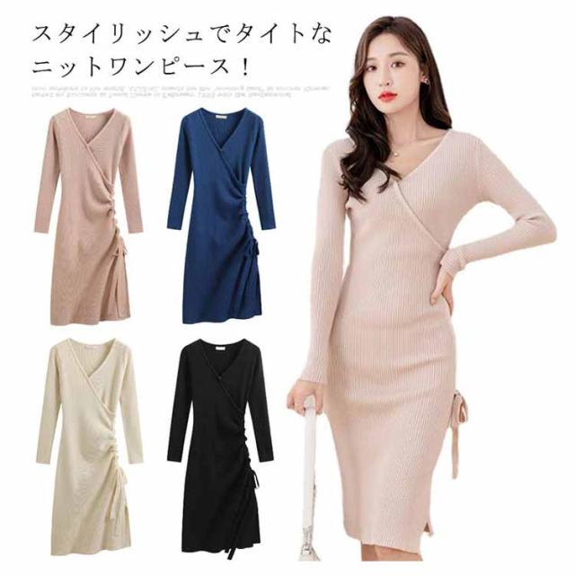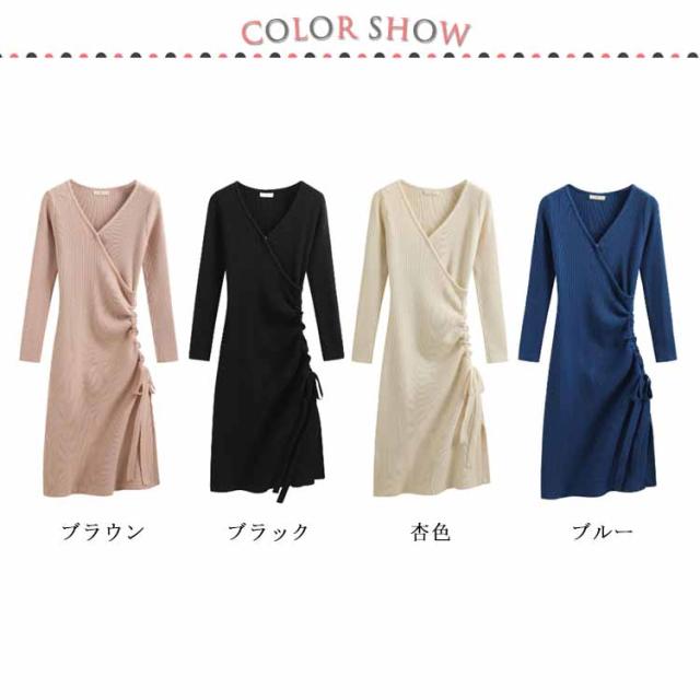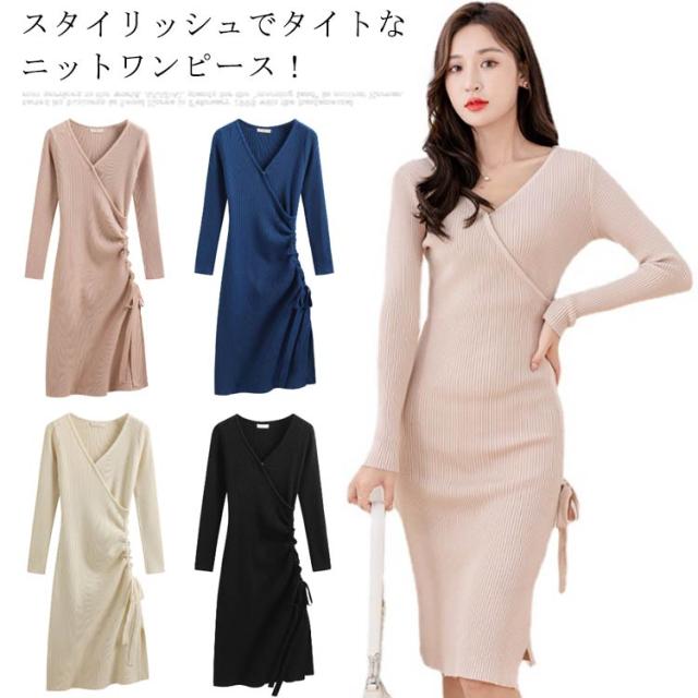 サイド紐付き ニットワンピース ニットワンピ リブニット ワンピース 秋冬 冬 長袖ワンピース ニット Vネック スリット aライン 大人 女性