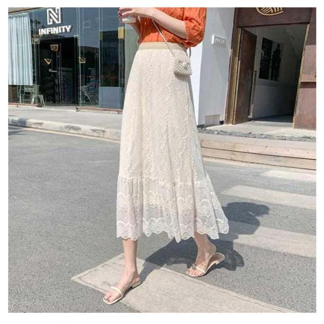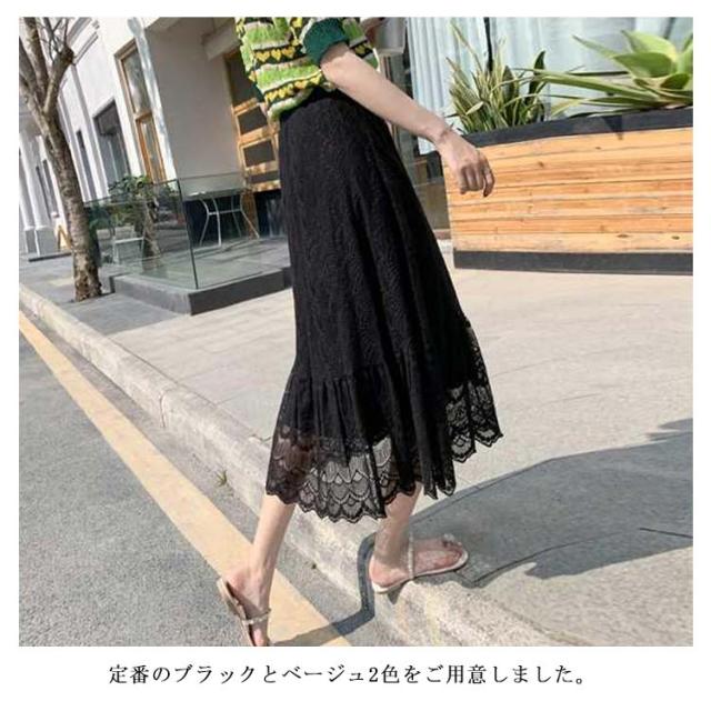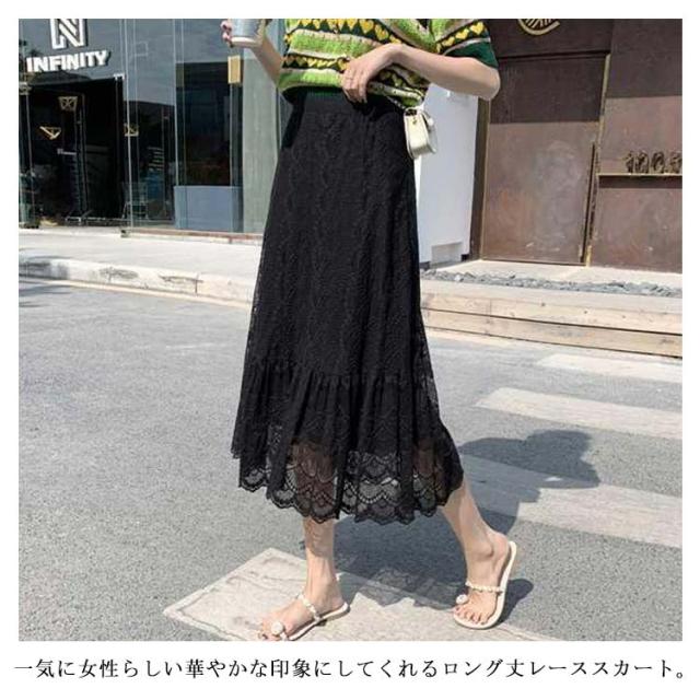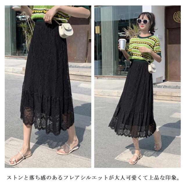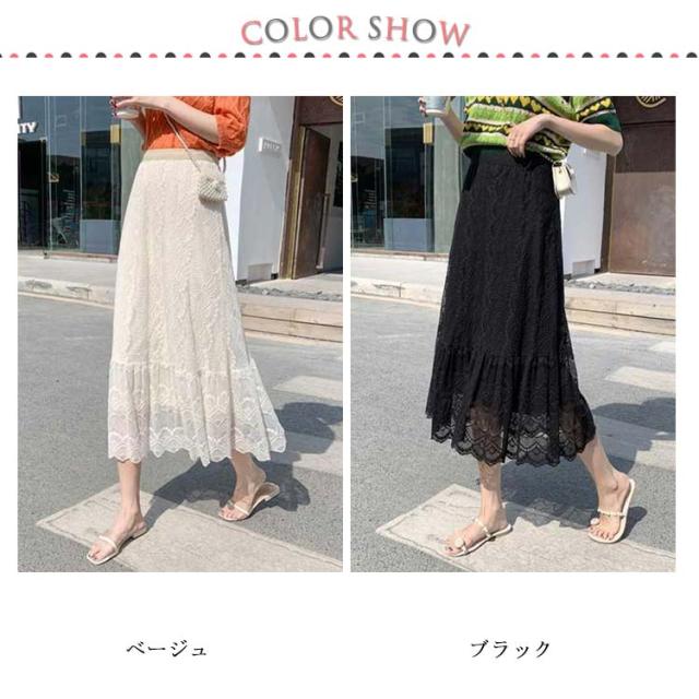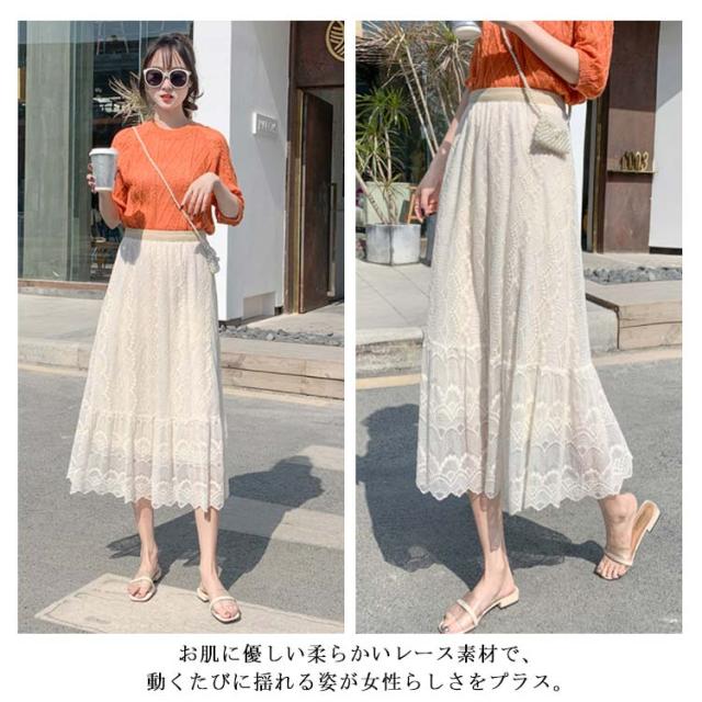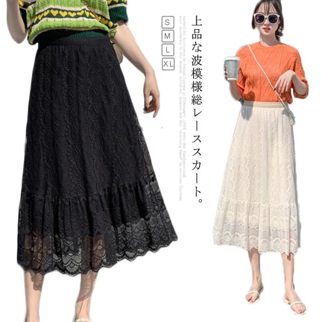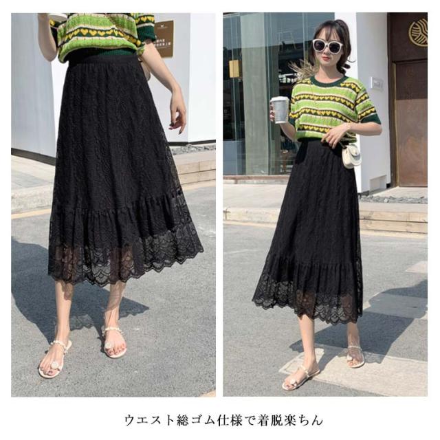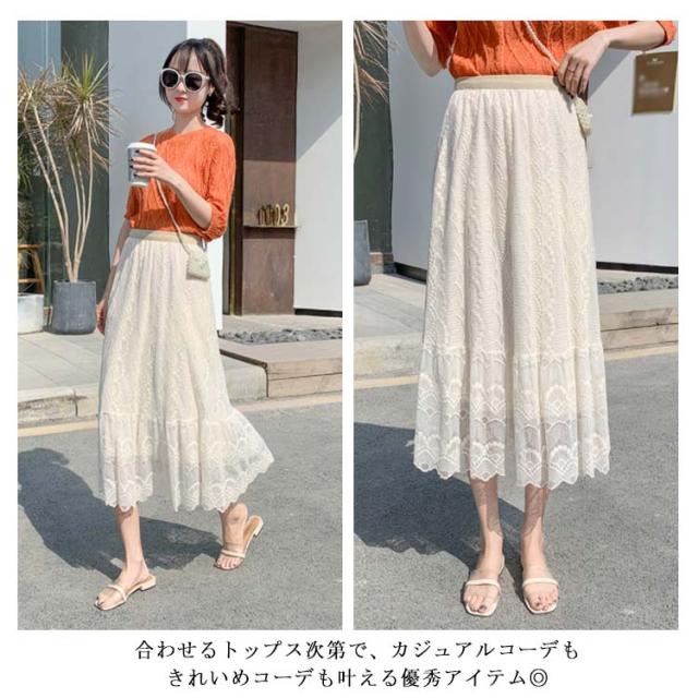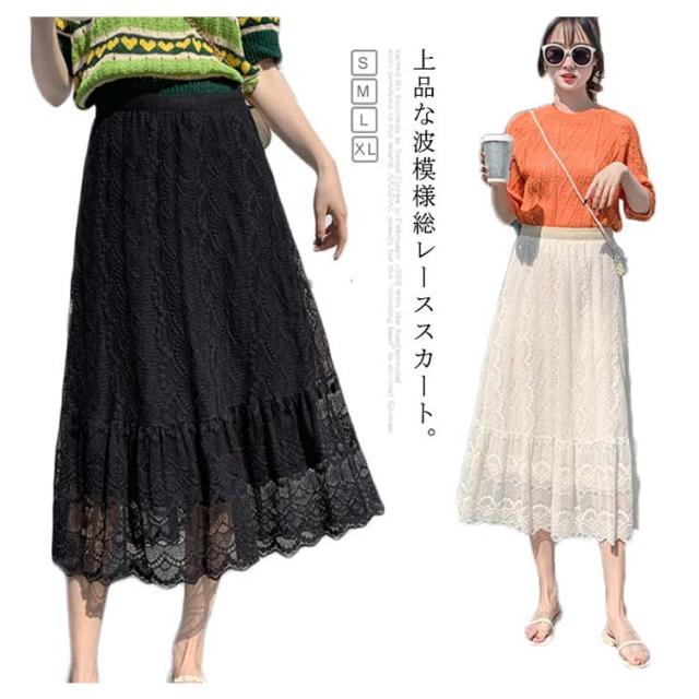 総柄レーススカート フレアスカート ミモレスカート ロング丈 Aラインスカート 送料無料 レディース 上品 柔らかい ウェストゴム 大きいサイズ 春夏新作 フリル