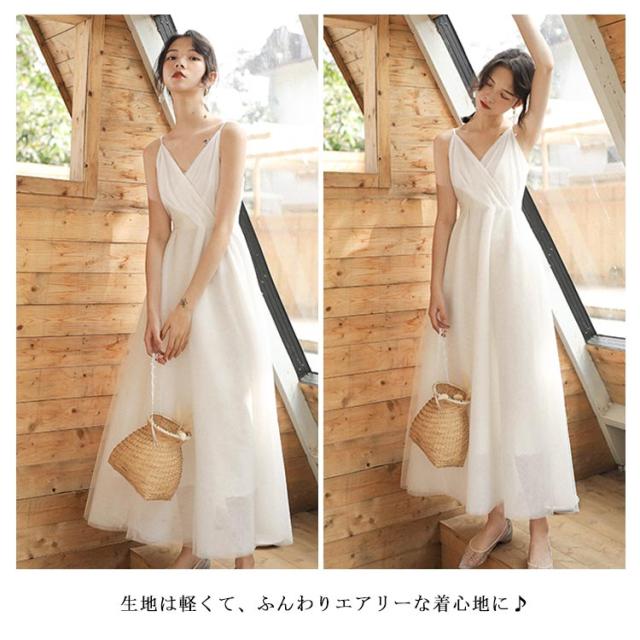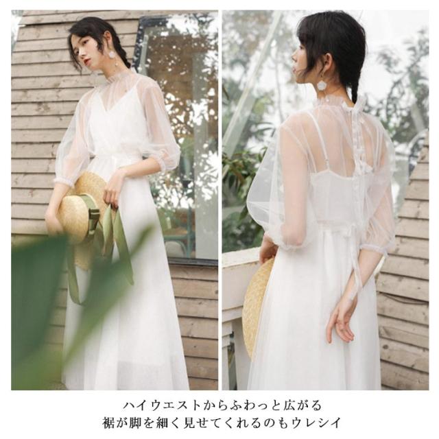 シースルーブラウス付き!キャミソールワンピース ロング ワンピース リゾートワンピース 白ワンピース ロング マキシ ノースリーブ vネック