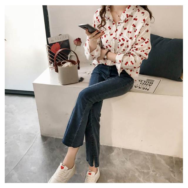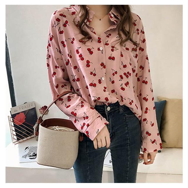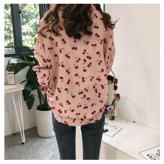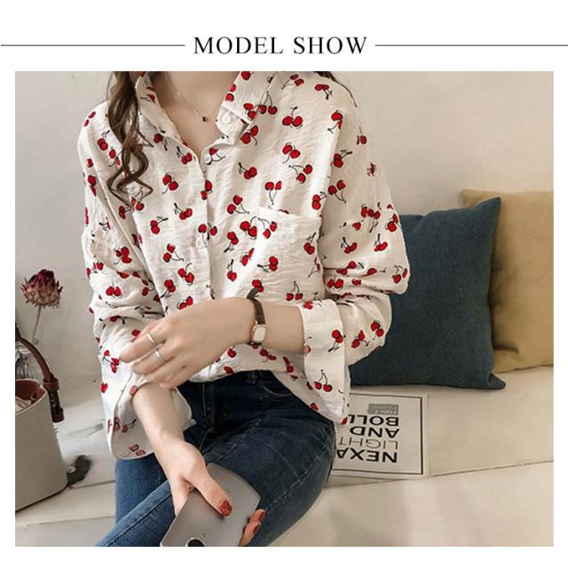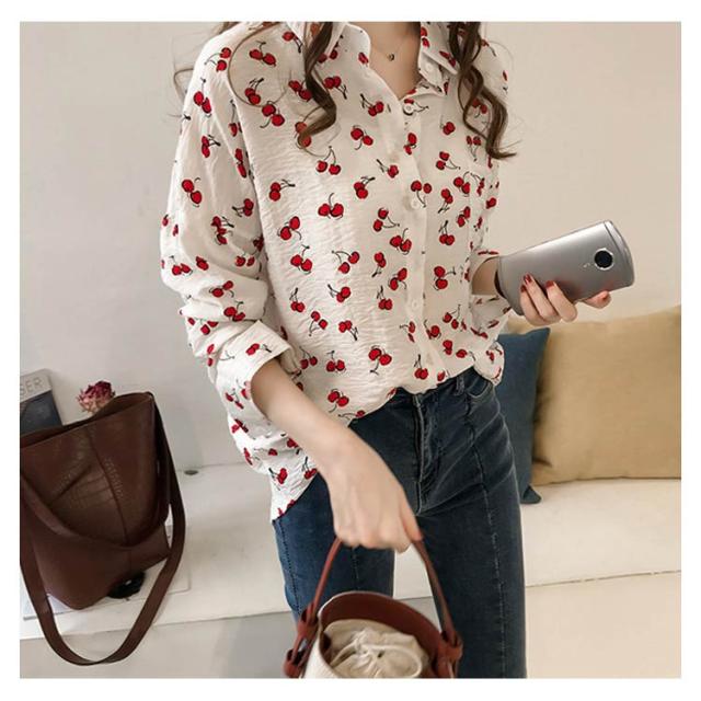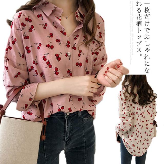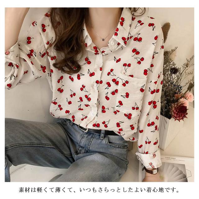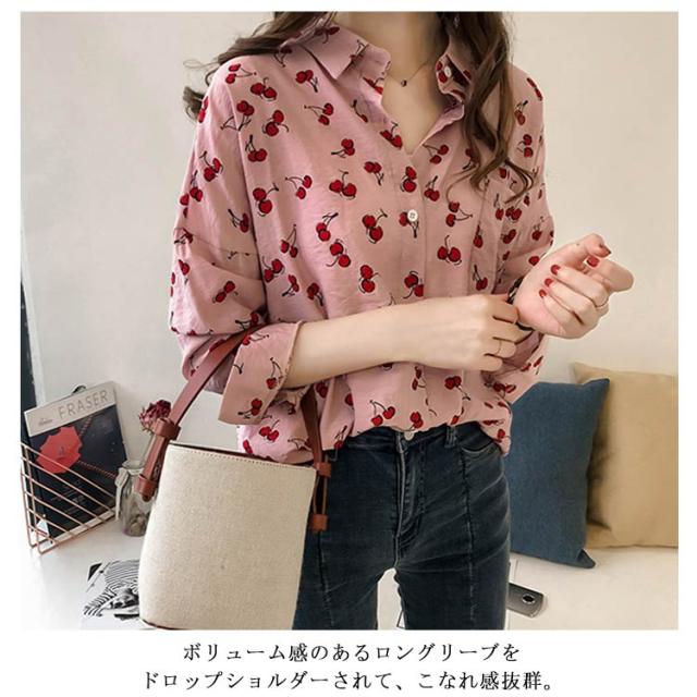 全2色×4サイズ!シャツ ブラウス レディース チェリー柄シャツ チェリー柄ブラウス 総柄 トップス ドロップスリーブ 長袖 カジュアルシャツ おしゃれ 可愛い