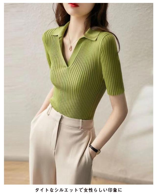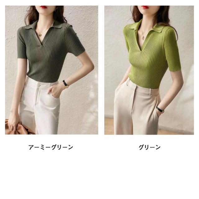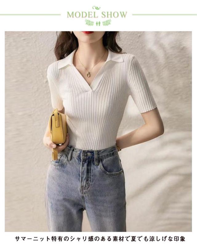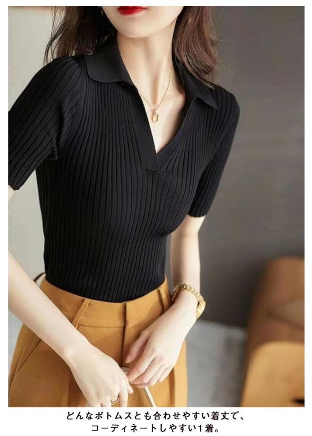【送料無料】ニット サマーニット 半袖 ポロシャツ レディース Vネック 半袖ニット 薄手ニット 春夏 リブ編み スリム フィット 通勤 通学 細身 きれいめ 二次会 飲み会 普段着 20代 30代 40代 50代