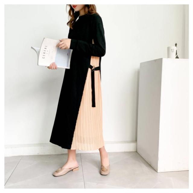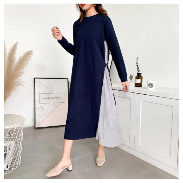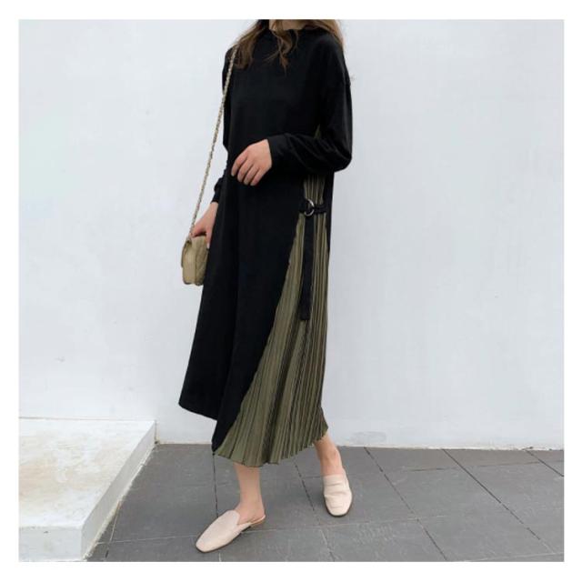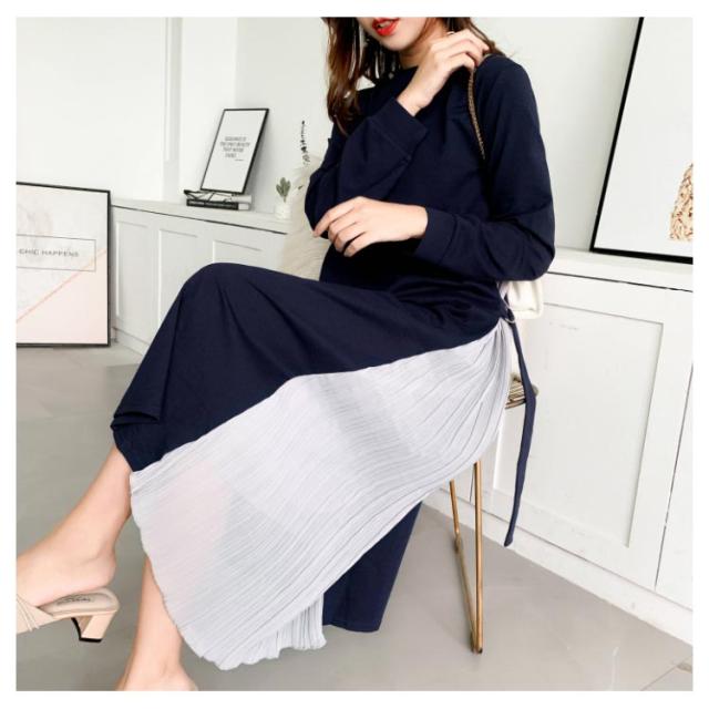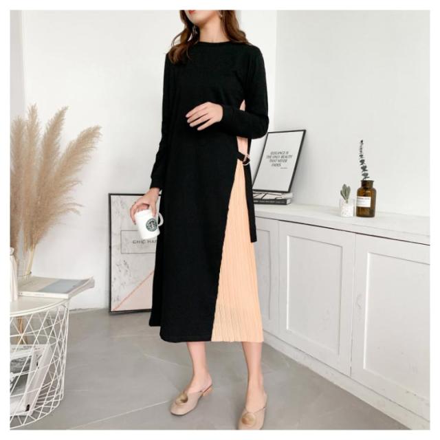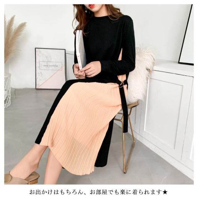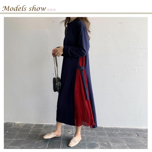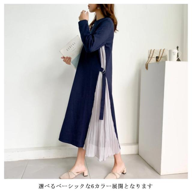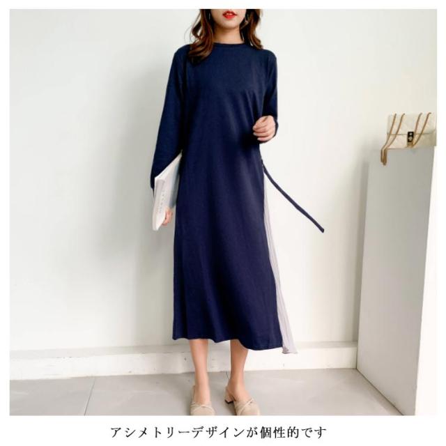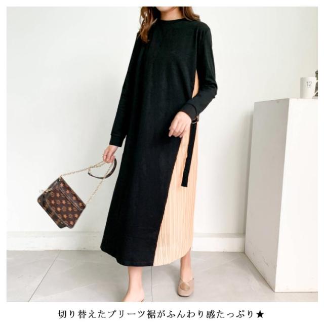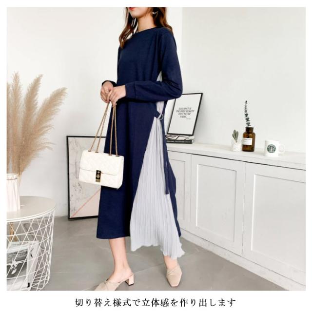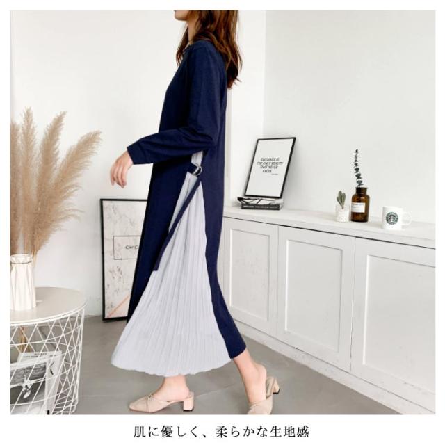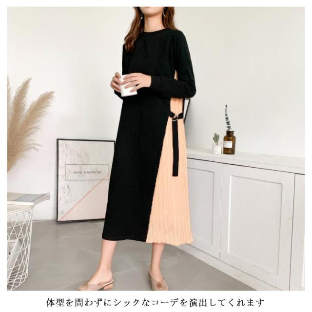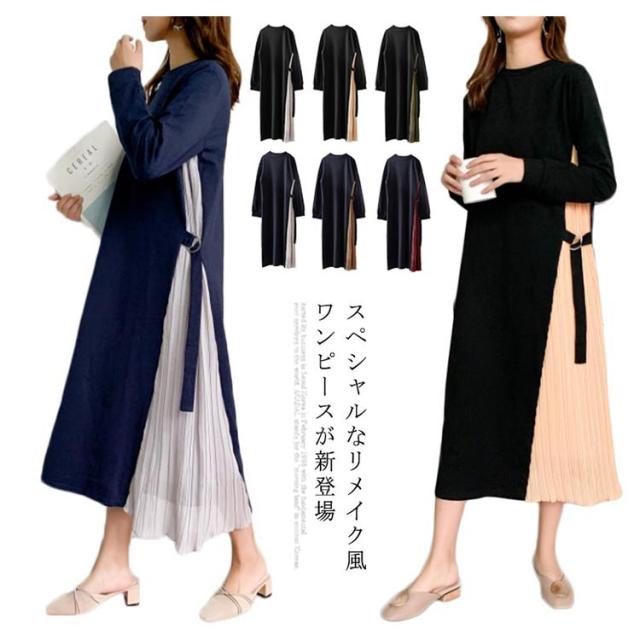 リメイク風ワンピース レディース ワンピース 長袖 ロングワンピース ミモレワンピース ラウンドネック 切り替え プリーツ カットソーワンピース 薄手 お洒落 カジュアル リラックス キレイめ 大きいサイズ 春夏物 春新作