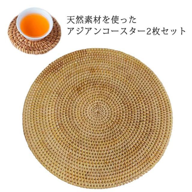 | 天然素材を使ったアジアンコースター2枚セット いろいろ使えて重宝する定番コースター。カフェやレストランでも使用されている人気アイテムです。 熱いお茶の湯呑にも、冷たい飲み物のグラスにも合うデザイン。テーブルに置くだけで自然とアジアンな雰囲気に。 水に強い素材だから、少しぐらい濡れてもきちんと乾かせば全く問題ありません。 落ち着いた色合いで、どんな食器との相性がいいんです。 | |