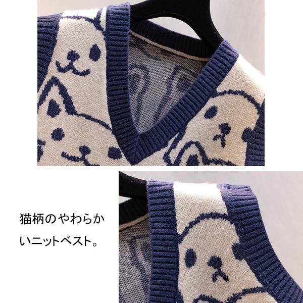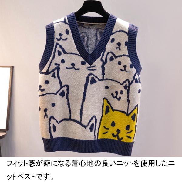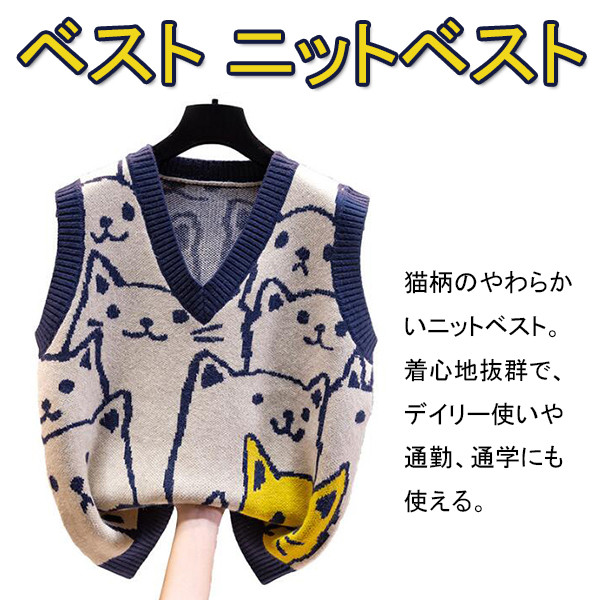 ベスト ニットベスト レディース セーターベスト Vネック ゆったり 猫柄 ショート ベスト チョッキ 春秋冬用 ニットインナー カジュアル 袖なし ニットセーター 通学 可愛い ファッション S~XL