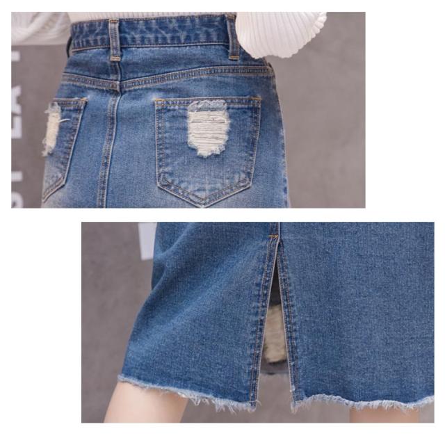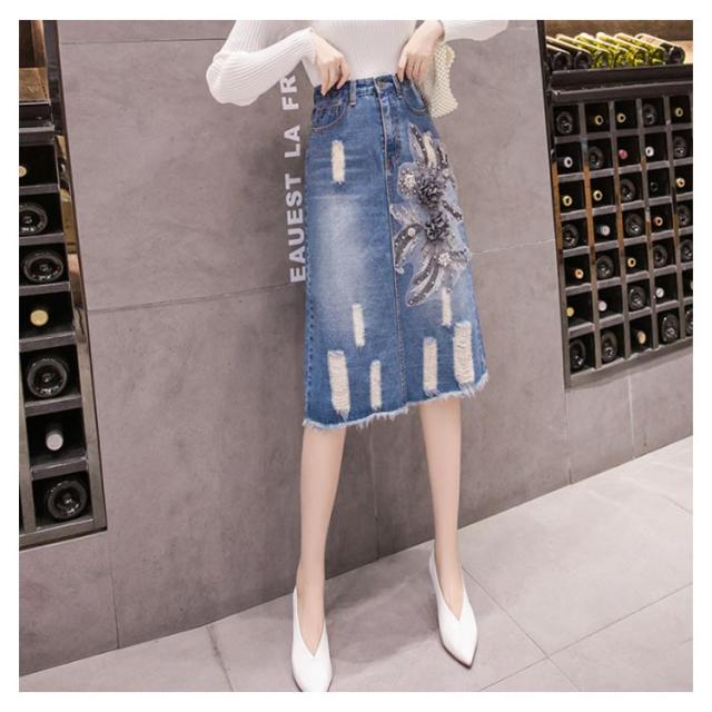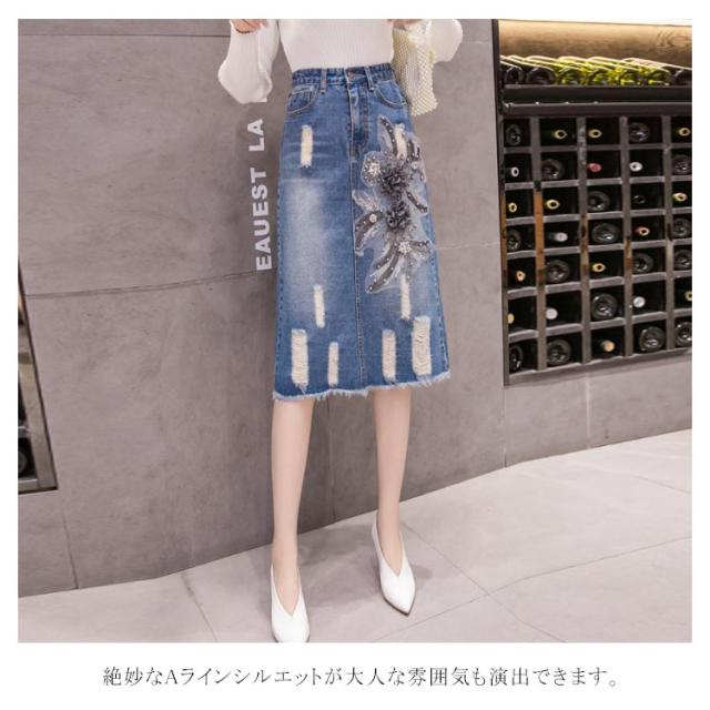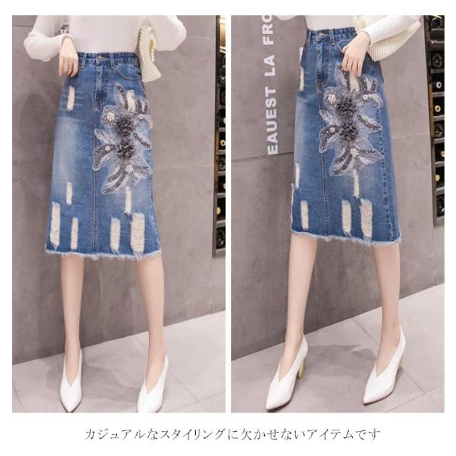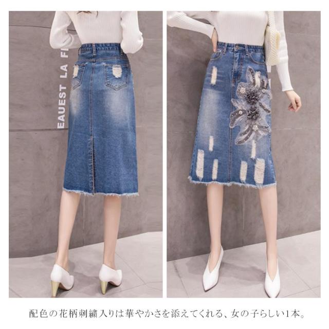 デニムスカート 膝下丈 ボトムス スカート Aライン スリット入り ミディアム丈 レディース ダメージ加工 刺繍入り 花柄 ハイウエスト 着痩せ 美脚
