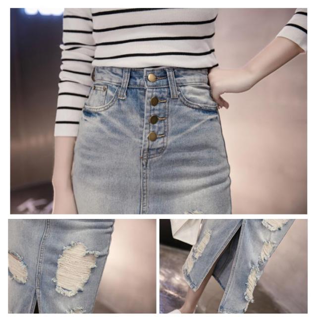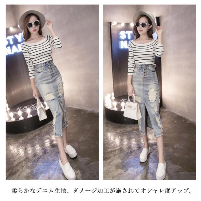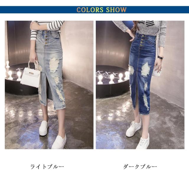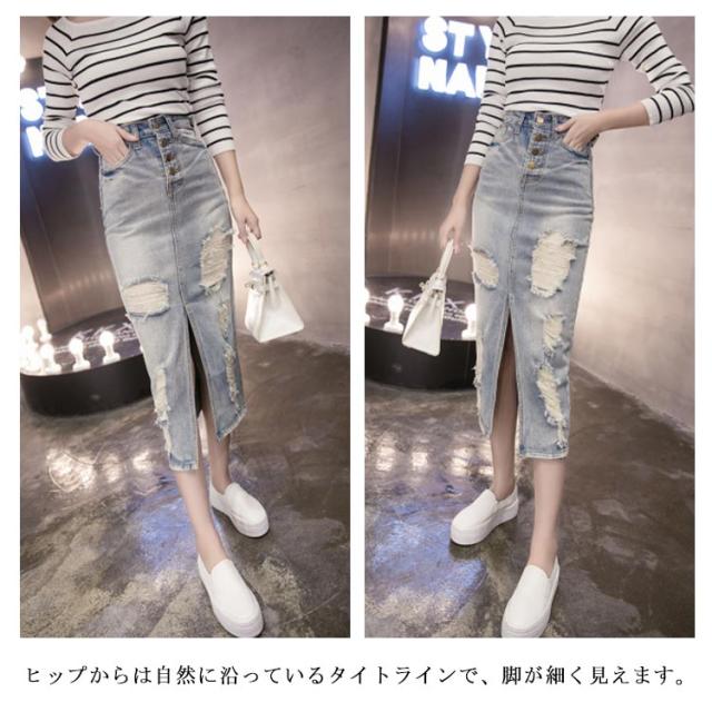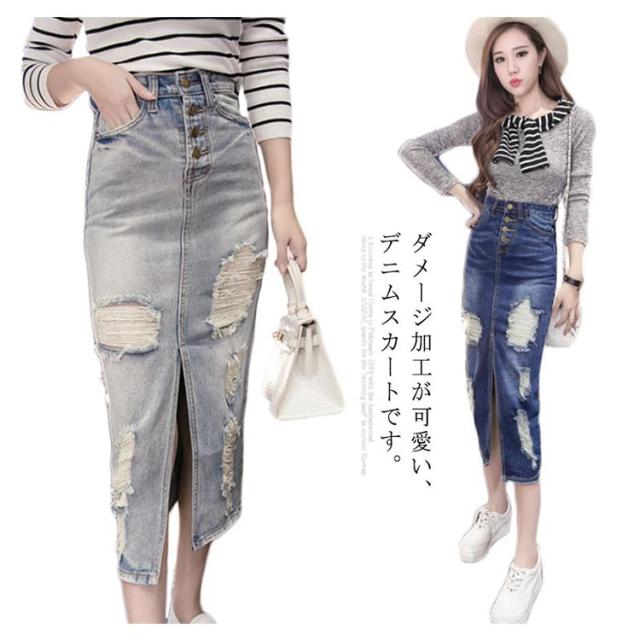 デニムスカート ロングスカート ダメージ加工 スリット入り スリム ハイウエスト レディース ロング丈 スカート ミモレ丈 韓国風 ファッション 細見え 脚長効果 大きいサイズ