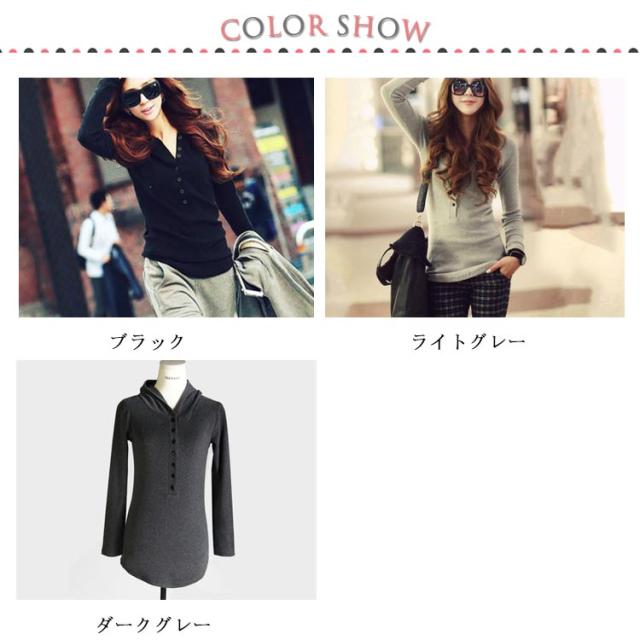 | 全3色!春秋一枚で主役になるフード付き長袖カットソー。 フロントボタン半開きデザインを採用しております。 体に程度よくフィットし、ボディラインが強調できます。 お尻ライン隠れる丈感もバランス良い。 シンプル無地だから合わせやすく、お手元のボトムスと好相性。 | |