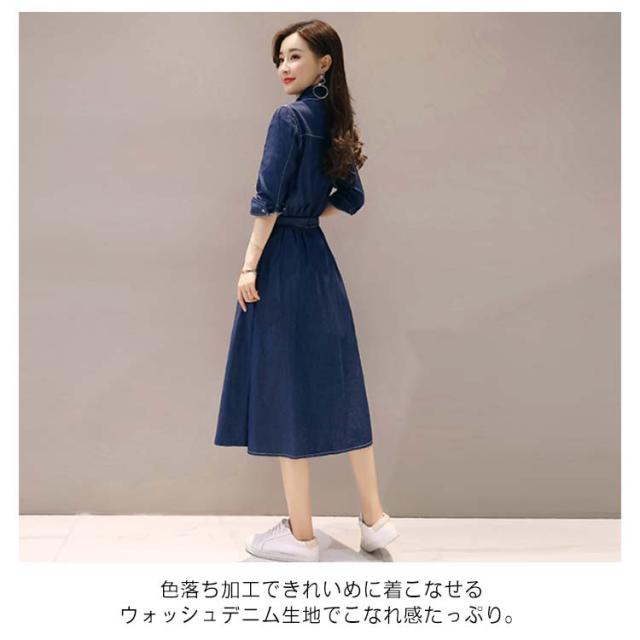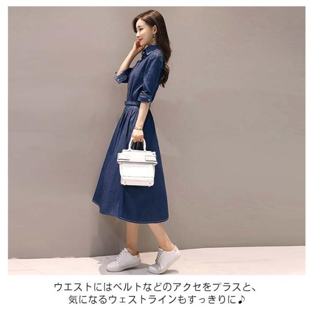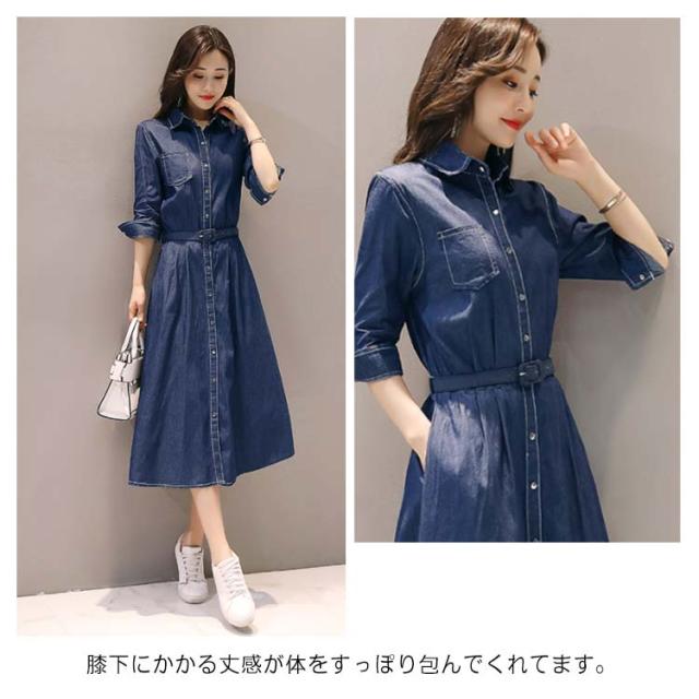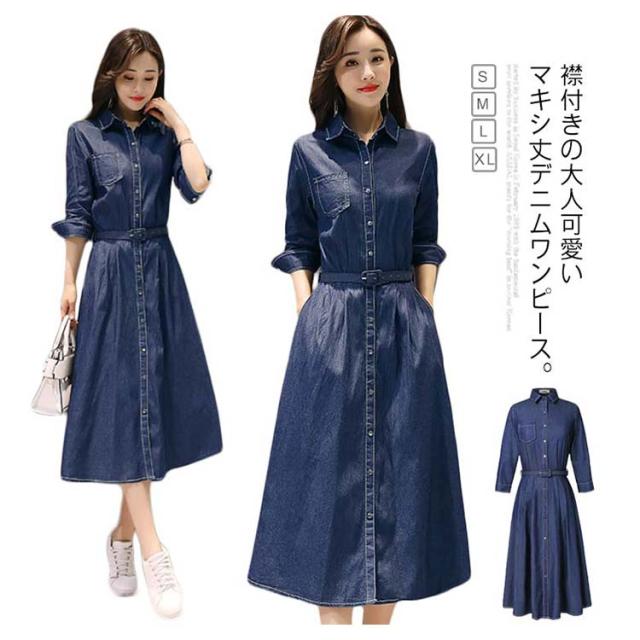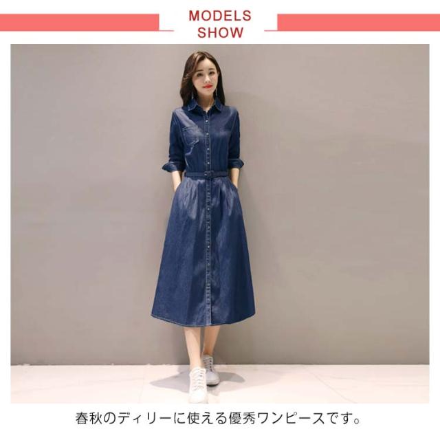 デニムシャツワンピース 長袖 デニムワンピース シャツワンピース ロングワンピース ワンピース 春 秋 膝下丈 ロング丈 aライン お洒落 大人 女性 春服 春物