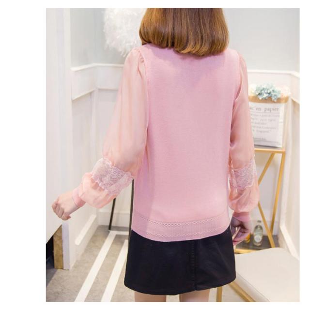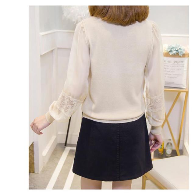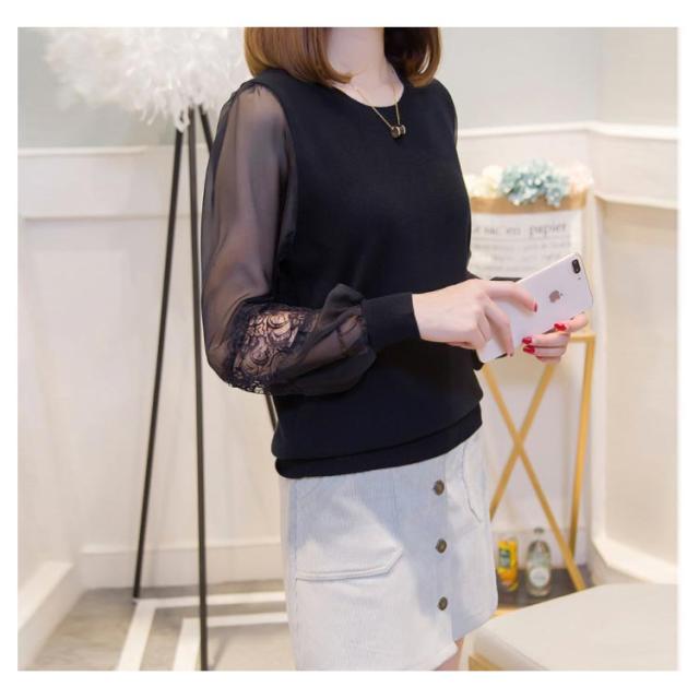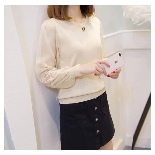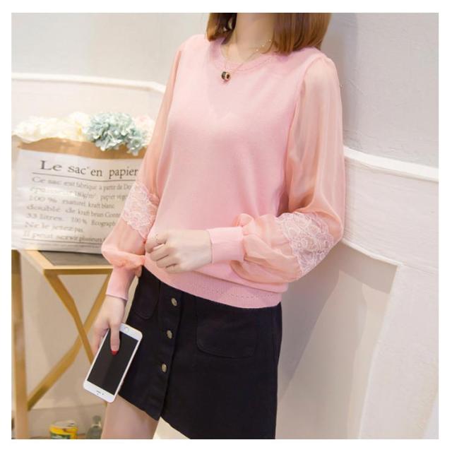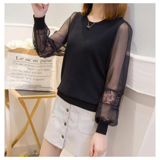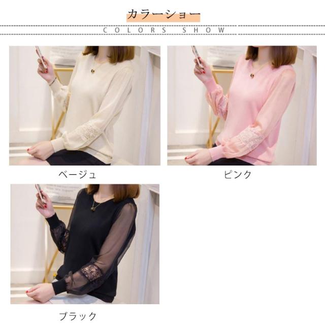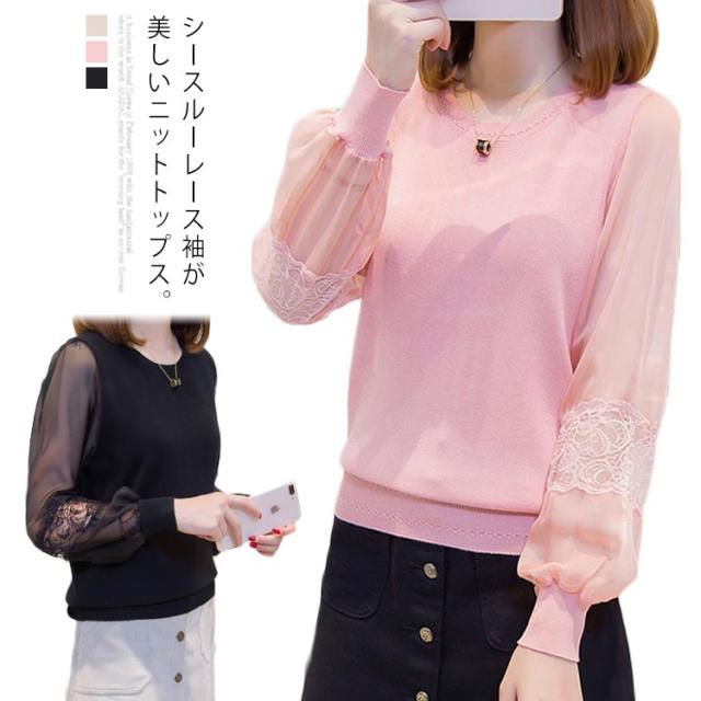 透かしスリーブ ニットトップス レディース バルーン袖丈 ニット セーター 長袖 フェミニン 大人 可愛い シースルーレース トップス 薄手 ラウンドネック