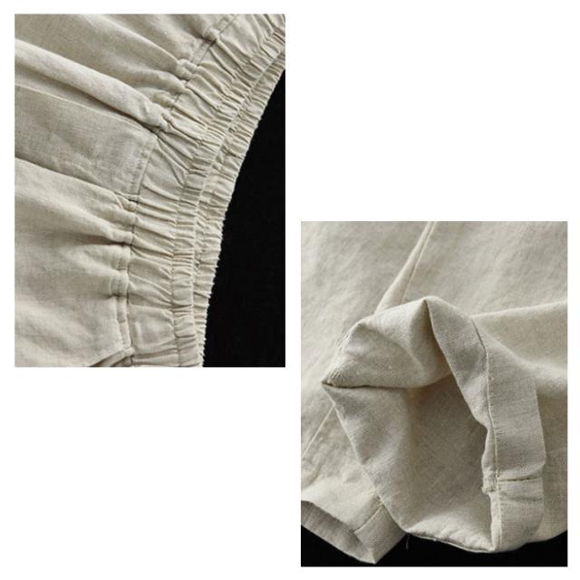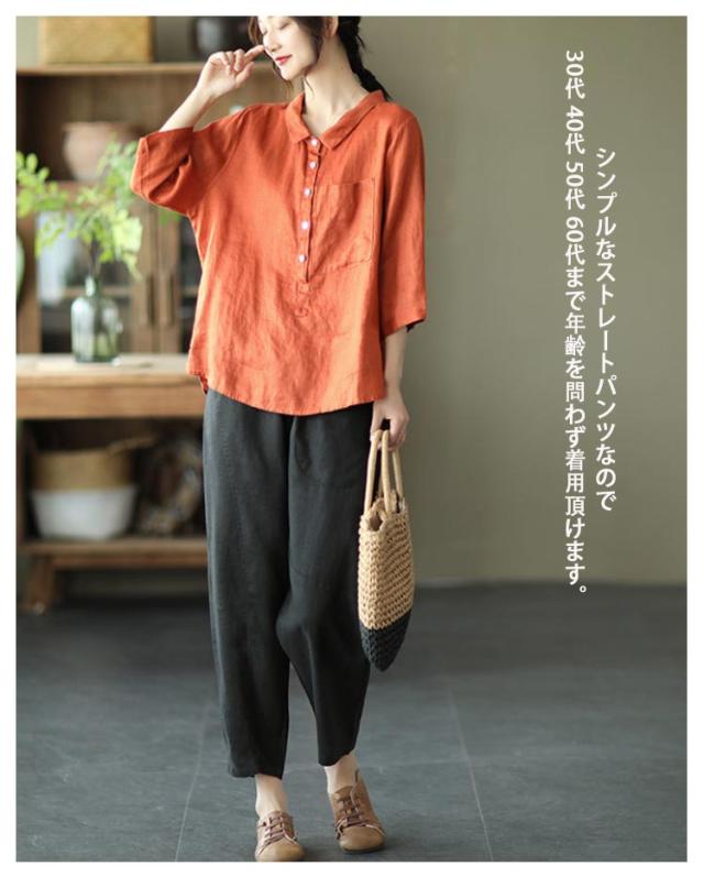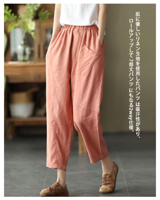 | シンプルなライン 大人カジュアルを演出する! ゴムウエストのイージーパンツ 流行を気にせず長く使える 肌に優しいリネン生地を使用したパンツ は吸汗性があり、ロールアップして 7部丈パンツ にもなる2way仕様。 裾に向かってすこし細くなり足長シルエットを叶える。 ストレスフリーな履き心地でルームウェアにもおすすめなパンツ スポーティーなスタイルから、ナチュラル服まで、幅広いコーディネートが楽しめます。 シンプルなストレートパンツなので30代 40代 50代 60代まで年齢を問わず着用頂けます。 | |