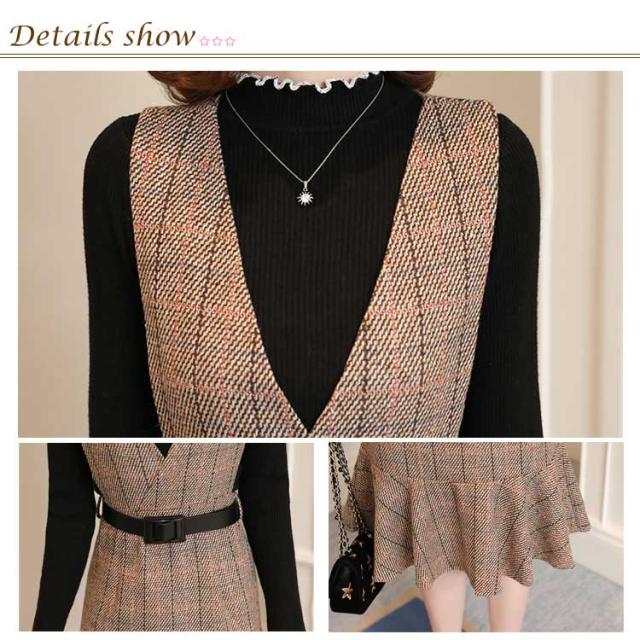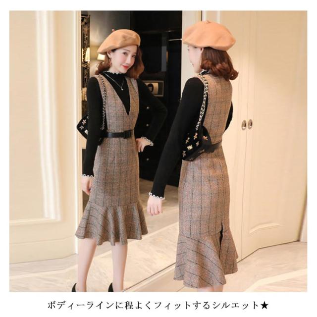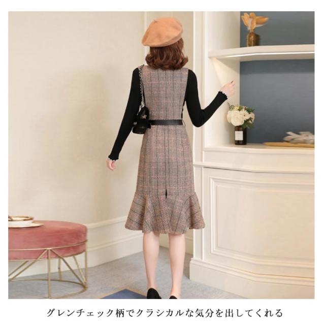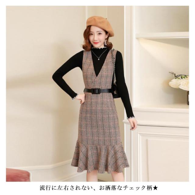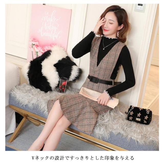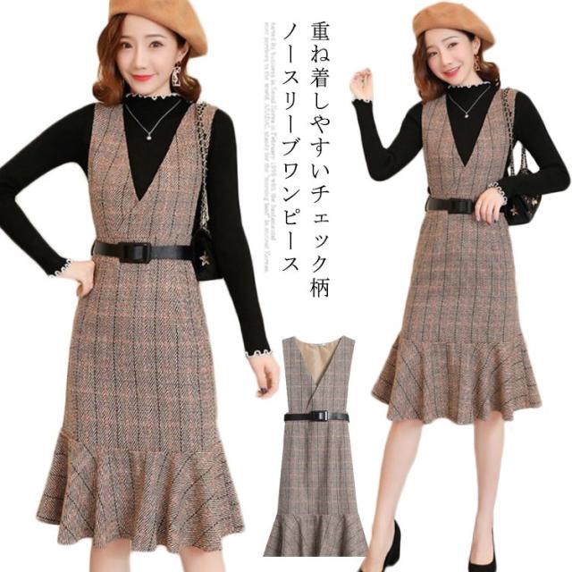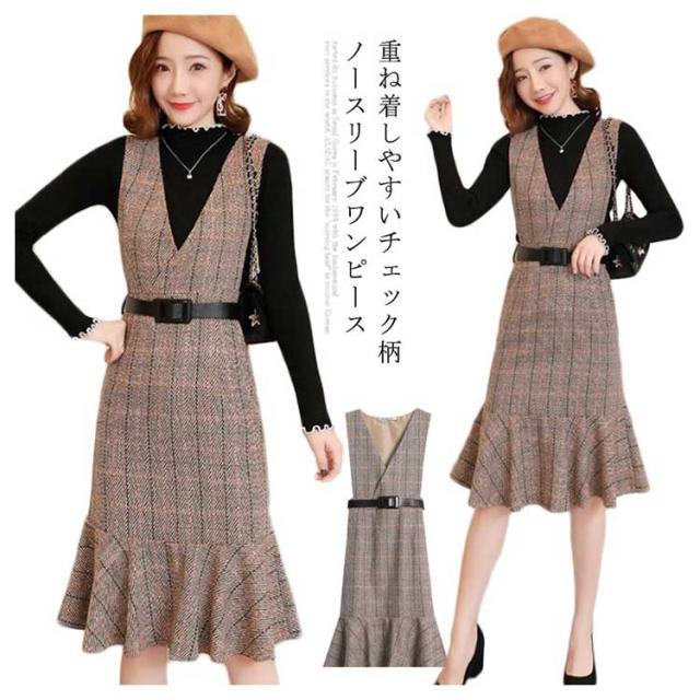 ブリットチェック レディース ワンピース リメイク風ワンピース ノースリーブ ジャンパースカート Vネック ミディアム丈 ラシャ お洒落 重ね着 レイヤード 春秋 2020春新作