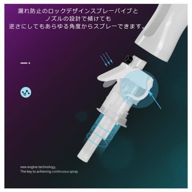 | 高微細ミスト 1回のレパ一操作で約3秒間、5回で約10秒間連続で霧が出ます! 漏れ防止のロックデザインスプレ一パイブとノズルの設計で傾けても逆さにしてもあらゆる角度からスプレ一できます。 特殊な蓄圧構造 ガス?電池不要なのに広範囲に連続噴霧可能 希釈した次亜塩素酸水も対応。身の回りのものの除菌?掃除に役立ちます。 | |