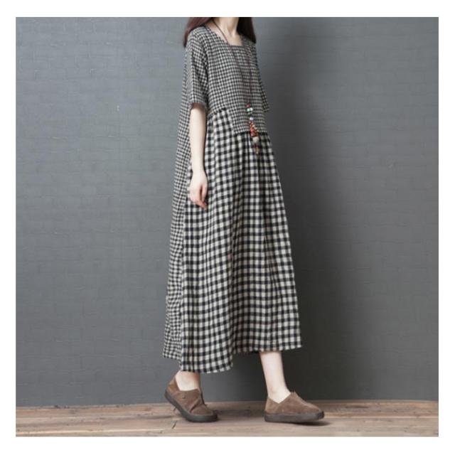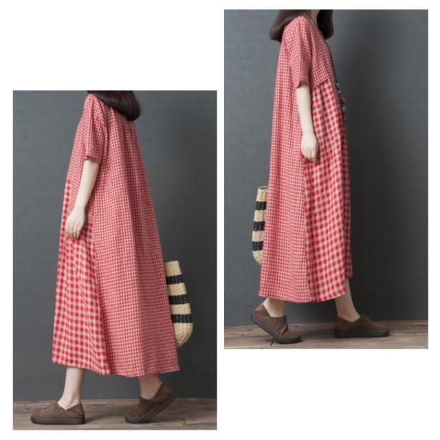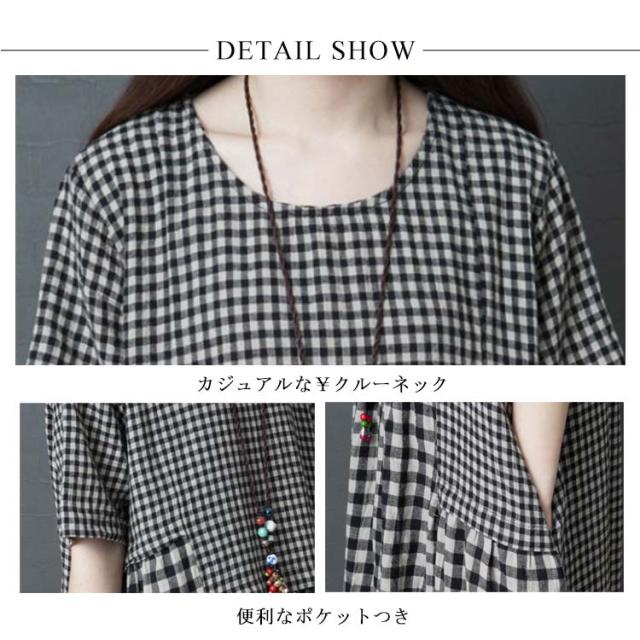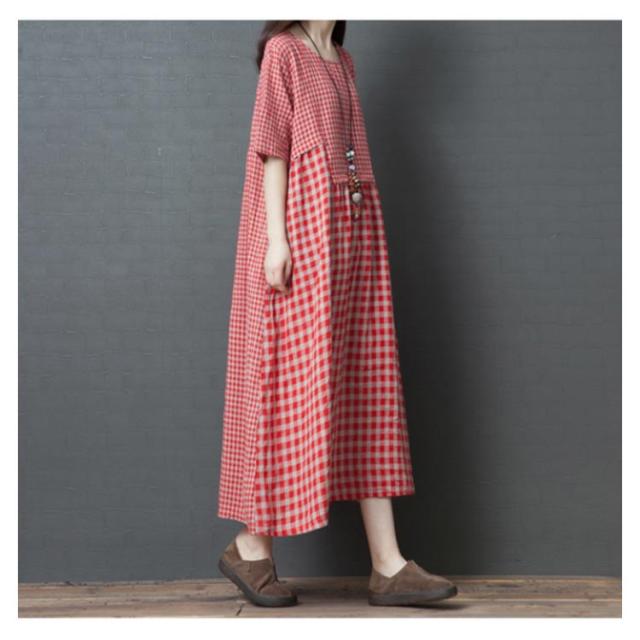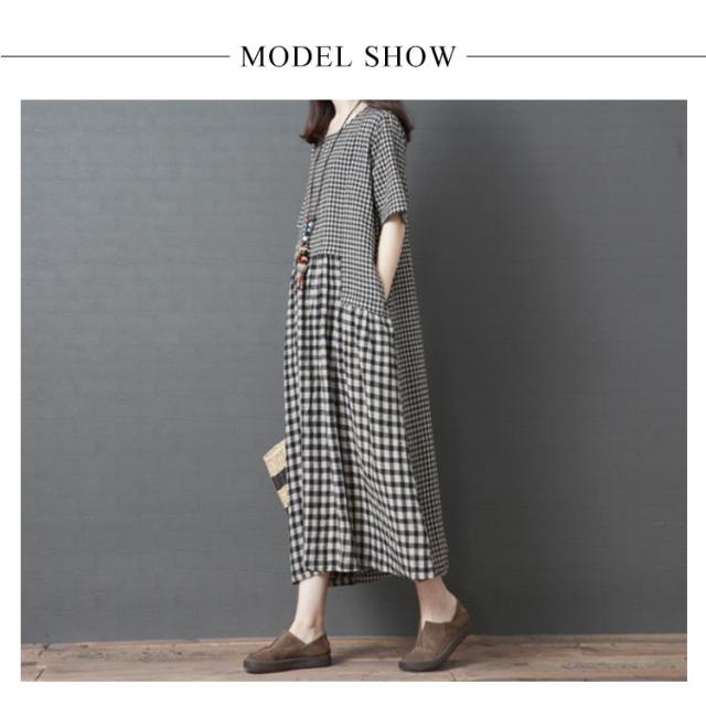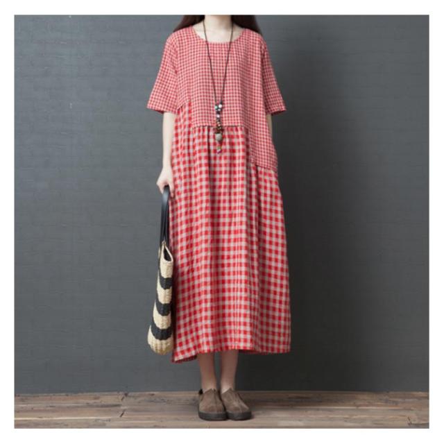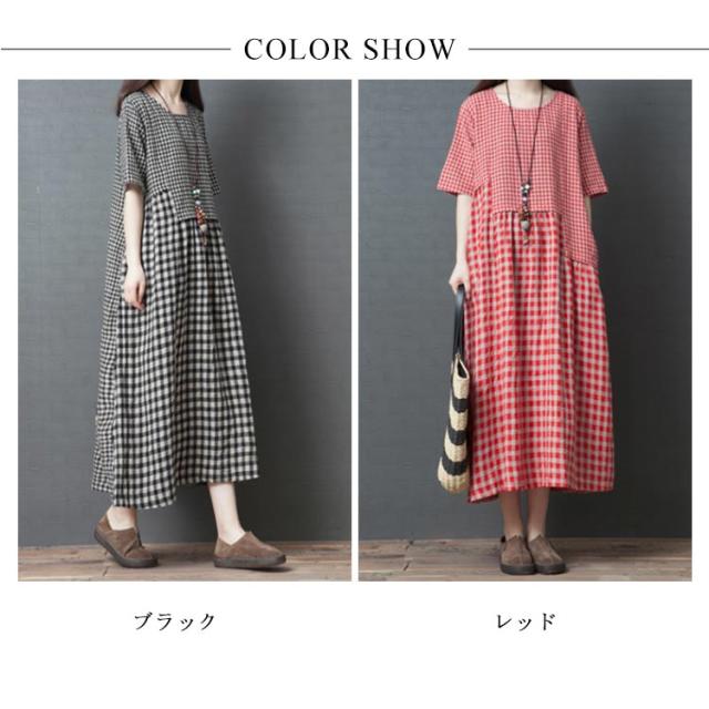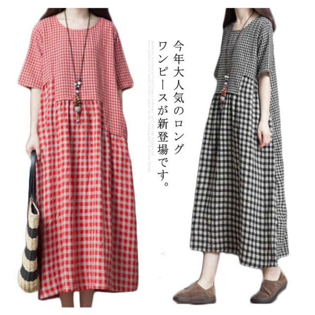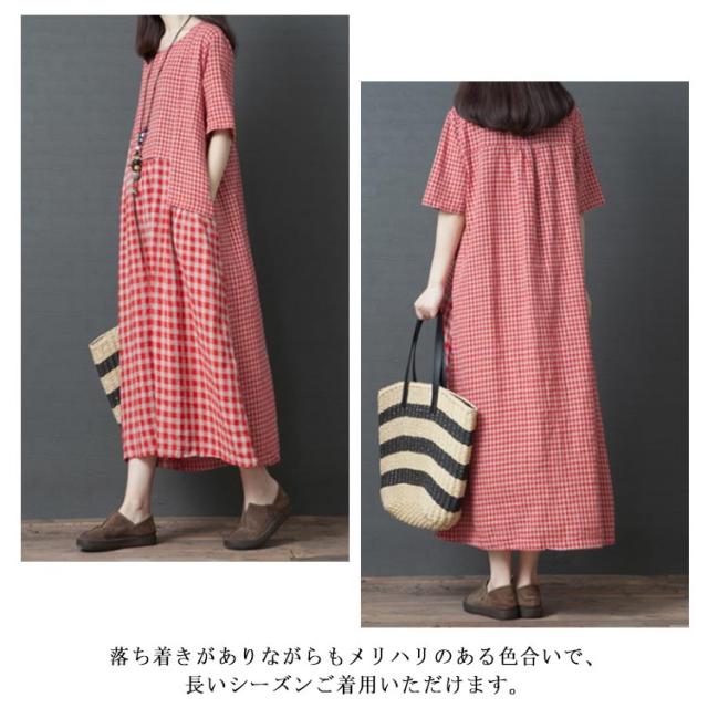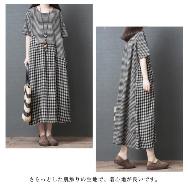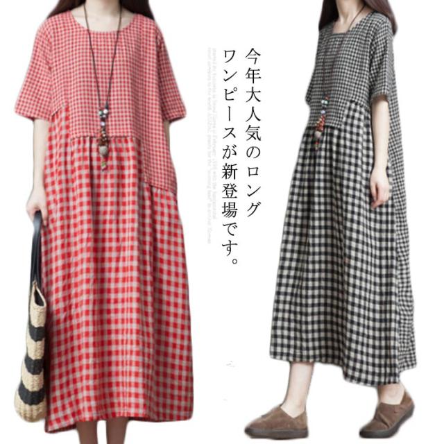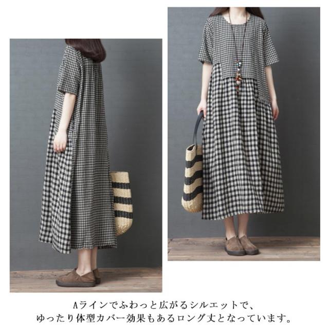 ロングワンピース マキシ丈ワンピース フレアワンピース 半袖 クルーネック ゆったり チェック柄 ドッキング リラックス 綿麻 大人 可愛い マタニティ レディース 新作
