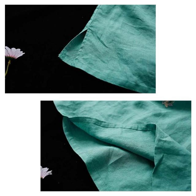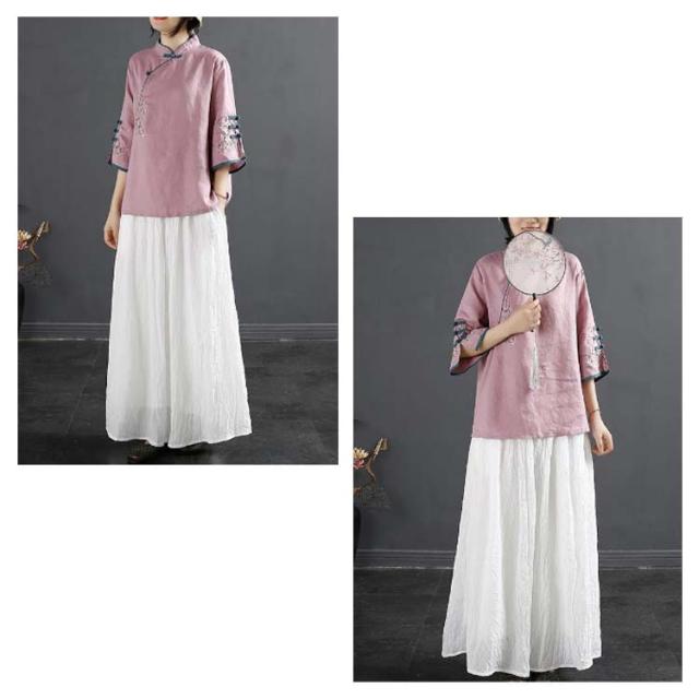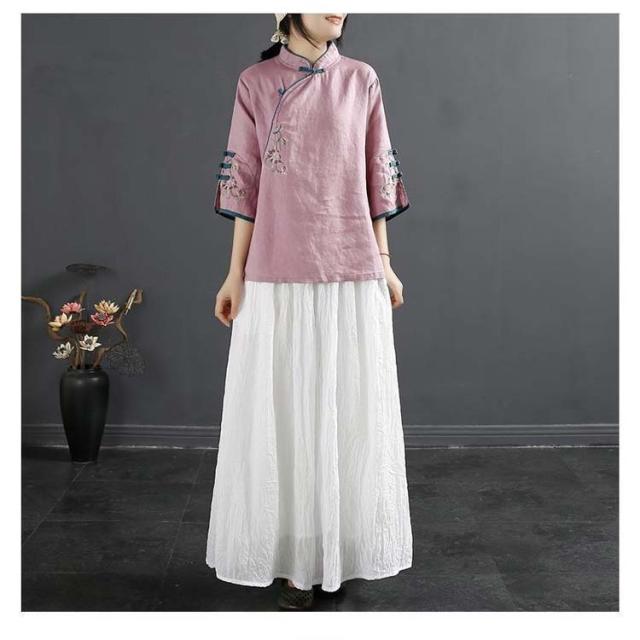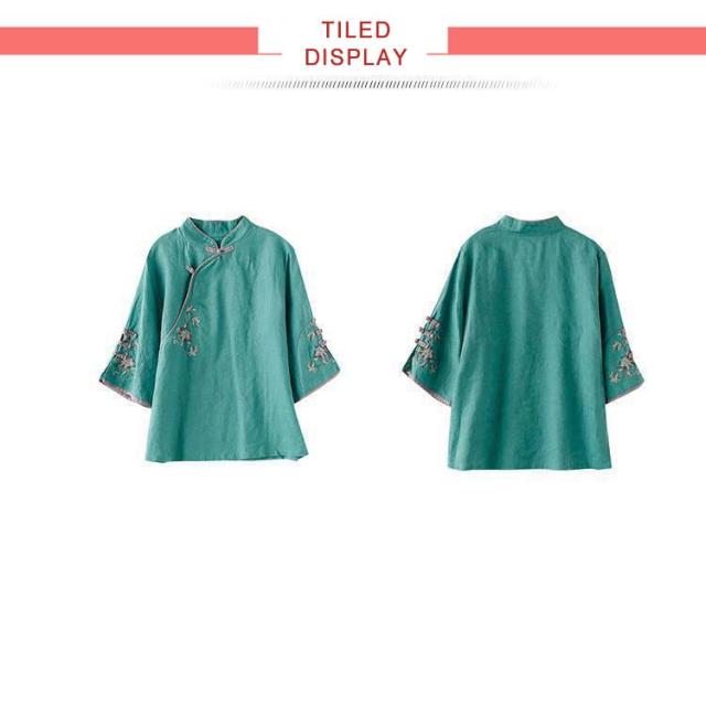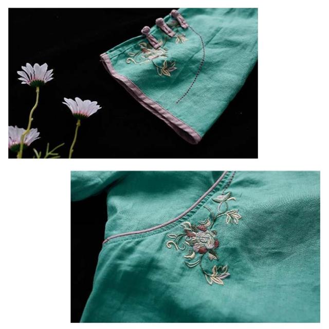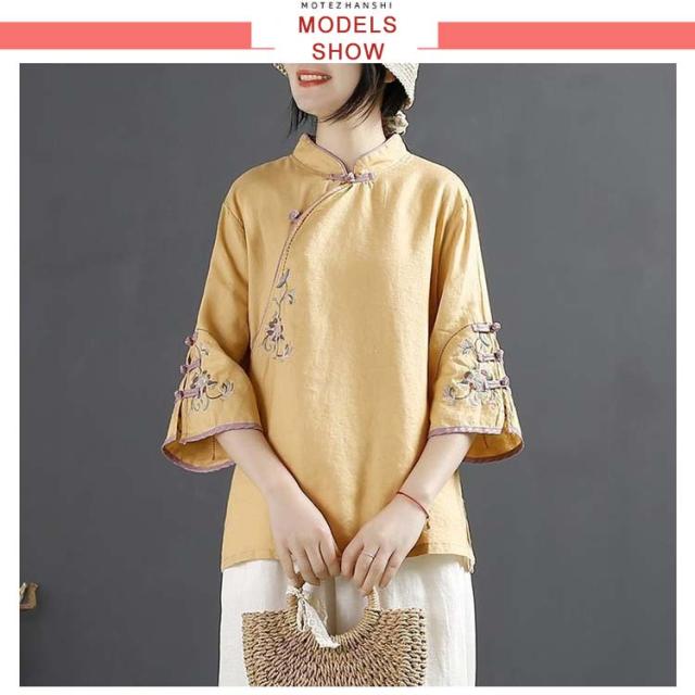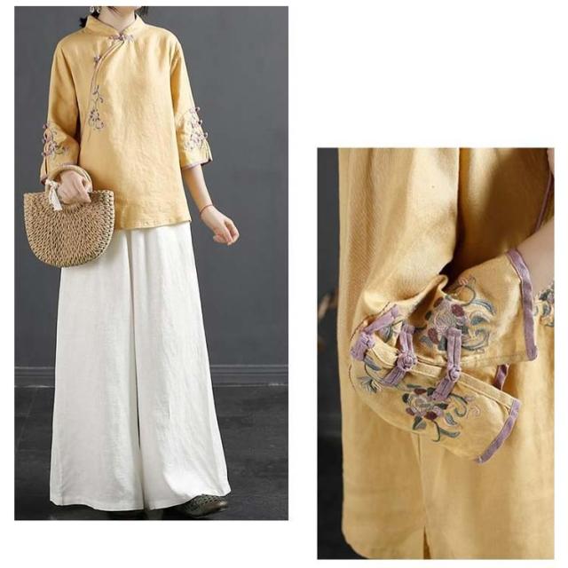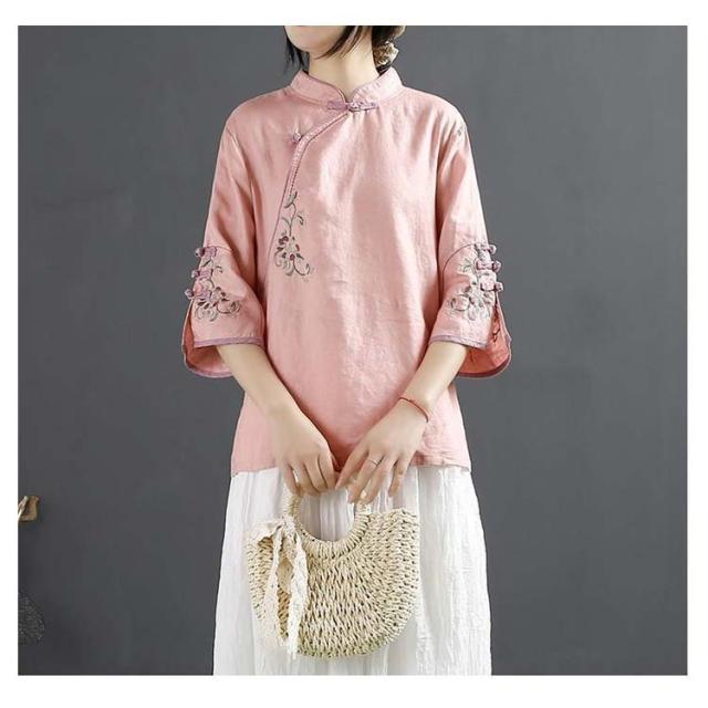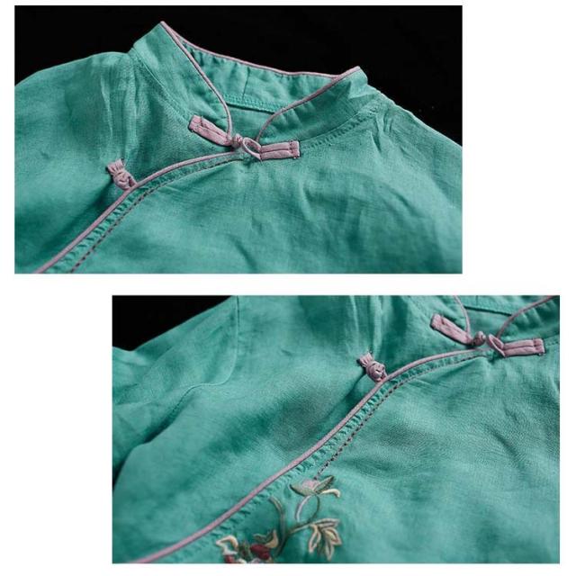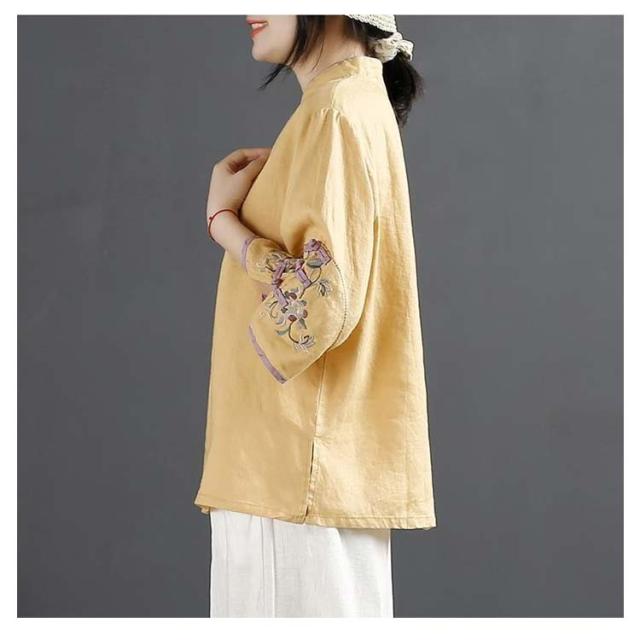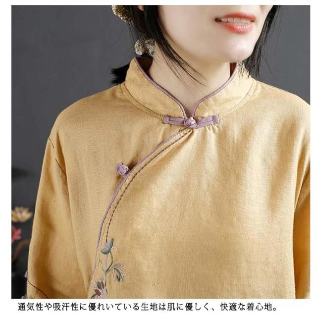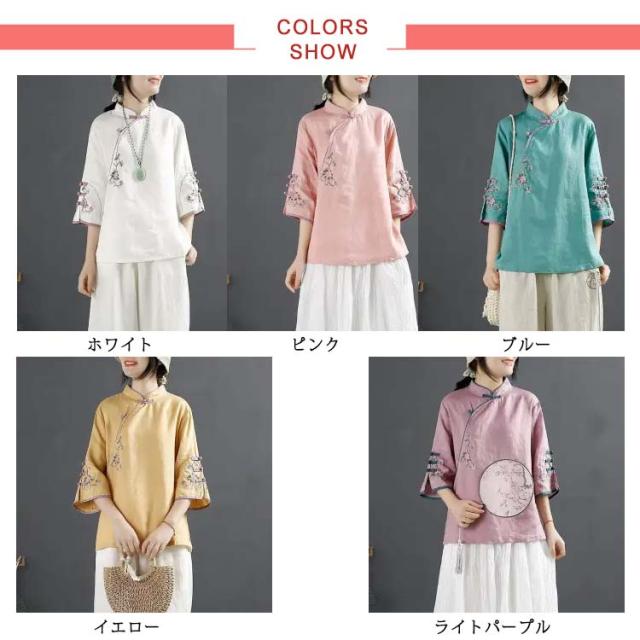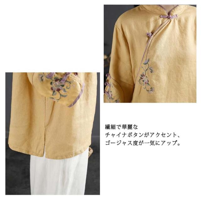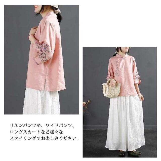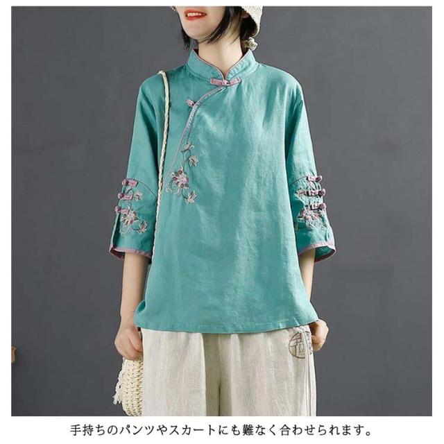 チャイナボタン チャイナシャツ 七分袖 プルオーバー リネンブラウス 花柄 刺繍 チャイナ風 薄手 ブラウス レディース 前開き トップス スタンドカラー リネン混 綿麻 ボリューム袖 中国風 ゆったり ナチュラル 夏 エレガント カジュアル 春 大人