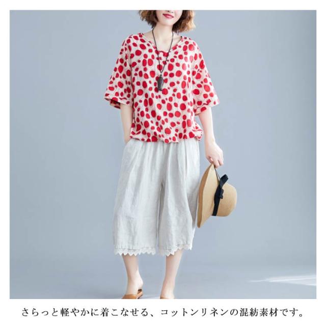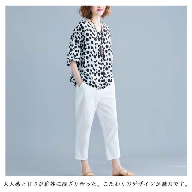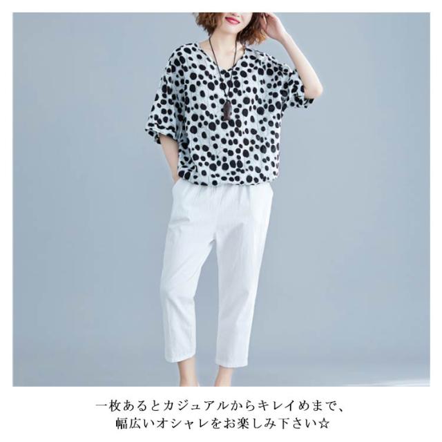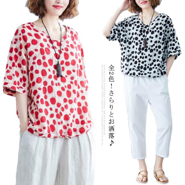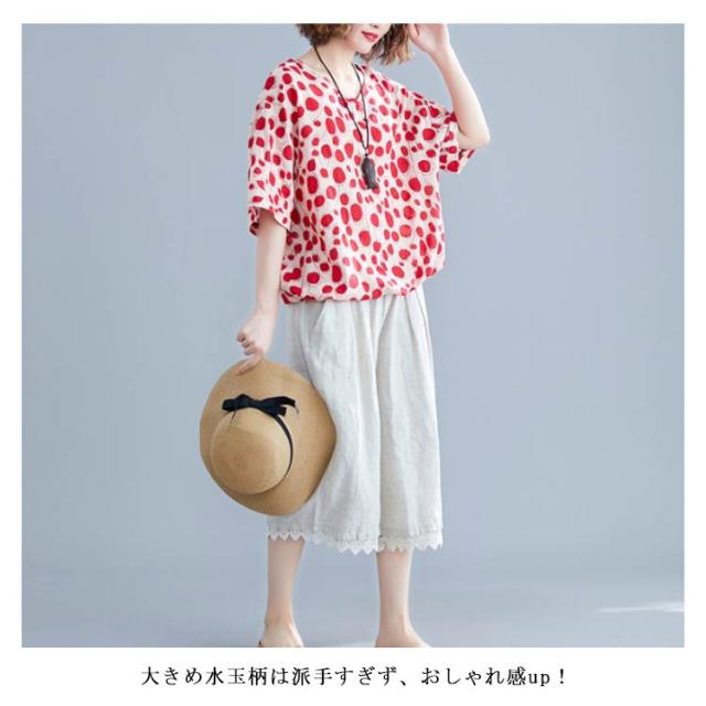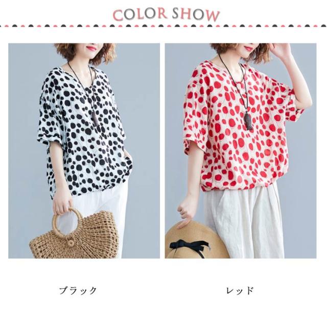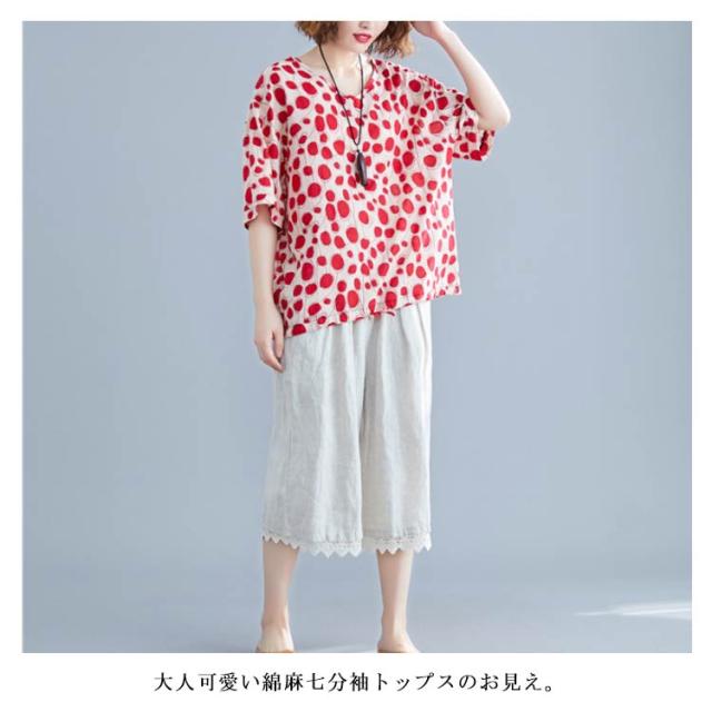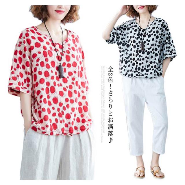 水玉柄tシャツ 綿麻 トップス プルオーバー ブラウス ドット柄 半袖tシャツ 大きサイズ ゆったり 七分袖 半袖 カジュアル 夏 レディース
