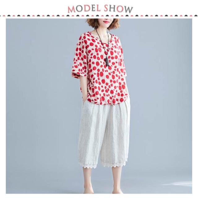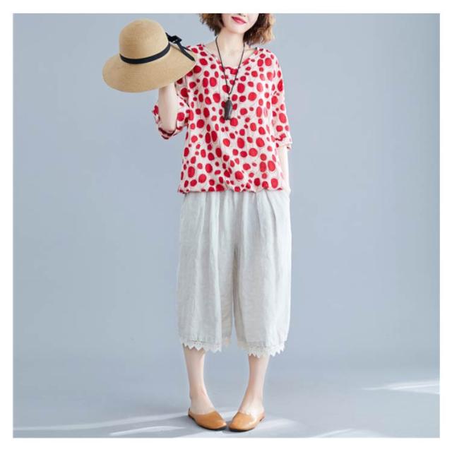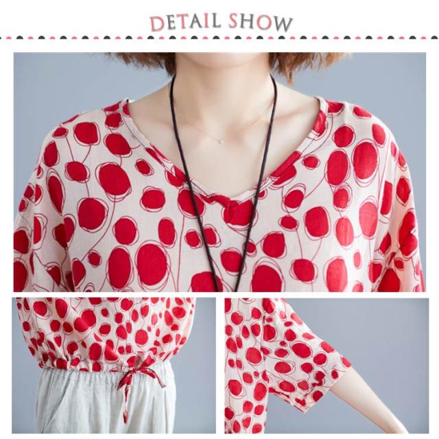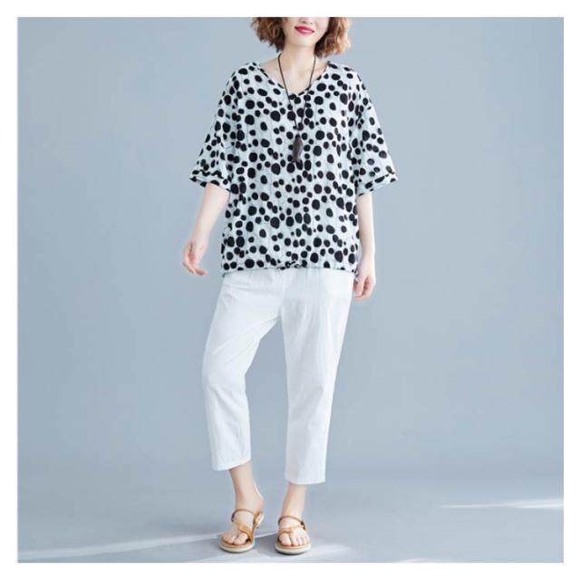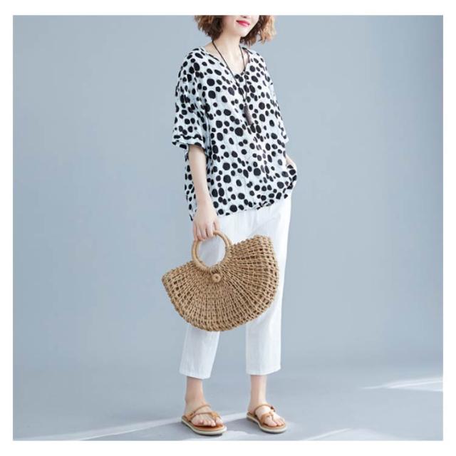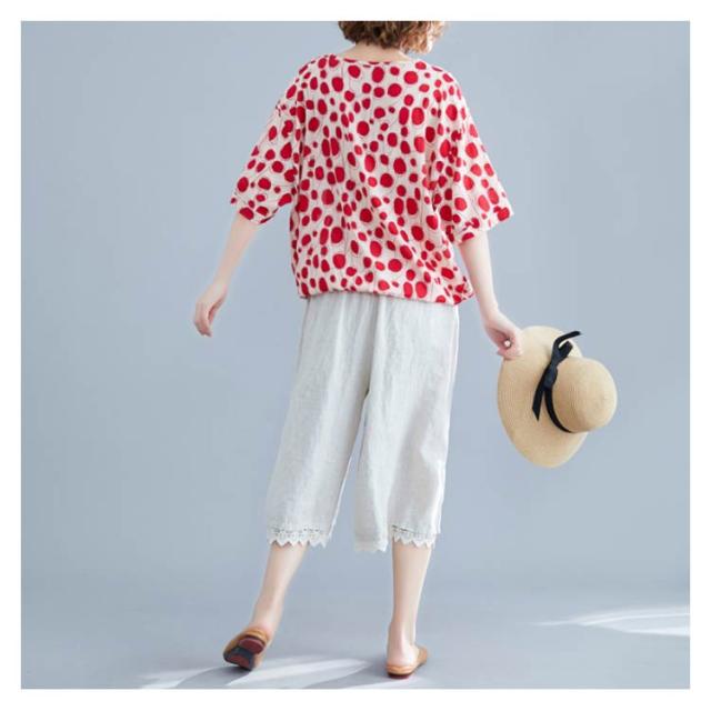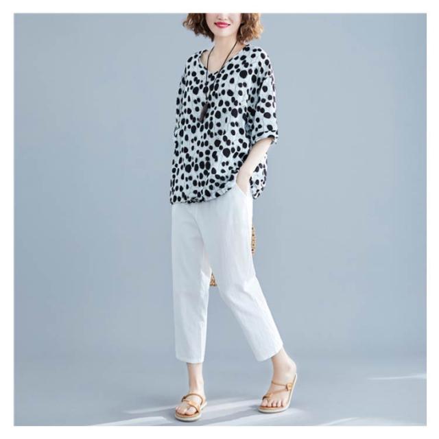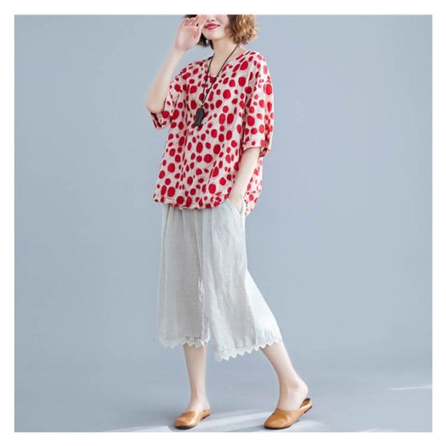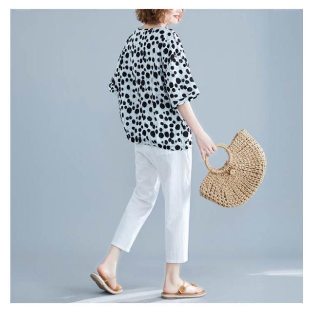 水玉柄tシャツ 綿麻 トップス プルオーバー ブラウス ドット柄 半袖tシャツ 大きサイズ ゆったり 七分袖 半袖 カジュアル 夏 レディース