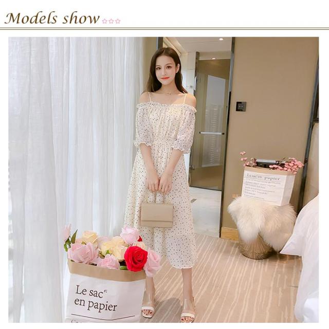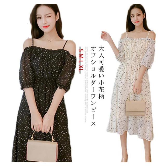 オフショルダー レディース ワンピース シフォンワンピース マキシ丈ワンピース ロングワンピース 五分袖 オフショルワンピース ボリュームスリーブ 肩開き 肩見せ 小花柄 フリル 薄手 お洒落 大人可愛い カジュアル 夏物 夏新作