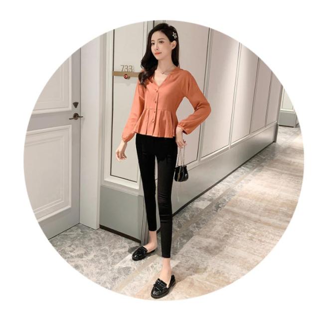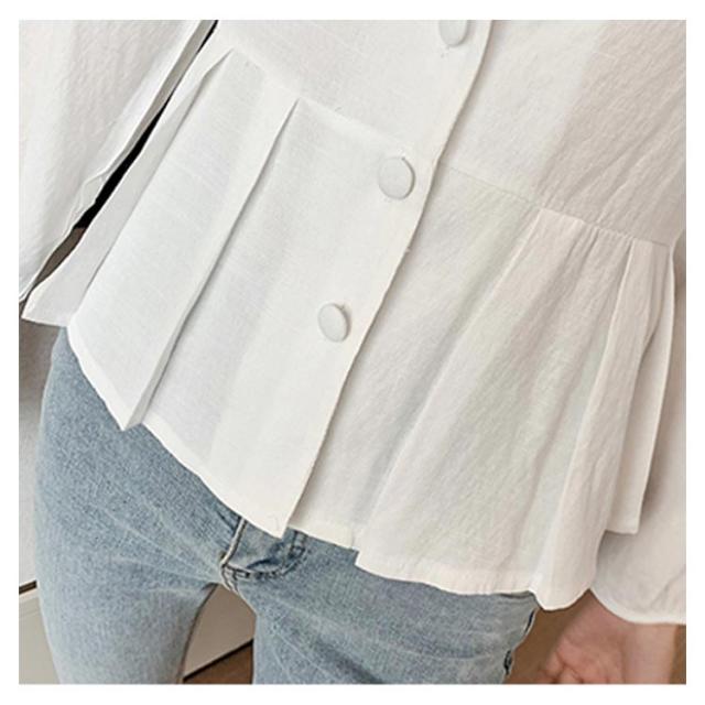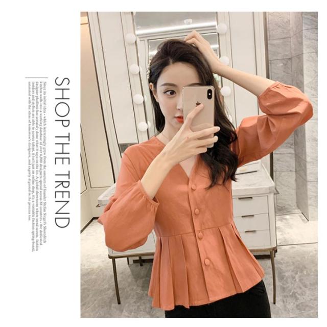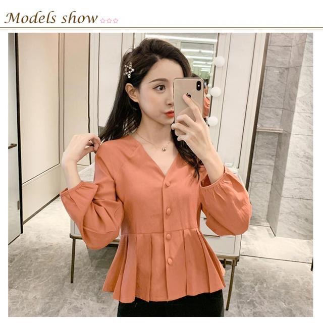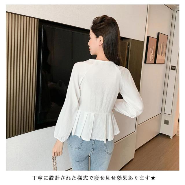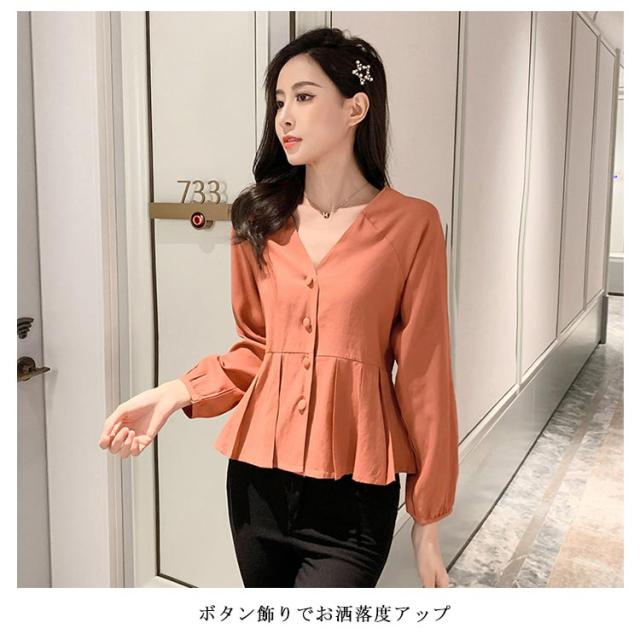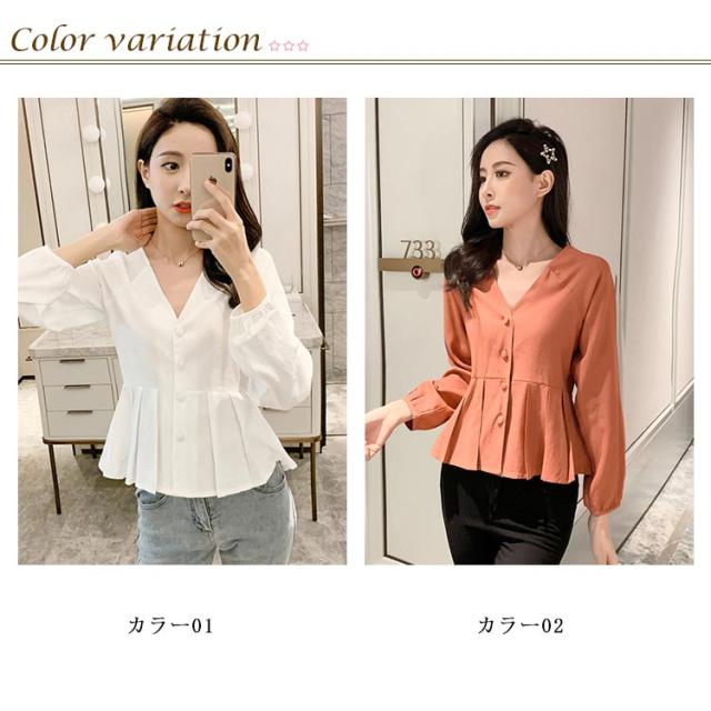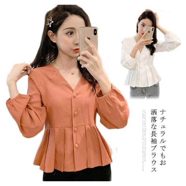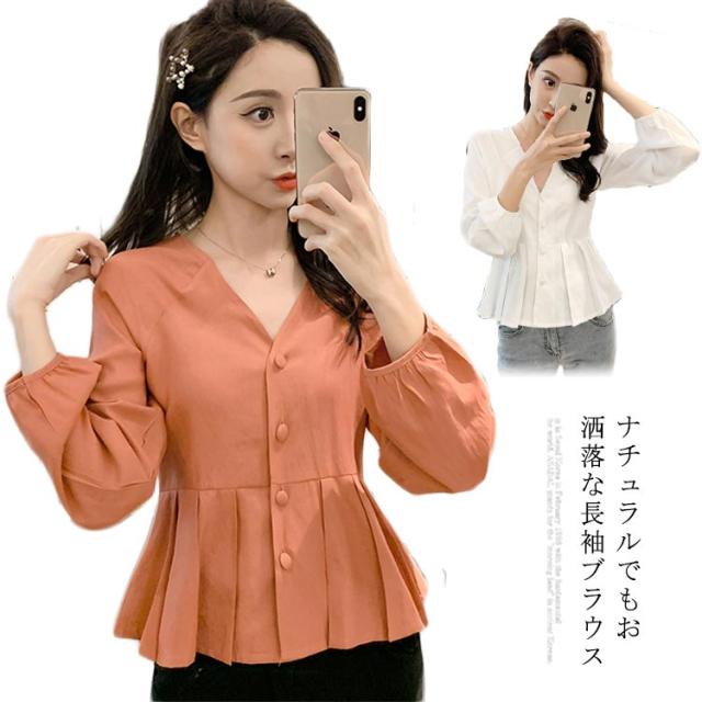 | ナチュラルでもお洒落な長袖ブラウス ウェスト締める様式でフェミニンな感じになります やや広めのVネック様式で鎖骨を綺麗に見せます ボタン飾りでお洒落度アップ いい肌触りを持っています | |