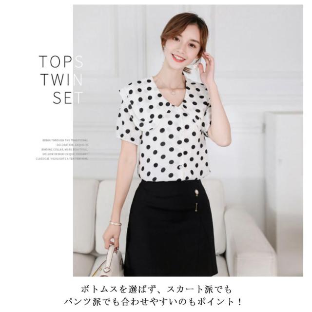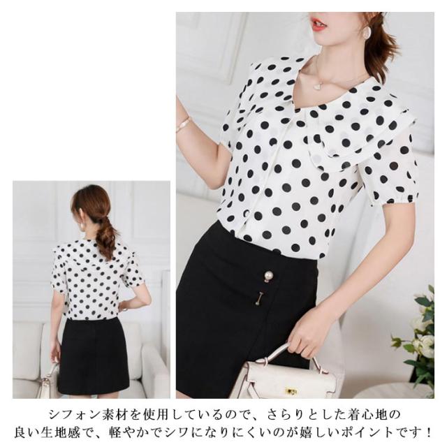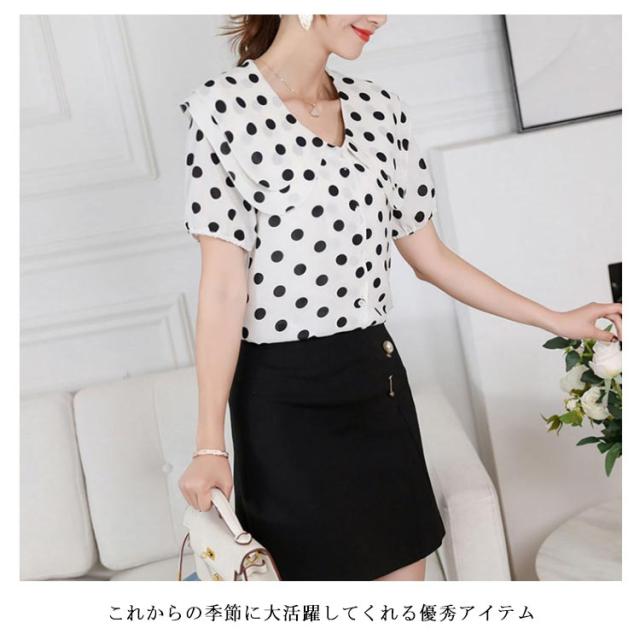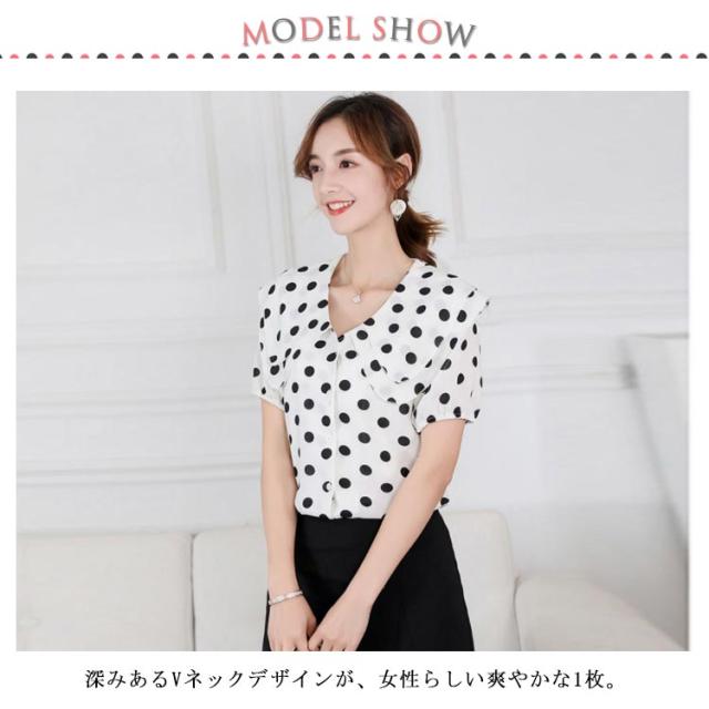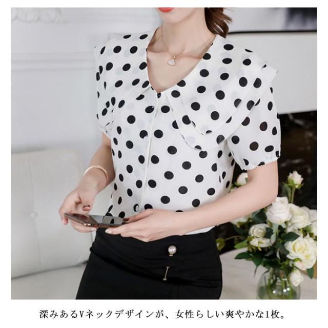 シフォンブラウス ドット柄 半袖ブラウス Vネック シャツ ブラウス 水玉 大きめ襟 トップス 半袖 シフォン 薄手 レディース 夏