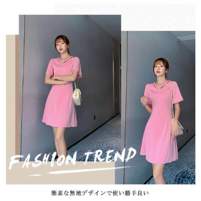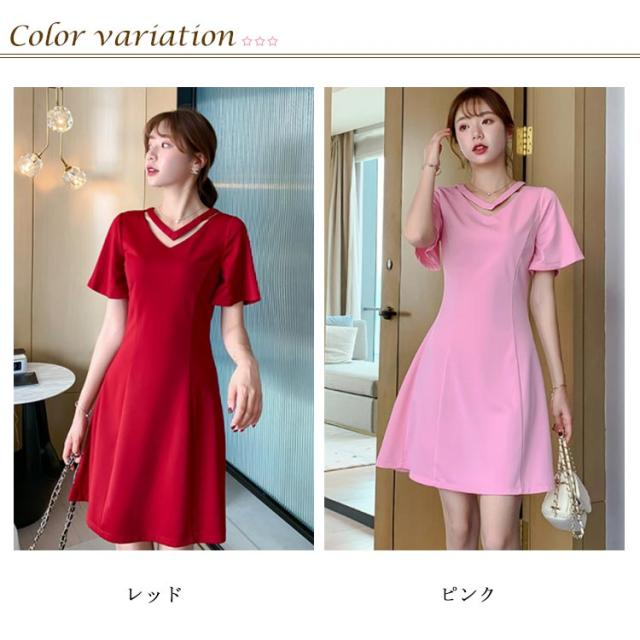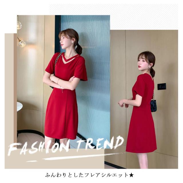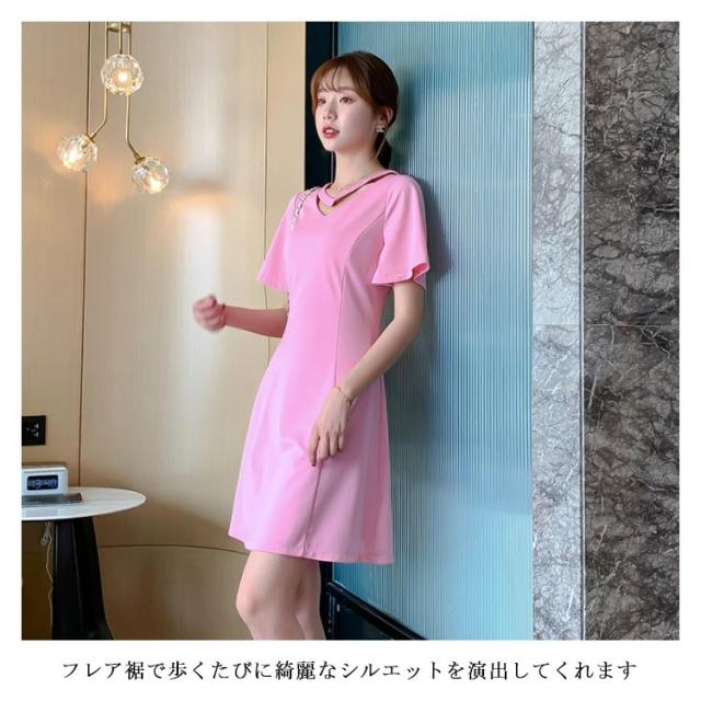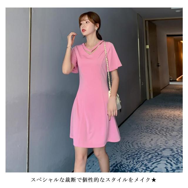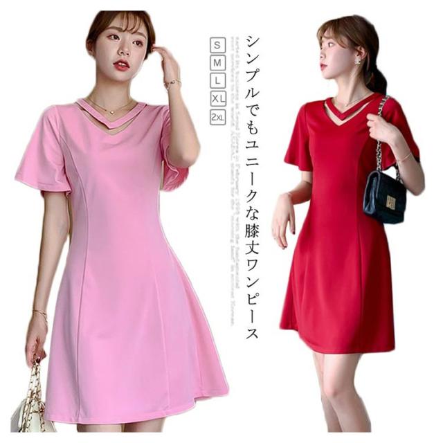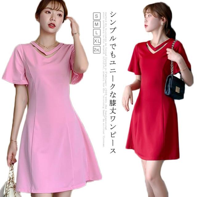 ワンピース レディース 膝丈ワンピース 半袖ワンピース ショートワンピース ドレス フレア裾 Vネック 無地 シンプル カジュアル 上品 かわいい 体型カバー お洒落 キレイめ オフィス 着痩せ 大きいサイズ 夏新作
