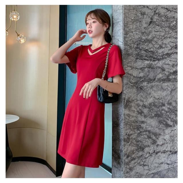 | シンプルでもユニークな膝丈ワンピース 簡素な無地デザインで使い勝手良い スペシャルなVネックラインで鎖骨を綺麗に出します フレア裾で歩くたびに綺麗なシルエットを演出してくれます | |