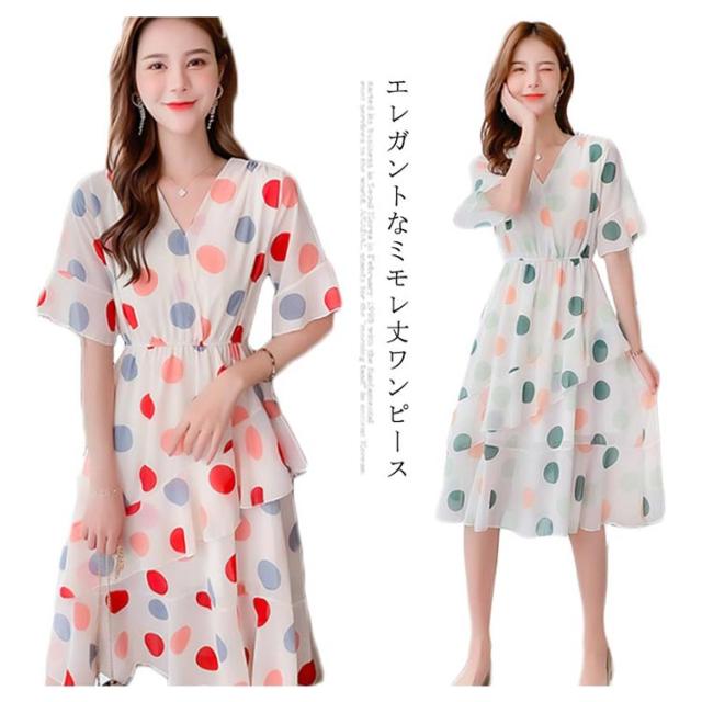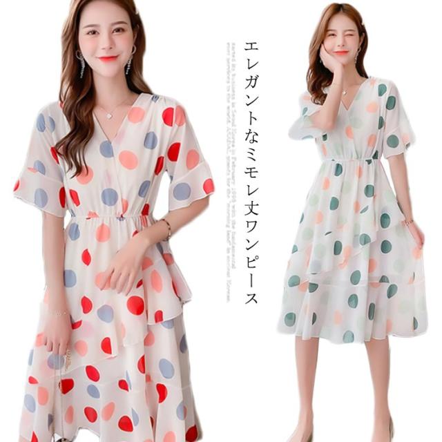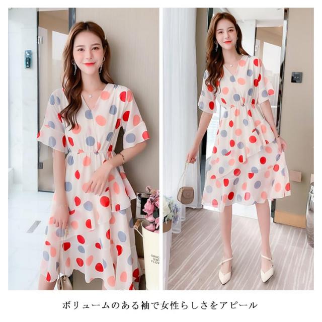 ワンピース レディース ミモレ丈ワンピース 膝下丈ワンピース シフォンワンピース ティアードワンピース ドット柄ワンピース 半袖 水玉柄 フレア ミモレ丈 Vネック Aライン 大人 キレイめ エレガント