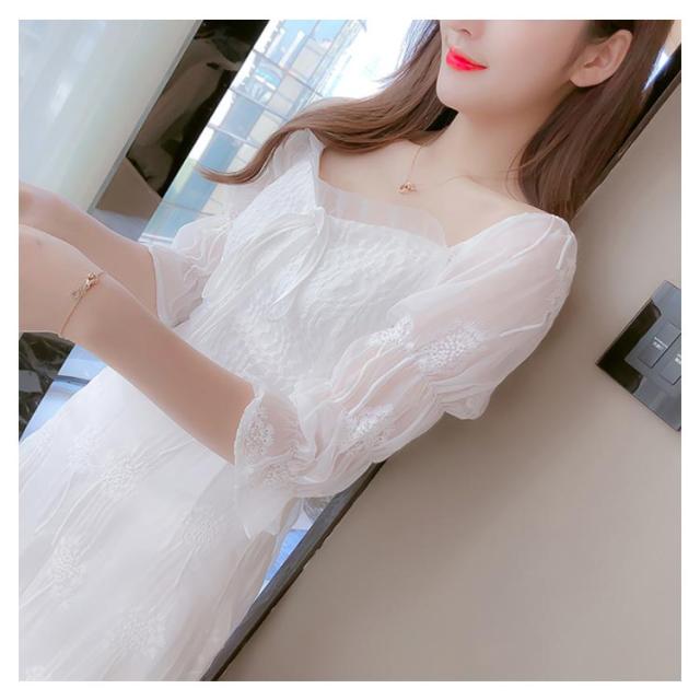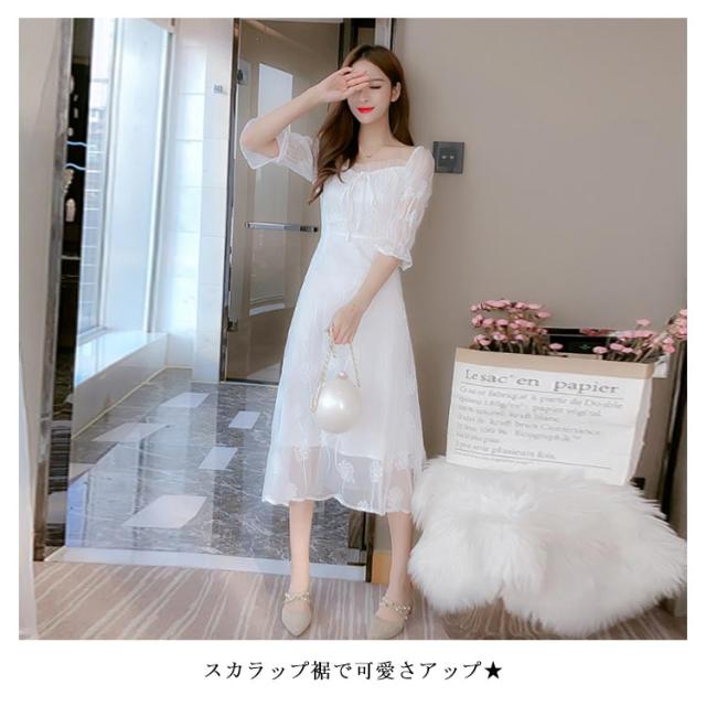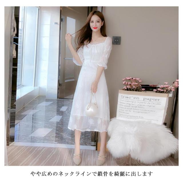 ワンピース レディース ミモレワンピース ロングワンピース 刺繍ワンピース レース チュール 五分袖ワンピース ロング丈 シャーリング 無地 エレガント 透け感 裏地付き フェミニン キレイめ お洒落 春夏 夏新作