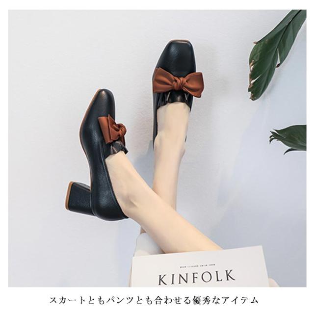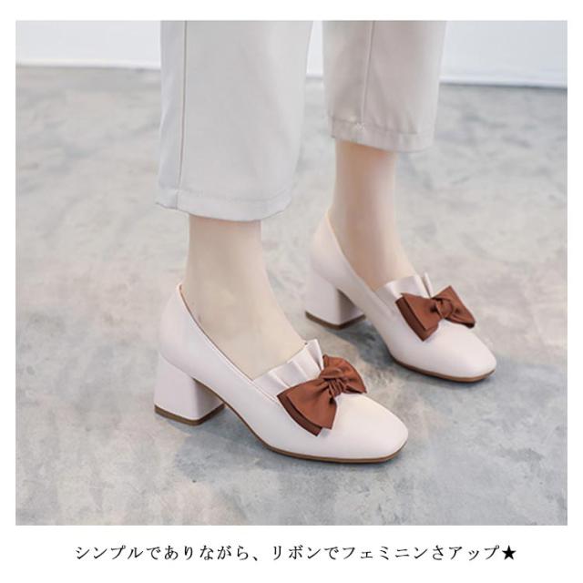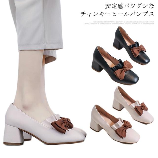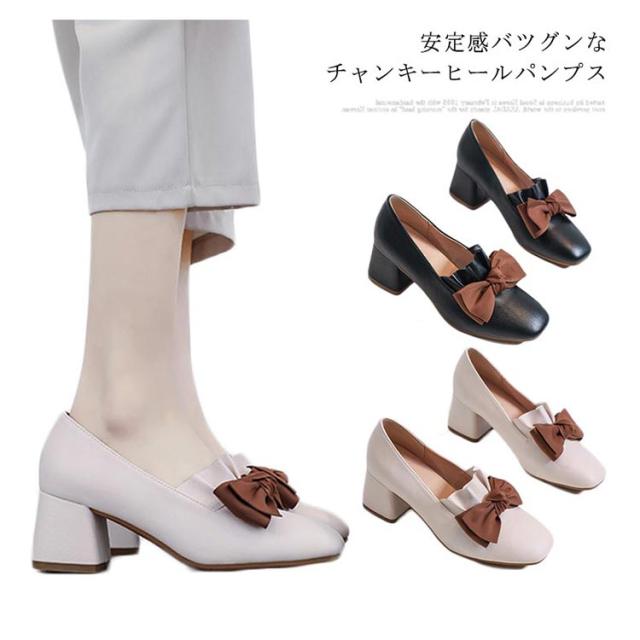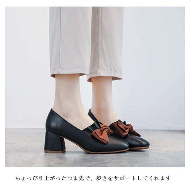 パンプス レディース チャンキーヒール リボン PUレザー フェイクレザー レザーパンプス エナメル調 太ヒール スクエアトゥ ツヤなし 疲れにくい 痛くない お洒落 こなれ感 大人 シューズ