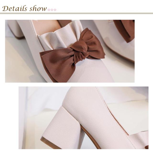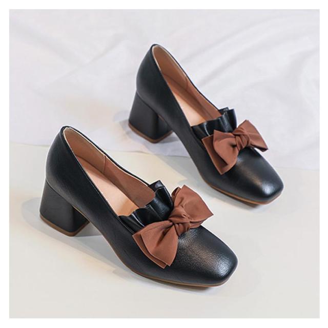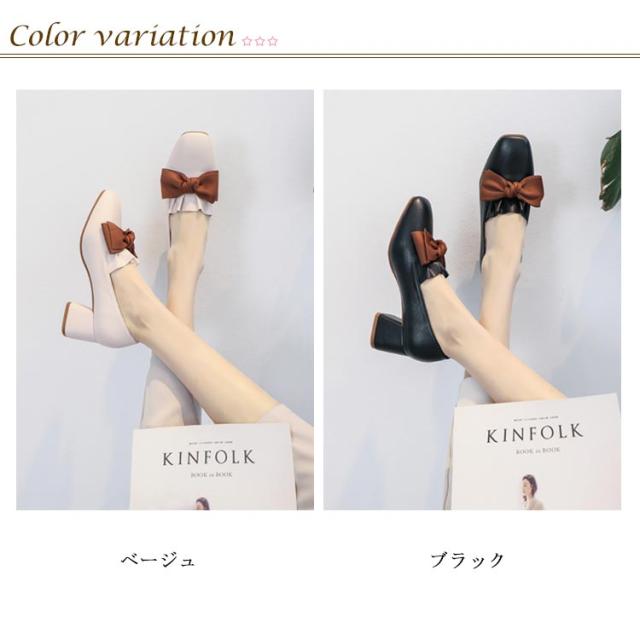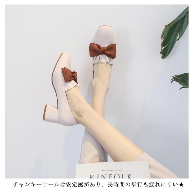 | 安定感バツグンなチャンキーヒールパンプス ちょっぴり上がったつま先で、歩きをサポートしてくれますリボン付き仕様で大人可愛さをアピールスカートともパンツとも合わせる優秀なアイテム 選べるな2カラー展開となります | |