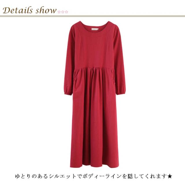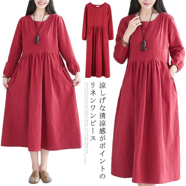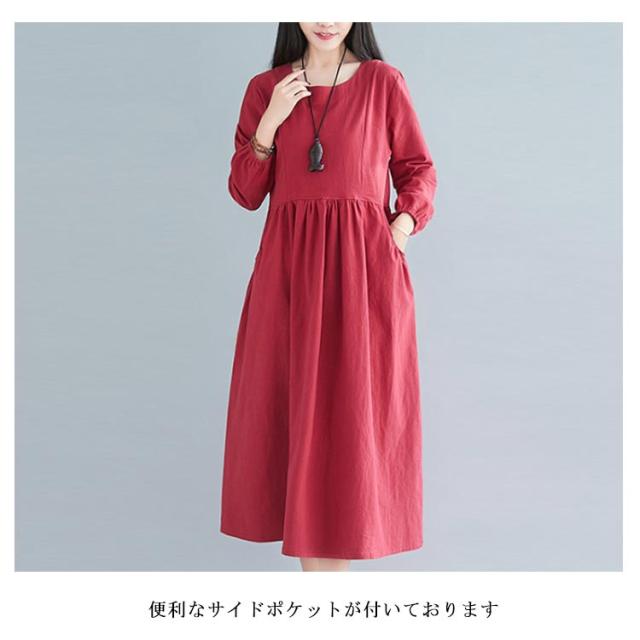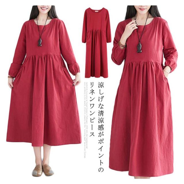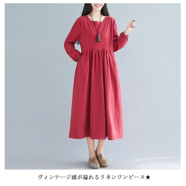 リネンワンピース リネン ワンピース レディース 綿 麻 綿麻 麻生地 マキシワンピース 長袖 ロングワンピース ラウンドネック 薄手 長袖ワンピース ゆったり お洒落 こなれ感 レトロ 体型カバー 春新作