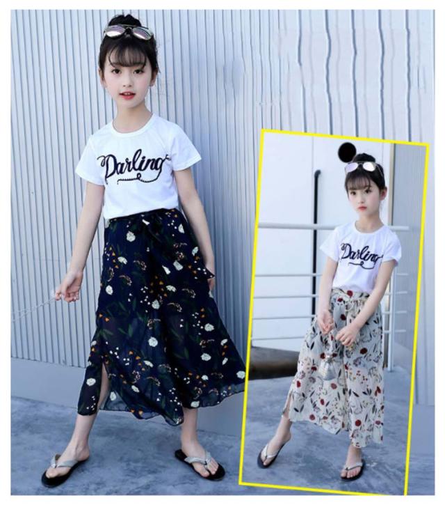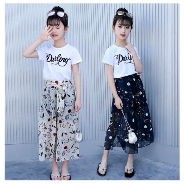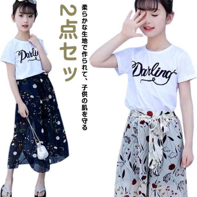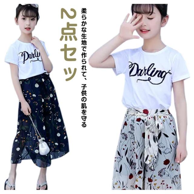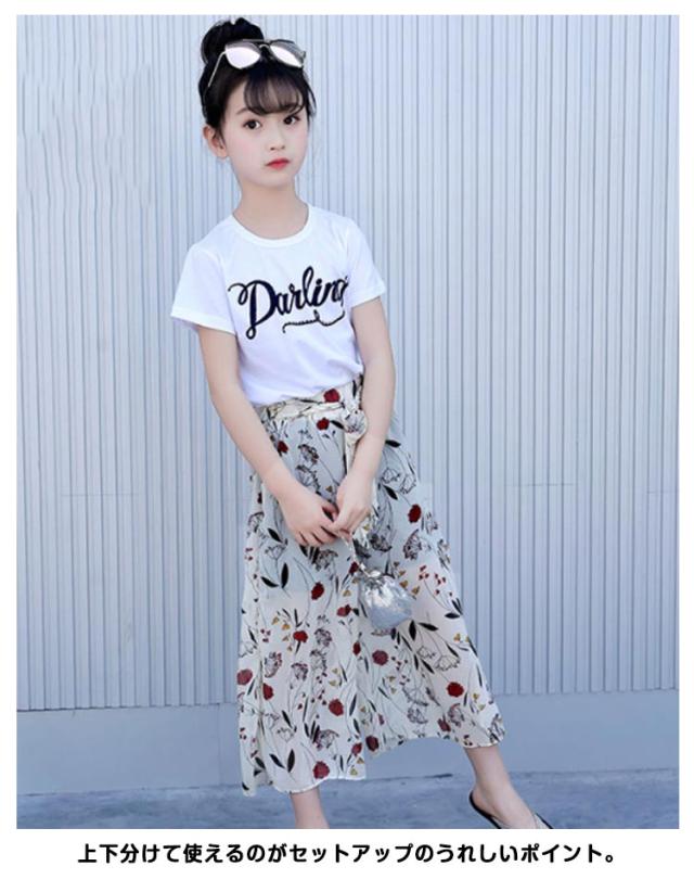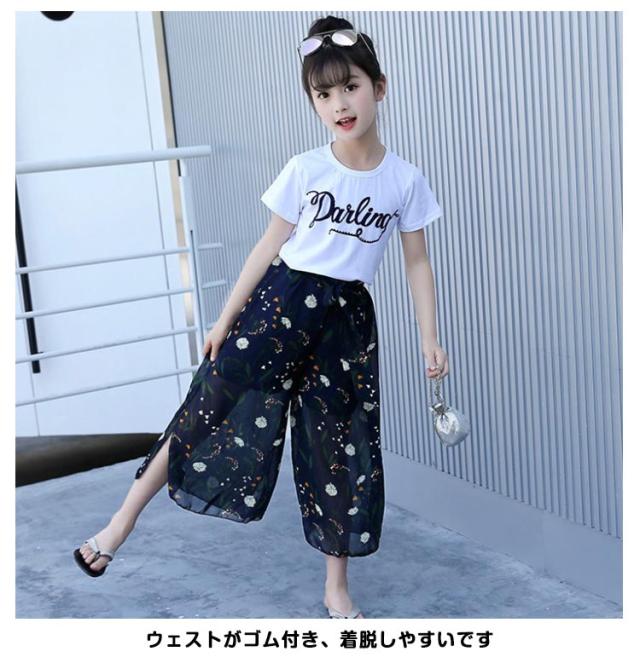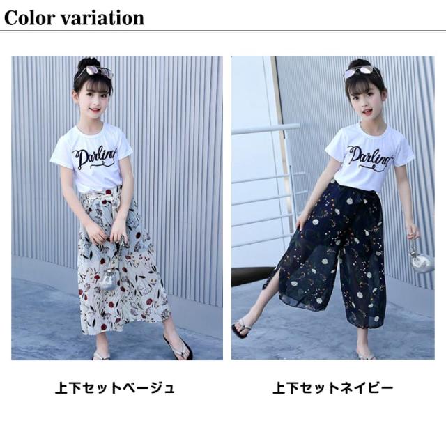 送料無料 2点セット 女の子 セットアップ パンツスーツ キッズ Tシャツ ワイドパンツ カジュアル 夏服 上下セット ジュニア服 カジュアルパンツ 可愛い 花柄 ダンス衣装 おしゃれ お出かけ 普段着 通学着