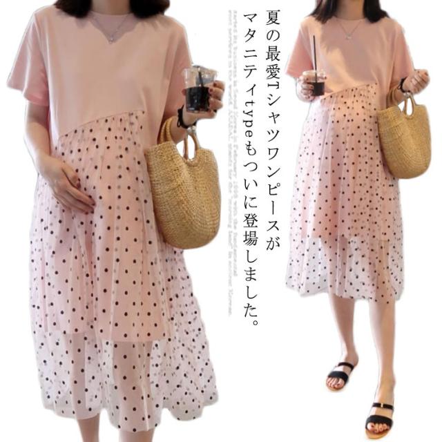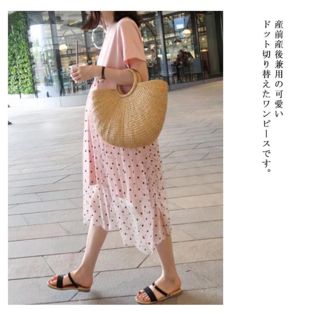 マタニティワンピース ワンピース マタニティ Tシャツワンピース 半袖 夏ワンピース 妊娠用 マタニティ服 切り替え ドット ミディ丈 おしゃれ 可愛い