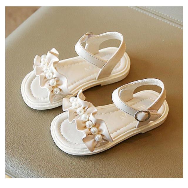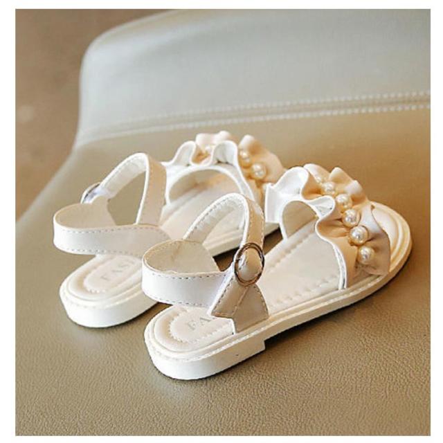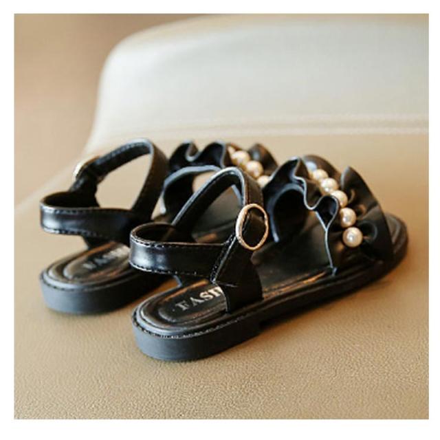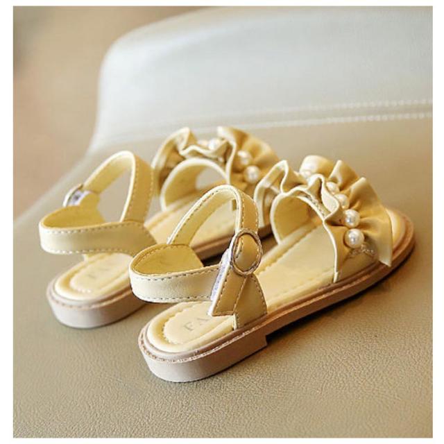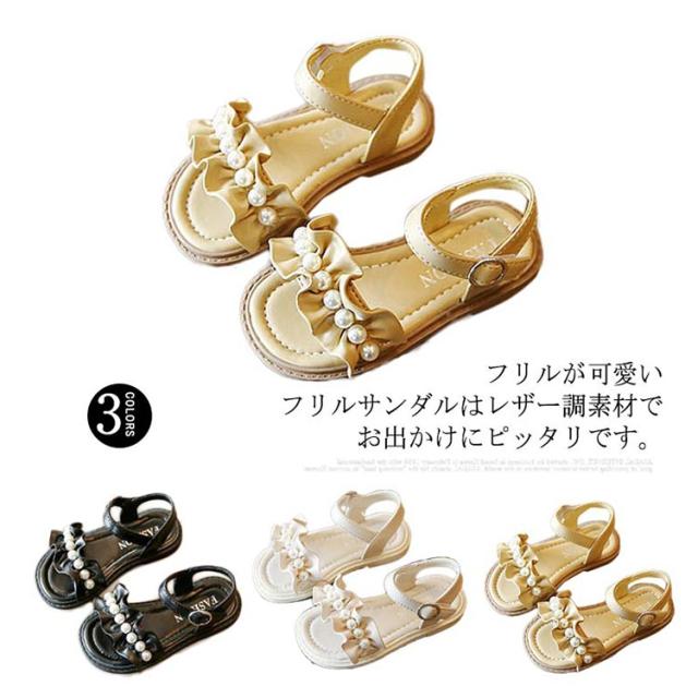 キッズ フリルサンダル パール PU革 レザー 女の子 靴 春 夏 マジックテープ 韓国 子供靴 軽量 フラット 小学生 通園 通学 保育園 中学生 ぺたんこ かわいい 無地 カジュアル おしゃれ イエロー 白 黒