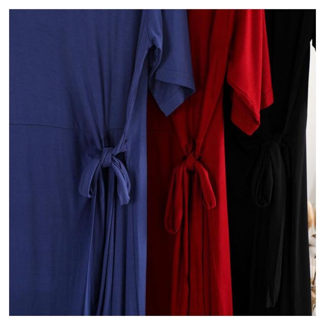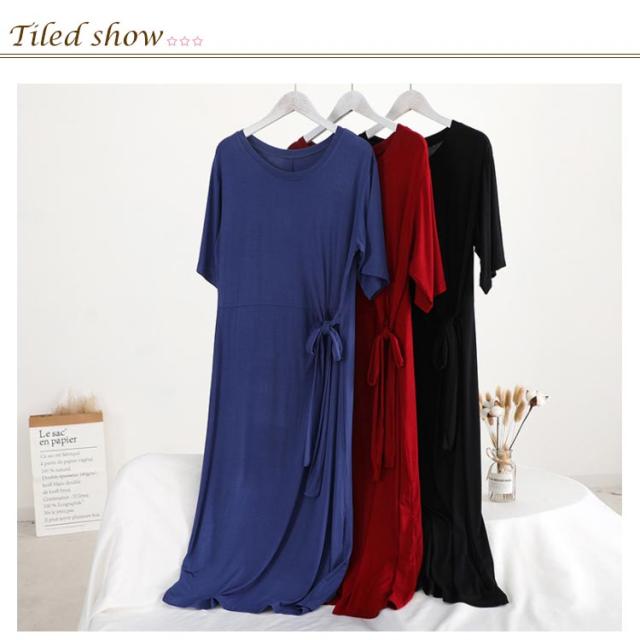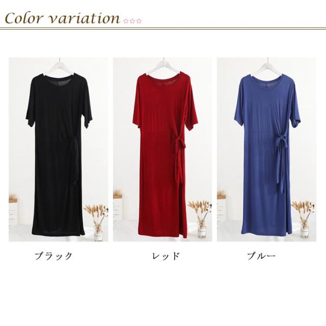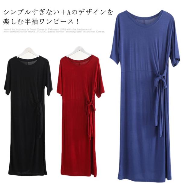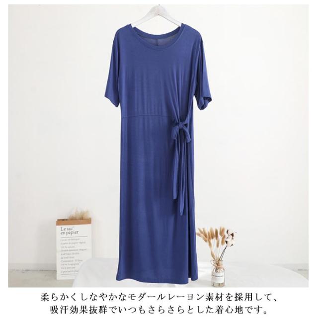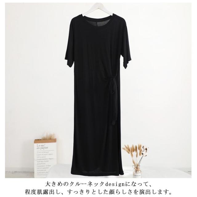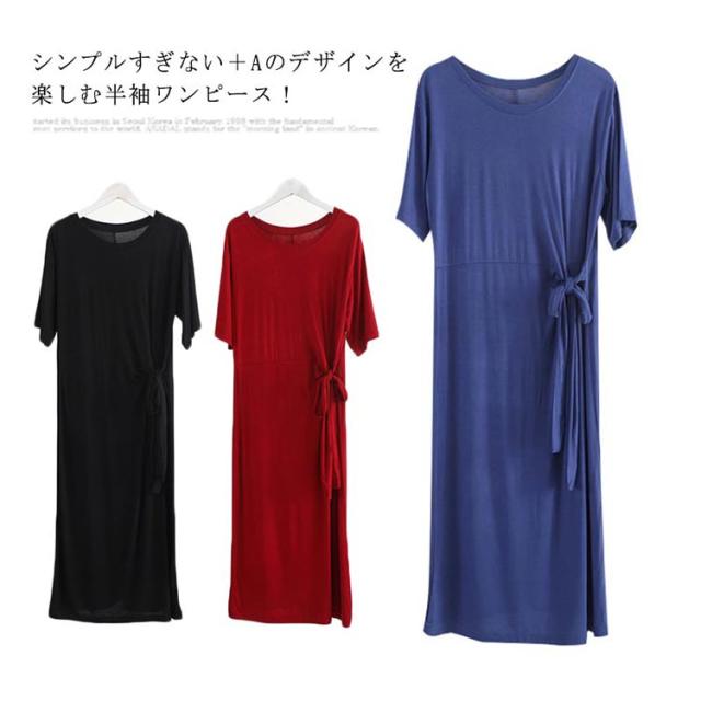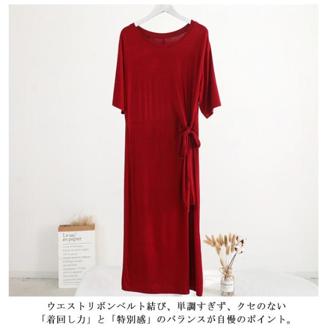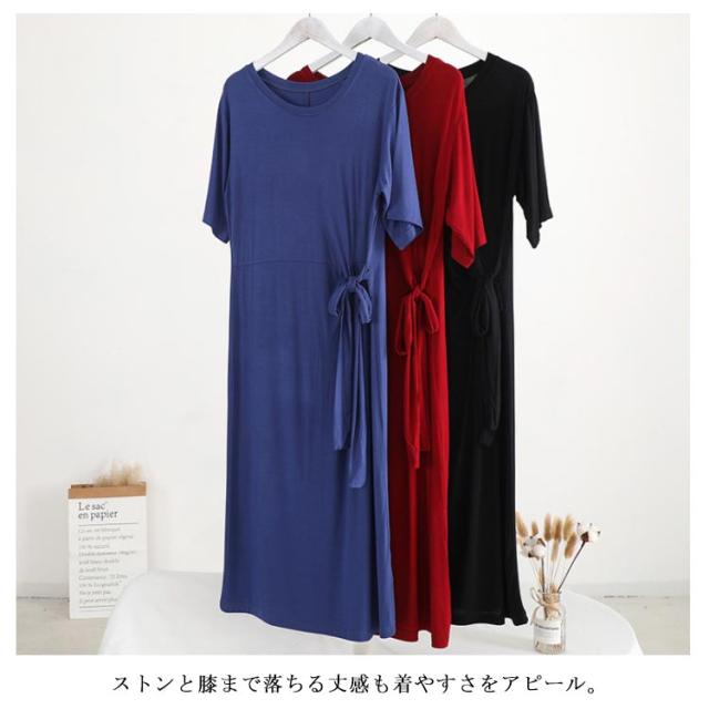 柔らかく滑らかなレーヨン生地感!ワンピース 夏ワンピース サイドリボンベルト付き 半袖ワンピース tシャツワンピース ミディアム丈 無地ワンピース モダール レーヨン 通勤 シンプル おしゃれ 春夏 レディース