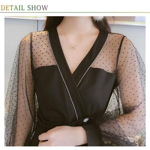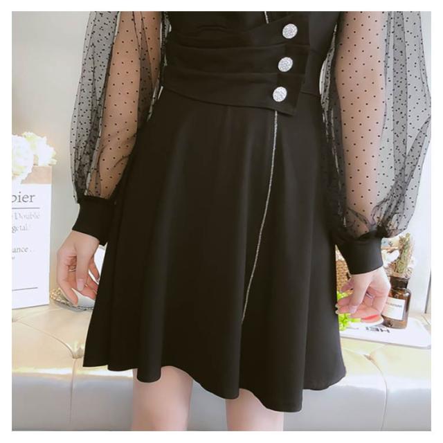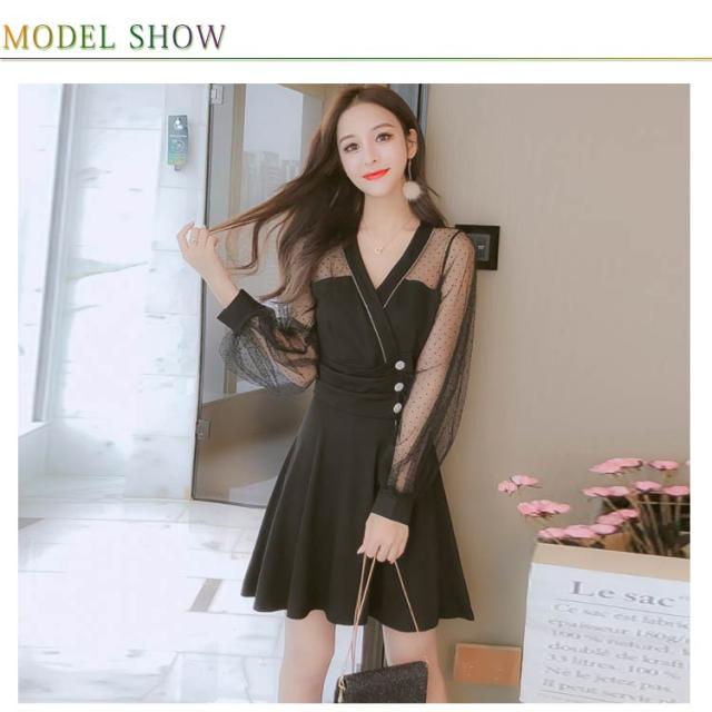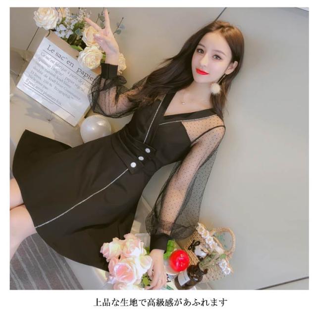 ワンピース レディース ショートワンピース 膝上丈ワンピース チュールワンピース フレアワンピース メッシュ切り替え 長袖 Vネック 無地 ボタン飾り セクシー こなれ感 エレガント 優雅 フェミニン 美脚 脚長 忘年会 二次会 同窓会