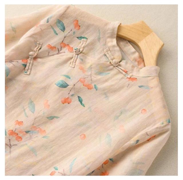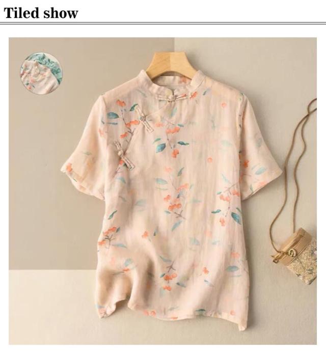 綿麻 ブラウス 花柄 立ち襟 チャイナ風 トップス チャイナボタン 斜めボタン 半袖 総柄 エスニック トップス ゆったり 着痩せ 綿麻 カジュアル レトロ 夏新作 送料無料