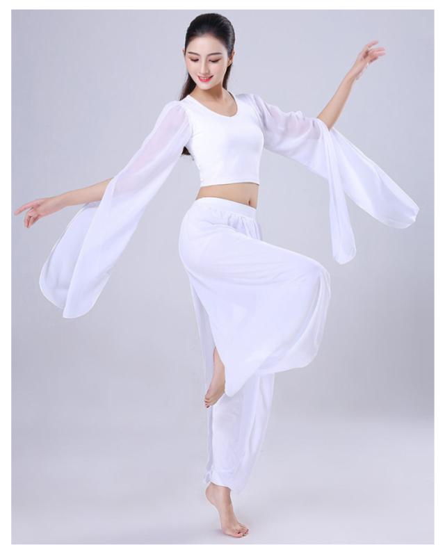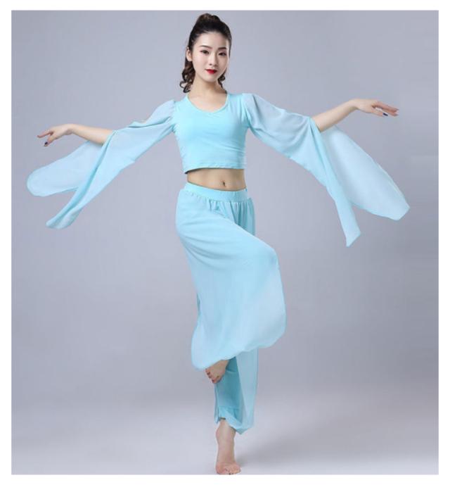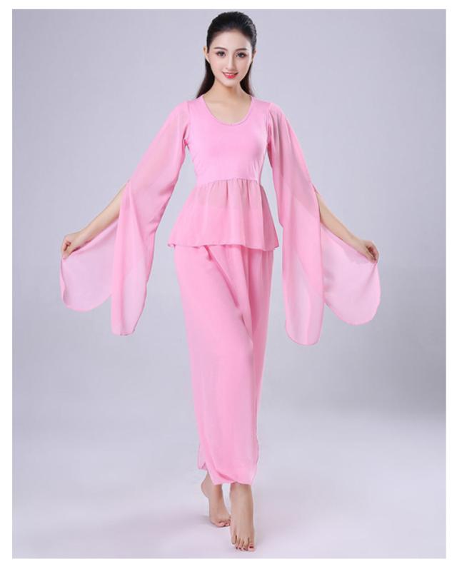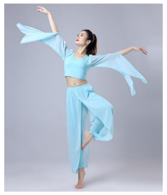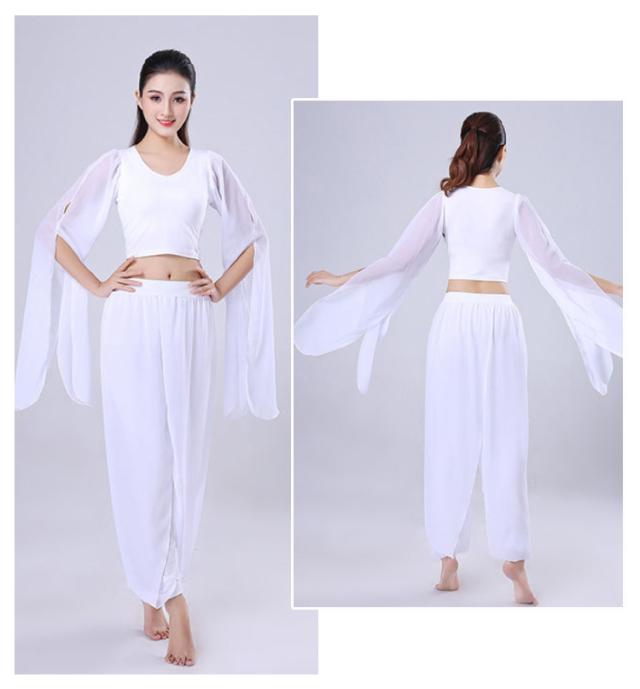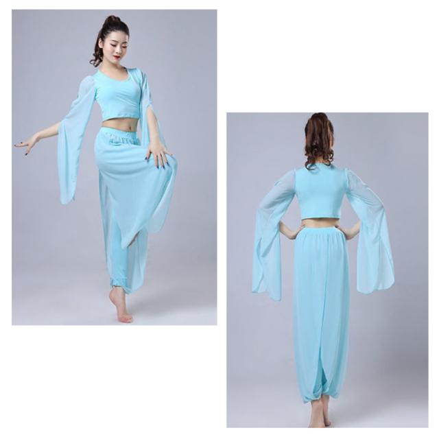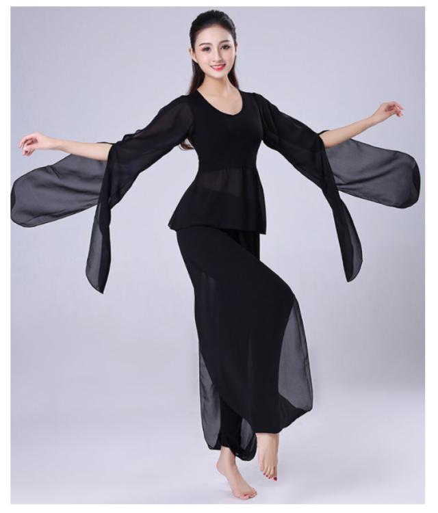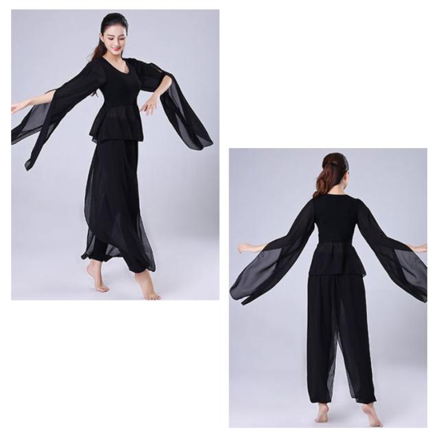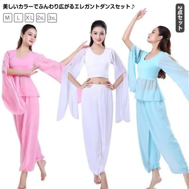 ダンス衣装 2点セット トップス+サルエルパンツ シースルー袖 Vネック トップス ウエストゴム 古典ダンス衣装 モダン ヨガ バレエウエア 美シルエット エレガント 優雅 おしゃれ バレエセット