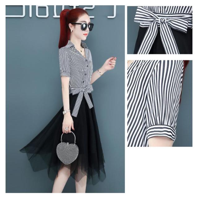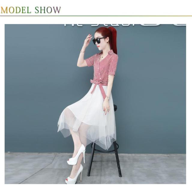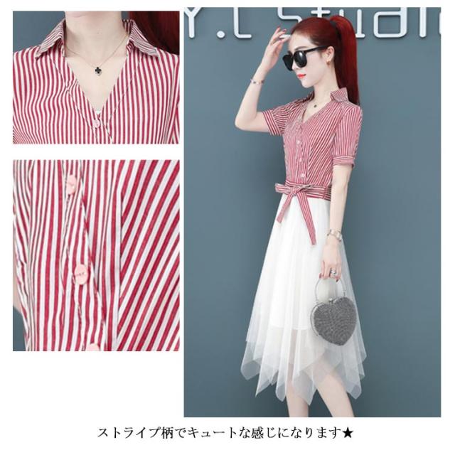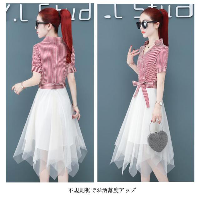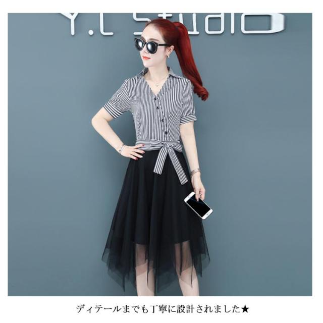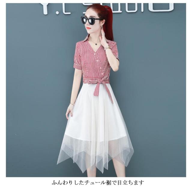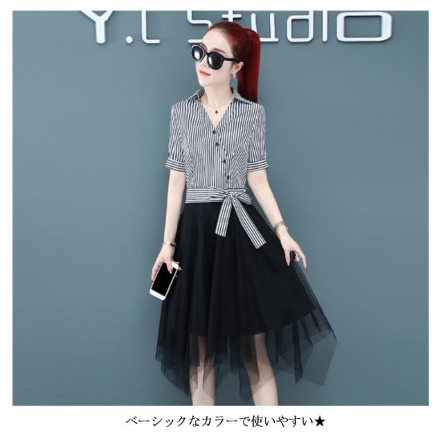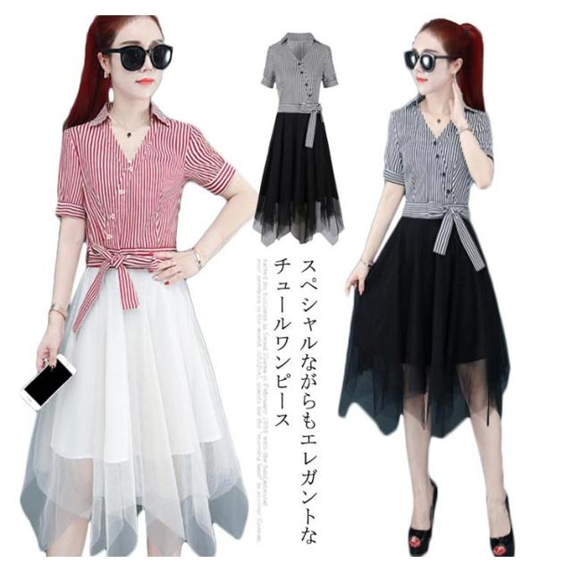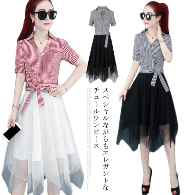ワンピース レディース ロング丈ワンピース ミモレワンピース 切り替え チュール 半袖ワンピース 不規則裾 リボン付き ストライプ柄 スペシャル 着痩せ シック 優雅 お洒落 キレイめ 夏新作