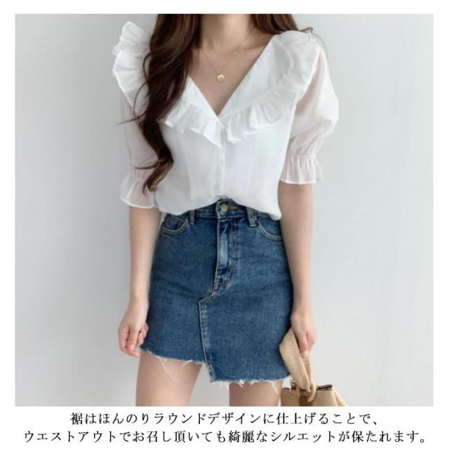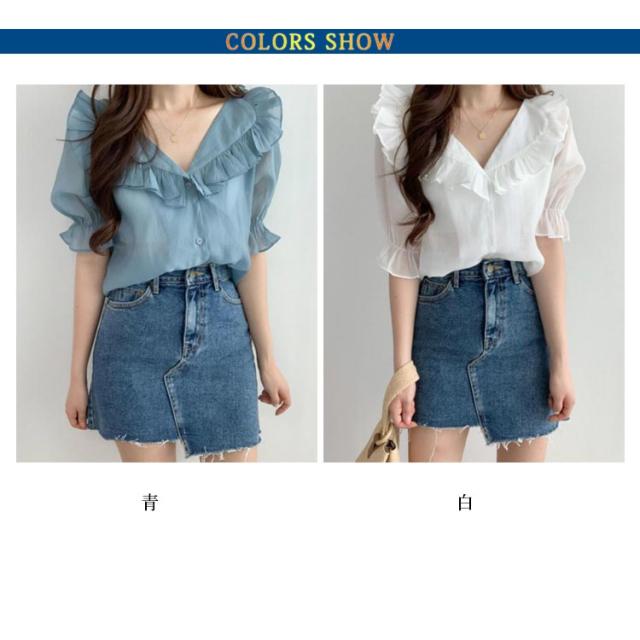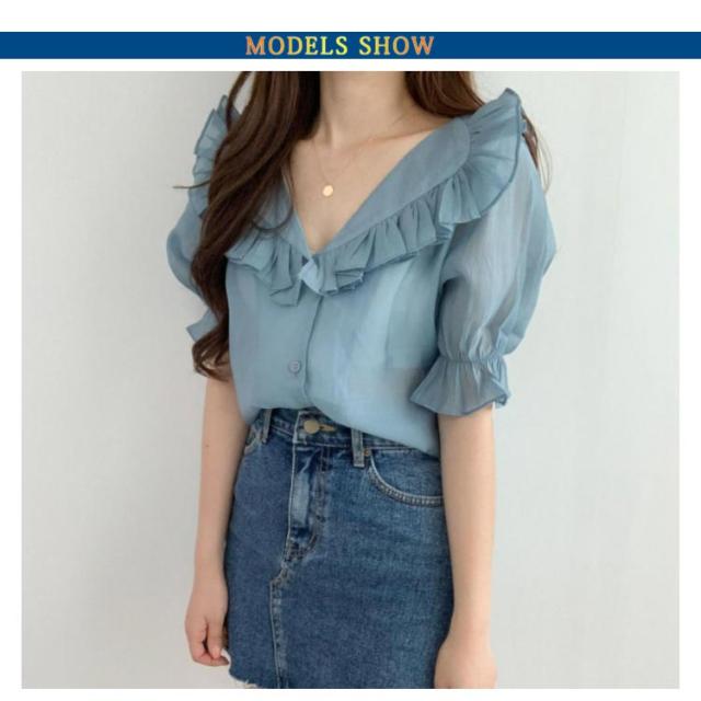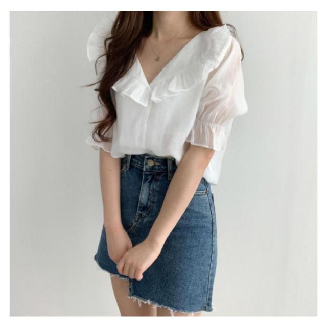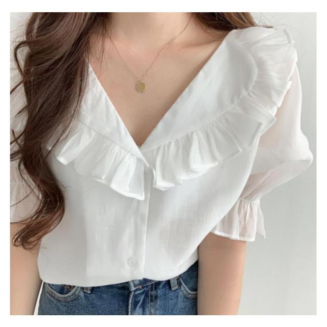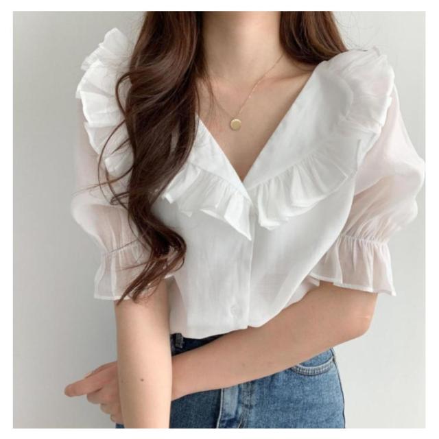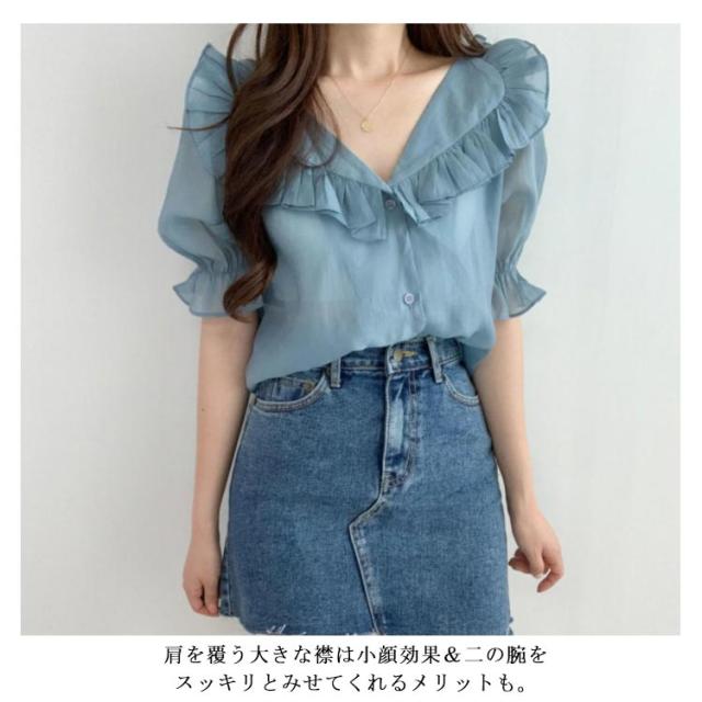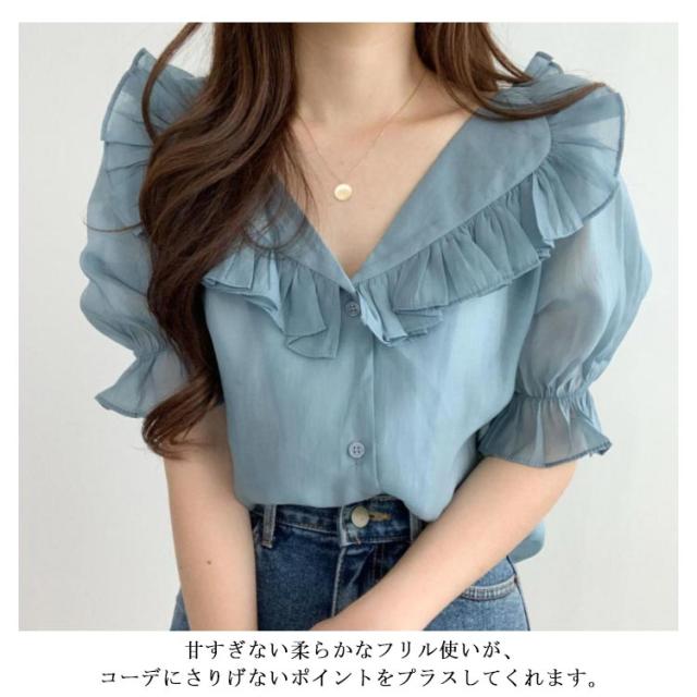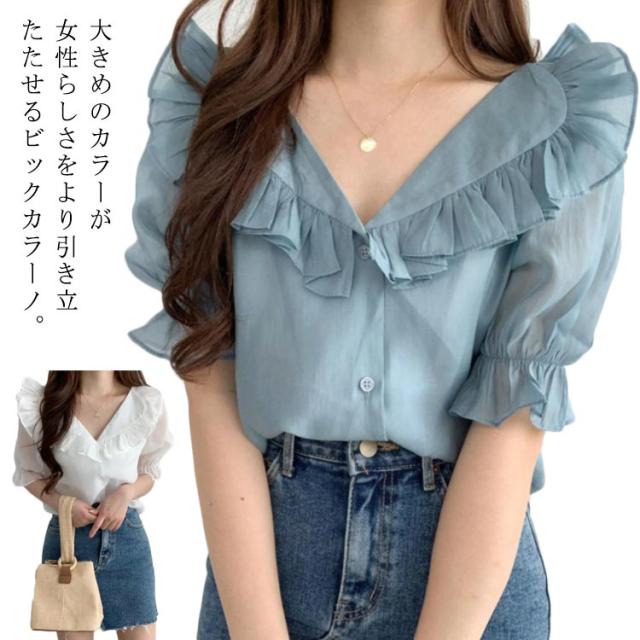 ビックカラー ブラウス シャツ レディース トップス 半袖 パフスリーブ ボリューム袖 フリルカラー フリル 前開き 春 夏 春夏 きれいめ カジュアル ガーリー 女子会 デート お洒落 可愛い 上品 ナチュラル お出かけ 韓国ファッション