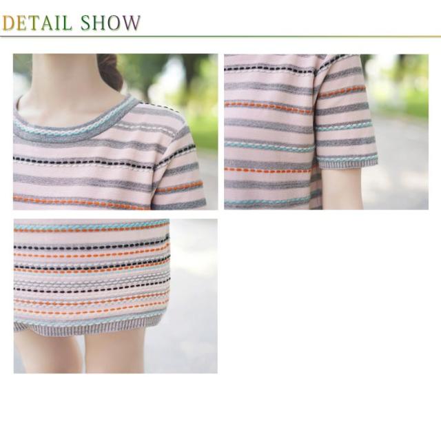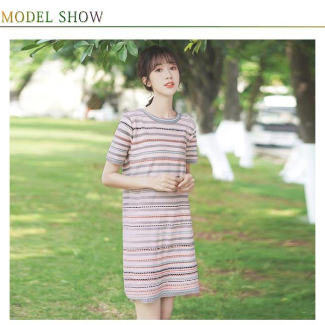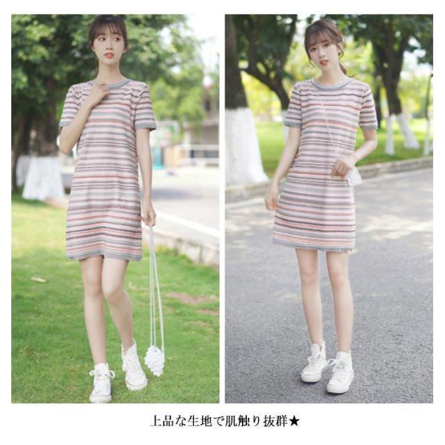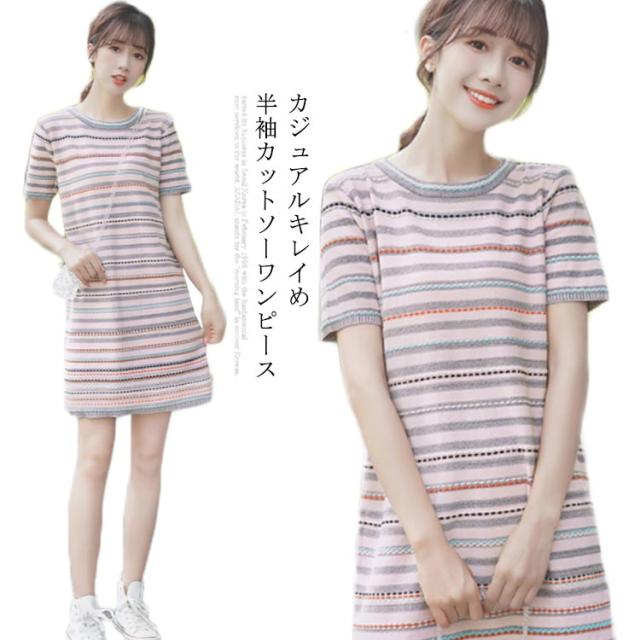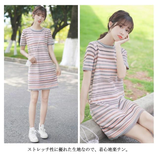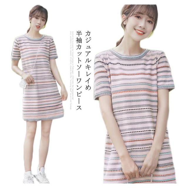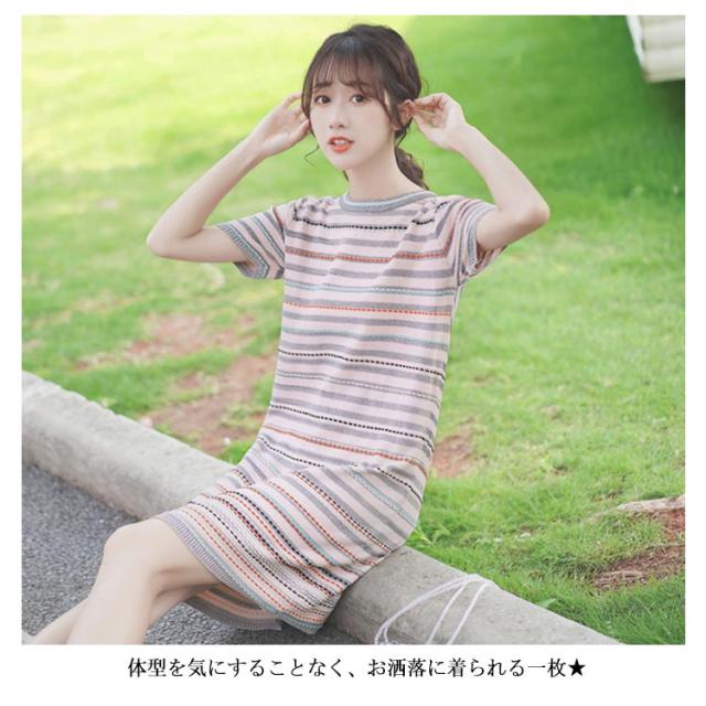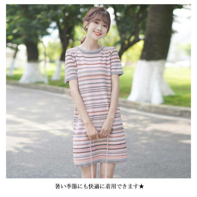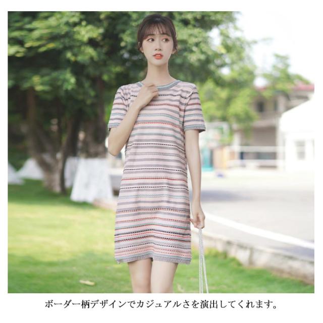 ニットワンピース レディース サマーニット ワンピース ショートワンピース カットソーワンピース ボーダー柄 ショート丈 半袖 ラウンドネック 薄手ニット フレア裾 ストレッチ 伸縮性 タイト お洒落 キレイめ セクシー 夏物 夏新作